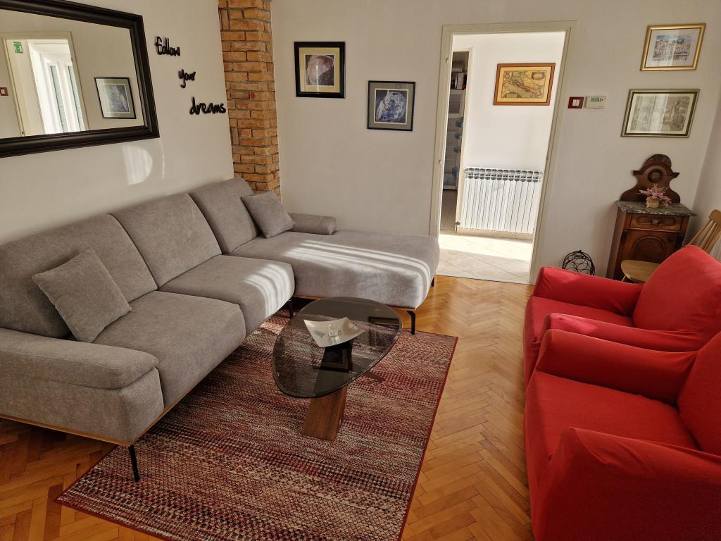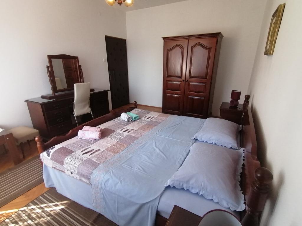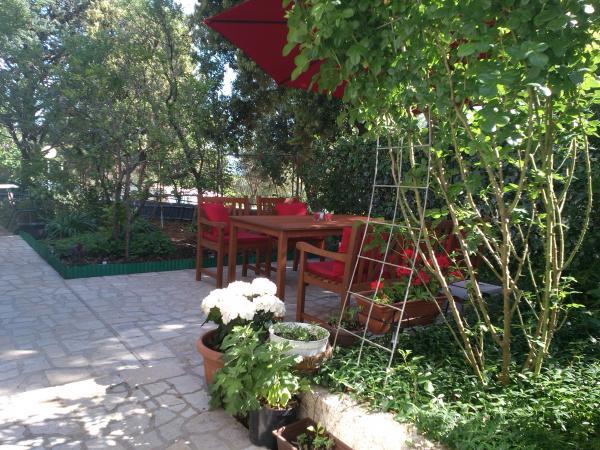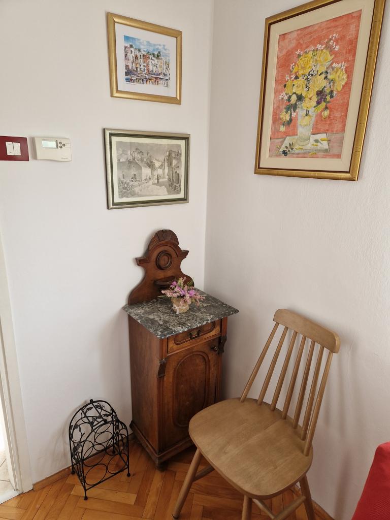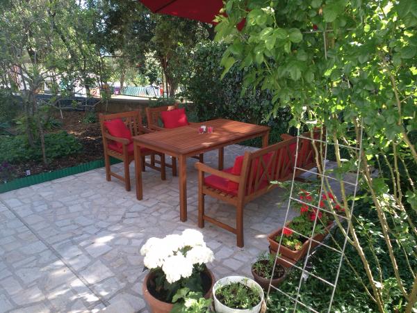 Udobno in lepo opremljeno stanovanje ob morju, obdan z zelenjem. Apartma ima tri spalnice (ena dvoposteljna in ena triposteljna soba), dnevno sobo, kuhinjo, kopalnico in hodnik. Prostorna jugu terasa z mizo in stoli (19 m2) nudi lep pogled na morje, medtem ko vsaka soba in dnevna soba ima dodatno balkon (13 m2 in 3 m2). Stanovanje je zelo lepo opremljeno, v celoti opremljena z vso potrebno opremo. Apartma je klimatiziran, povezan s satelitsko televizijo, internet. Zasebno parkirišče je na dvorišču. Na le 150m od hiše je: morje in plaže (gramozna, žal, beton, ...), potapljaški klub \ Mihurić \, restavracije, teniška igrišča in drugih pomožnih objektov, potrebnih za aktivne počitnice.