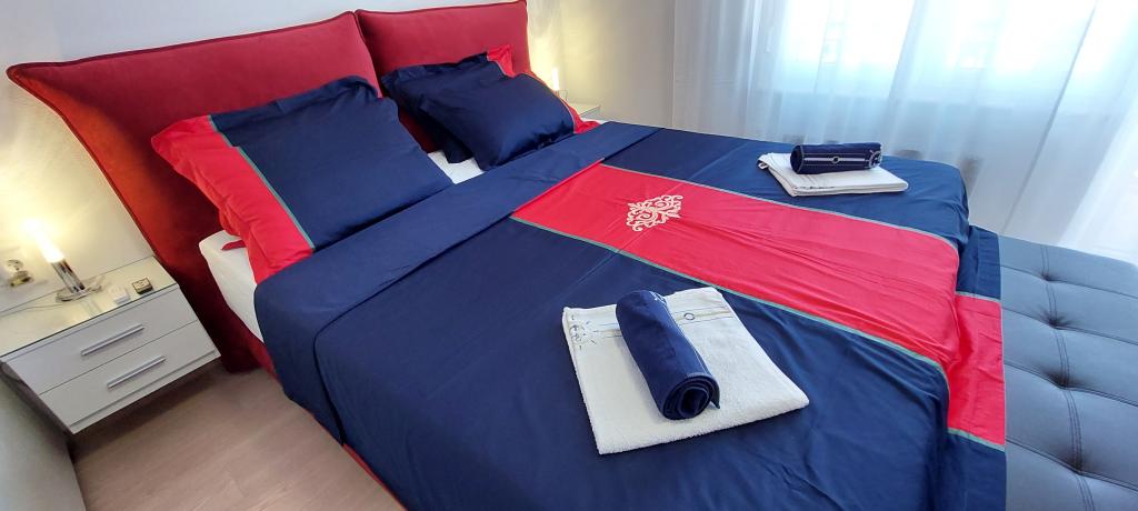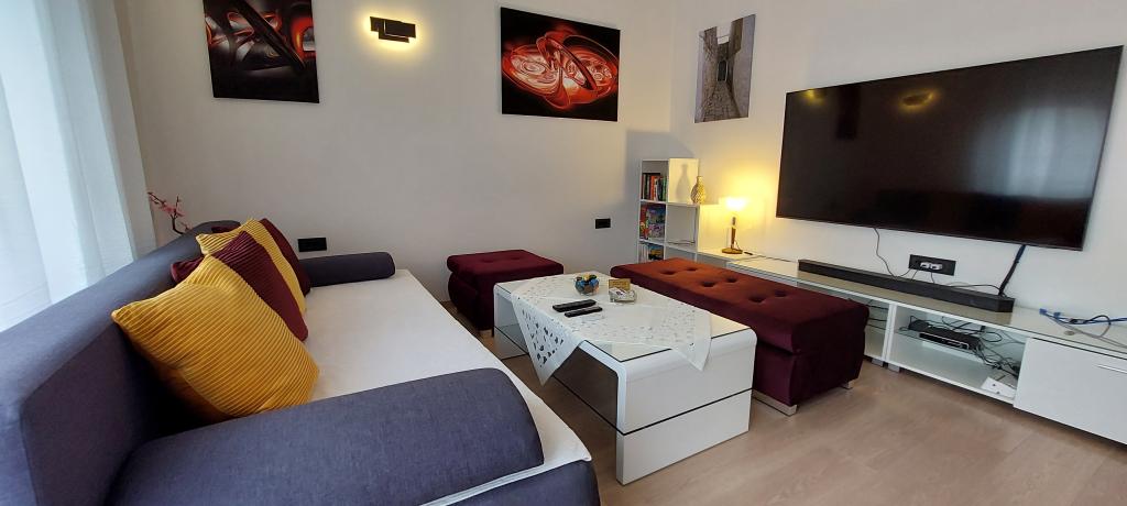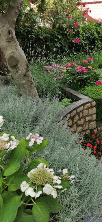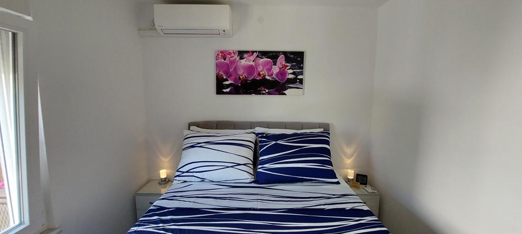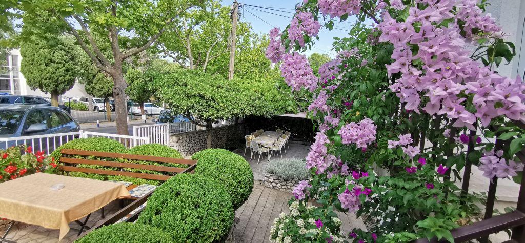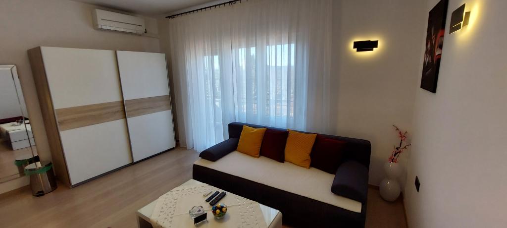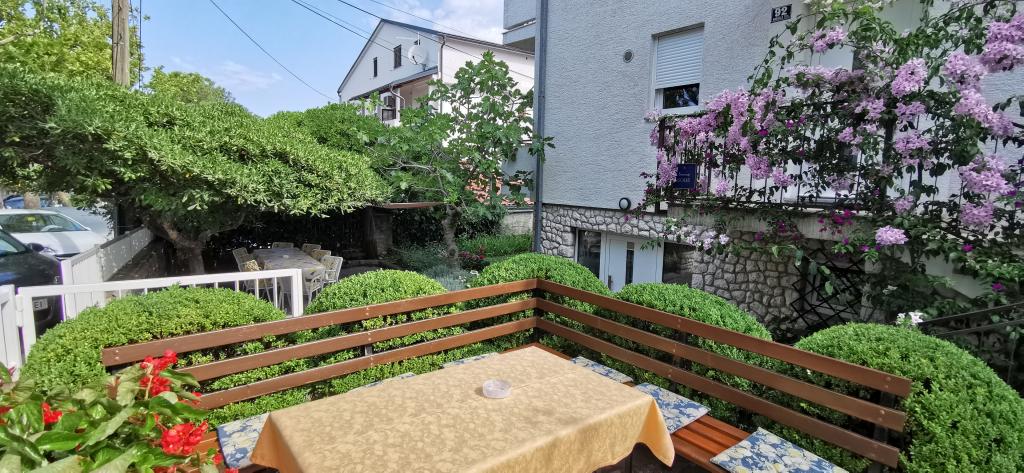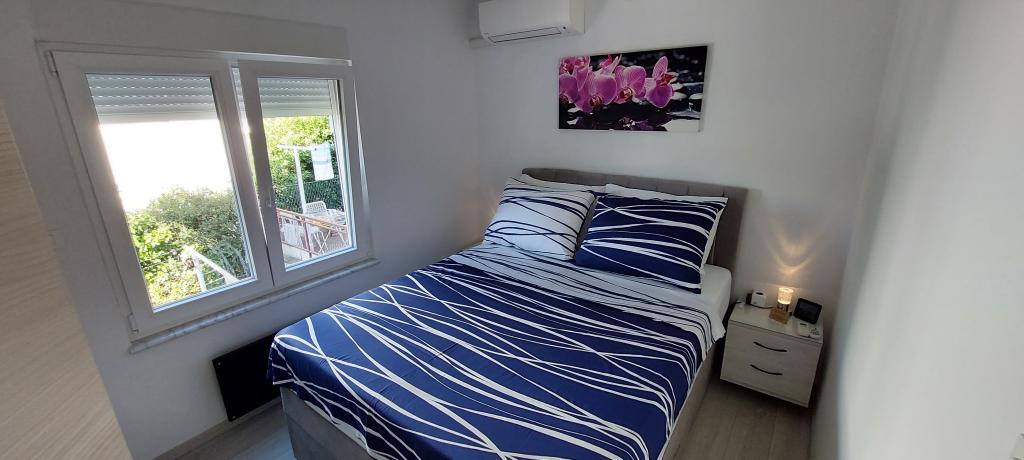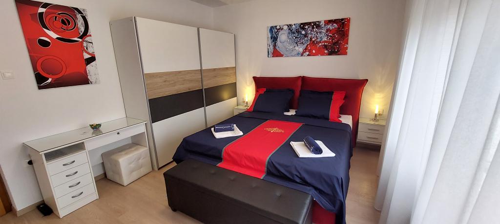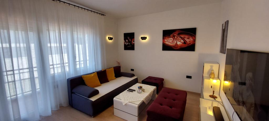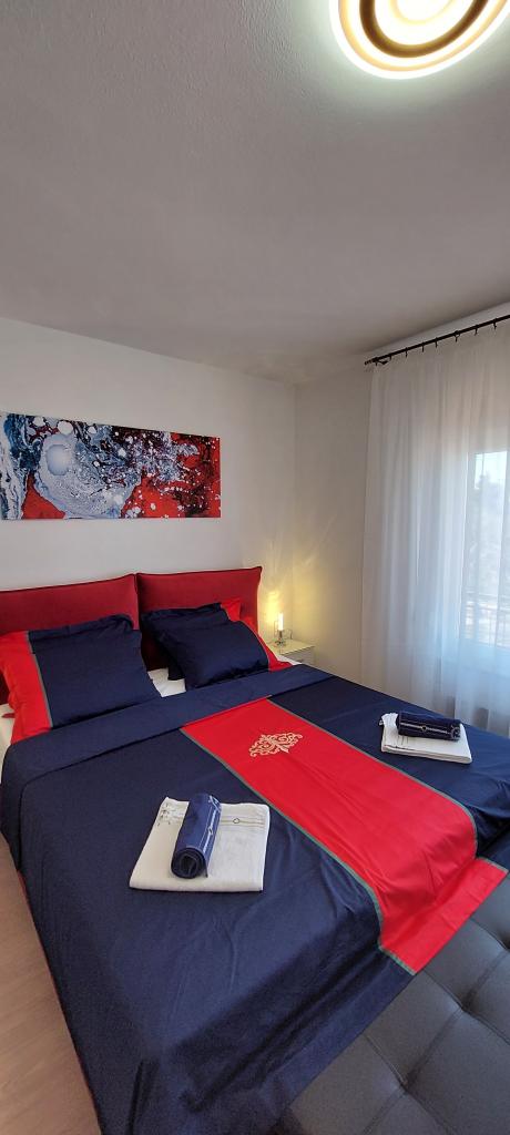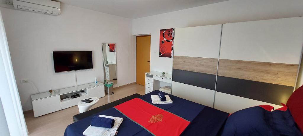 Popolnoma in moderno opremljena dva apartmaja v bližini plaže, ki se nahajata v medetaži (apartma Perunika) in prvem nadstropju (apartma Bougenvilija). Oba apartmaja imata dva balkona in varovano parkirišče pred hišo. Klimatizirani so spalnica z zakonsko posteljo, dnevna soba z raztegljivim kavčem in kuhinja z jedilnico. Internet je brezplačen. Stavba se nahaja 5 minut hoje od centra in manj kot 2 minuti (100 metrov) od plaže.