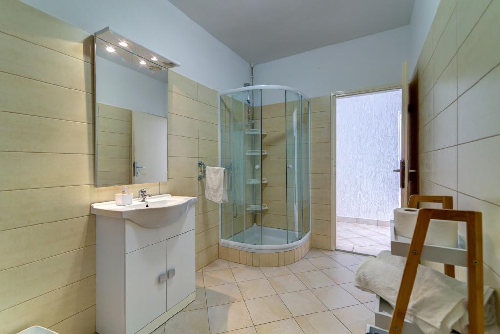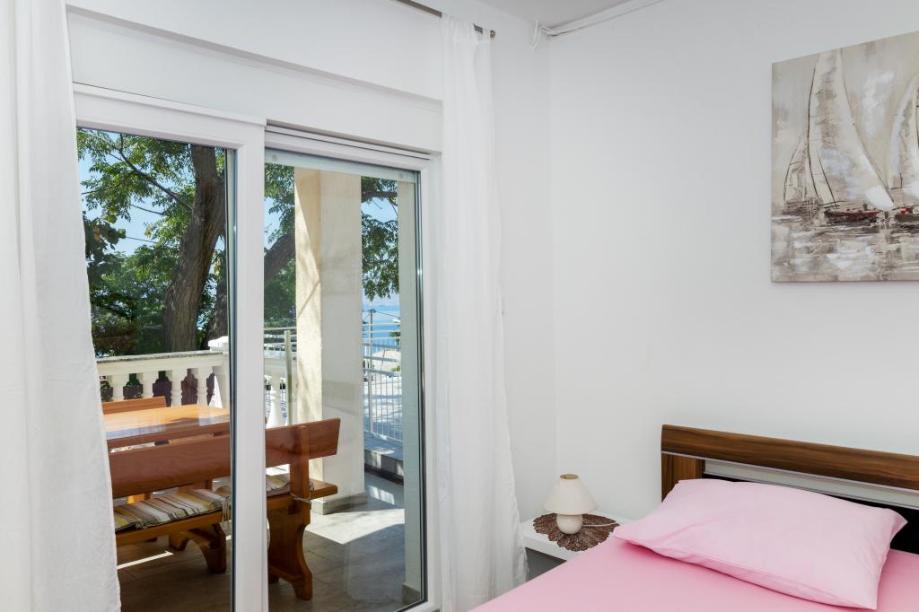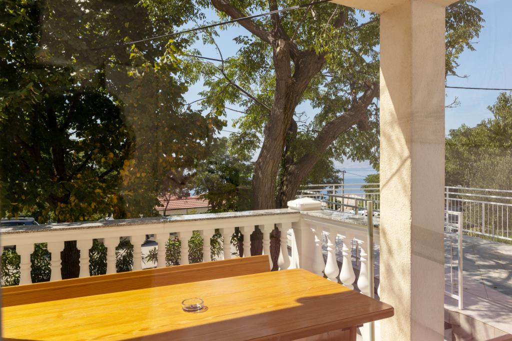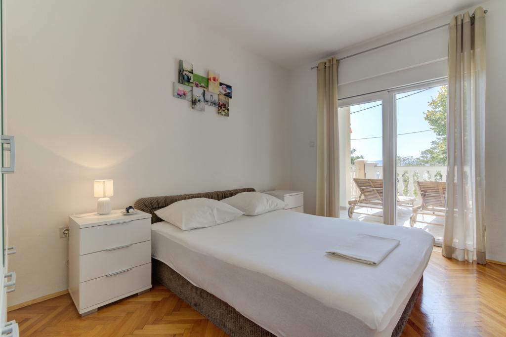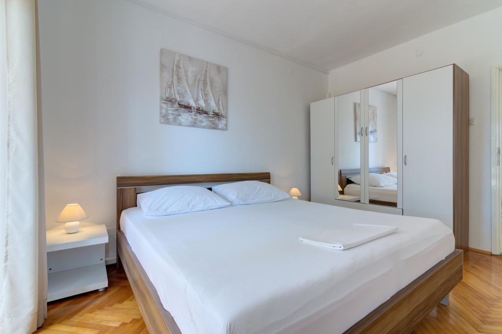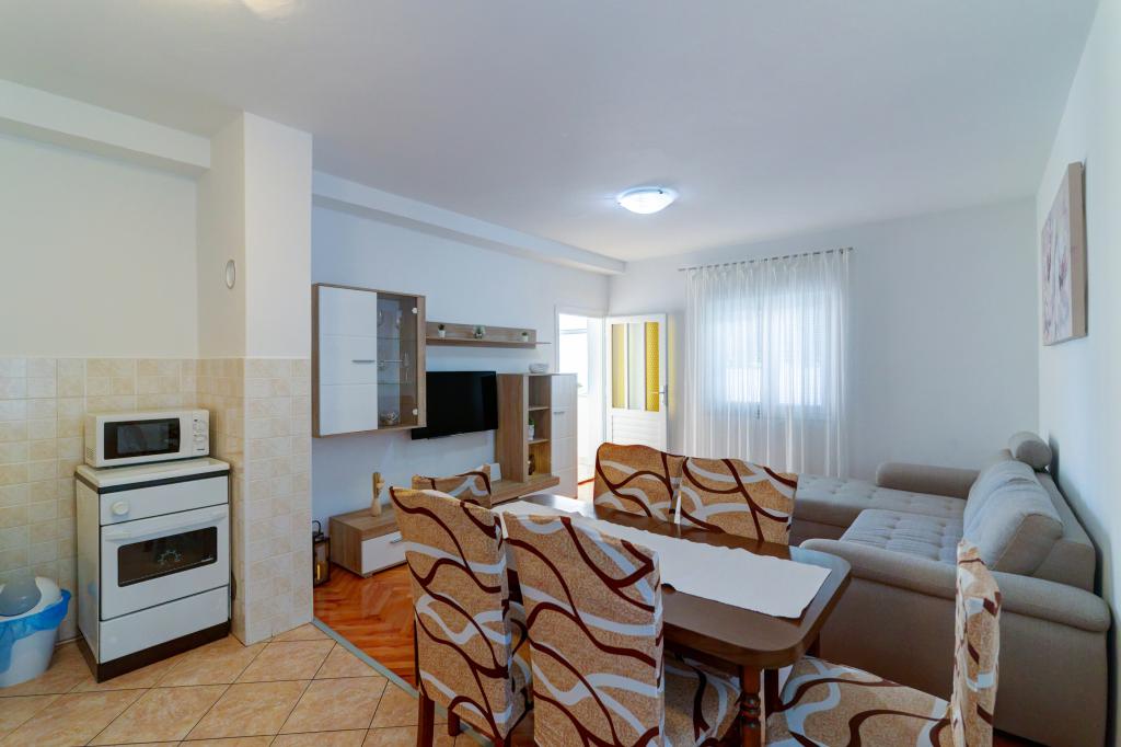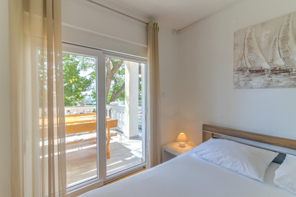 Sodobno opremljen apartma Marta (površine 100 m2) za 7 oseb se nahaja v pritličju družinske hiše, obdan z zelenjem in ima dve veliki sobi z zakonsko posteljo s prekrasnim pogledom na morje, eno prostorno sobo s tremi posteljami, dve kopalnice s tušem in WC, prostorna dnevna soba z dodatnim ležiščem, jedilnica in kuhinja povezana s pokrito paviljonom in žarom. Velika pokrita paviljon (površine 40 m2) z žarom in sedežno garnituro za 8 oseb ter dve terasi (površine 50 m2) s pogledom na morje opremljena s sedežno garnituro in dvema ležalnikoma sta namenjena samo gostom tega apartmaja. Pred apartmajem je urejen vrt z dvema velikima drevesoma, travo in rožami ter tremi brezplačnimi parkirnimi mesti. Objekt se nahaja v mirnem delu mesta, 10 minut hoje do prve plaže in centra mesta.