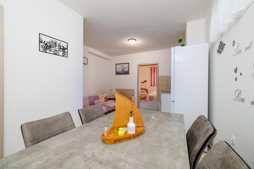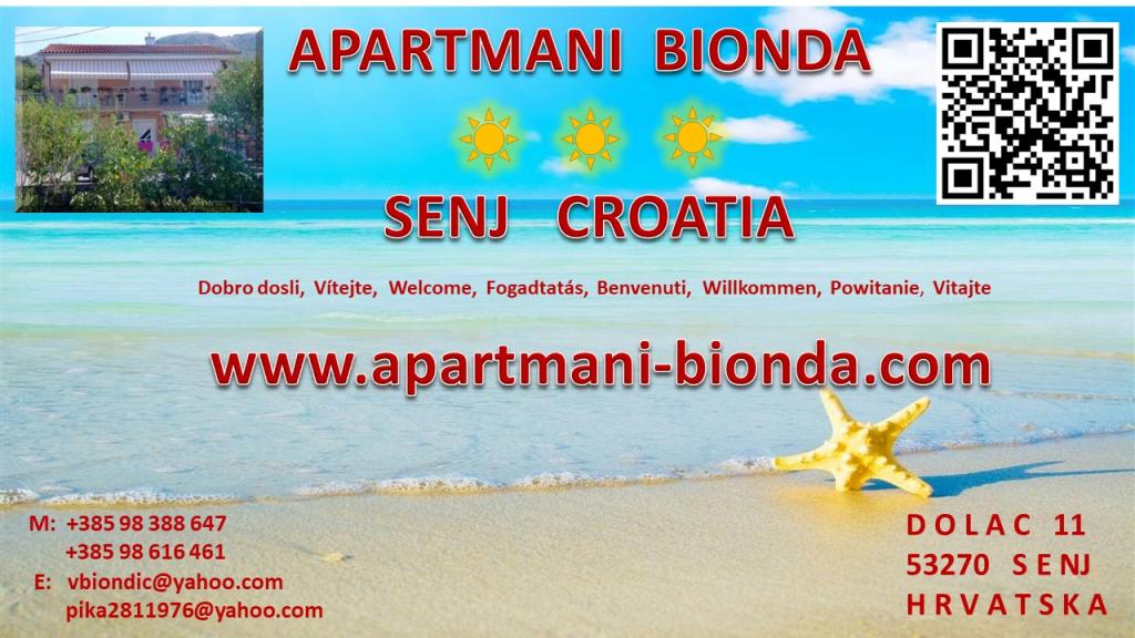 Apartmaji BIONDA so novozgrajeni, popolnoma in moderno opremljeni v mirnem delu mesta Senj. Nahajajo se v ločeni stavbi, tj. samostojni hiši. Vsak apartma ima ločen vhod, svoj balkon ali teraso, na voljo so vam miza in stoli za balkon, SAT-TV, brezžični internet, WI-FI, mini bar, klimatska naprava, električne grelne plošče in zagotovljeno parkirišče za vaš avto. V neposredni bližini mesta Senj se nahajajo Narodni park Plitviška jezera, naravni parki Velebit, Zavratnica ter otoki Goli, Grgur, Prvić, Krk in Rab. Apartmaji se oddajajo vse leto.