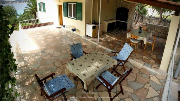 STANOVANJE V HIŠI NA OBALI, S FANTASTIČNIM RAZGLEDOM, DALEČ OD GNEČE! Apartma Merara se nahaja tik ob morski obali, v zalivu Stari Trogir med Marino in Rogoznico, Trogirjem in Primoštenom. Odmaknjena je od naselja, kar zagotavlja mir in uživanje v naravnem okolju borovcev. Dostop je možen z avtom in čolnom. Na voljo je parkirišče za dva avtomobila in privez za čoln ter dodatno sidrišče v bližini hiše. V dveh spalnicah in dnevni sobi lahko biva do 6 gostov. Kopalnica z WC, kuhinja z jedilnico, kamin z žarom na veliki terasi z odličnim razgledom. Vrt z mediteranskimi rastlinami je edina stvar, ki loči hišo od morja. Čeprav je izolirano, je zahvaljujoč sistemu sončne energije in generatorju na voljo vse udobje, ki ste ga vajeni: topla voda, televizija / SAT, elektrika, WiFi itd.