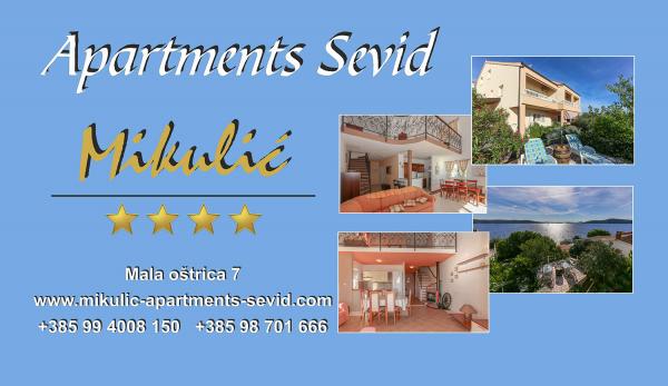 Sevid na moru, dovolj skrit pred mestno gnečo, a dovolj blizu, da se vidi vse. Sončen in skrit kotiček neokrnjene narave, idealen za pravi mediteranski oddih. Čeprav je majhen, ima Sevid vse, kar potrebujete; trgovine, restavracije, kavarne, čisto morje in lepe plaže. Idealno za družine z otroki v vročih poletnih dneh, pa tudi pozimi. Apartmaji Mikulić se nahajajo na vzhodni strani polotoka Sevid, 20 metrov od morja, s čudovitim pogledom na morje, okoliške otoke in vrt, poln zelenja. Apartmaji imajo 4 zvezdice in jih lahko imenujemo prava luksuzna počitniška vila. Gostom je na voljo vrt z žarom, mediteranski vrt, parkirišče, plaža s pristaniščem za čolne. Peščena plaža je zelo blizu hiše. nudimo možnost najema čolna z apartmajem (gliser ali čoln). nudimo tudi najem pedalin, vodnih skuterjev, sup desk, koles. Vabljeni!!!