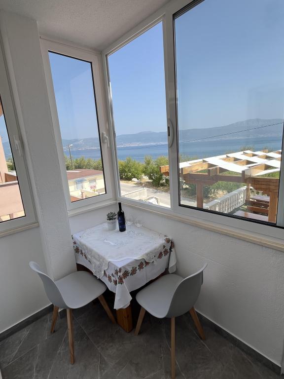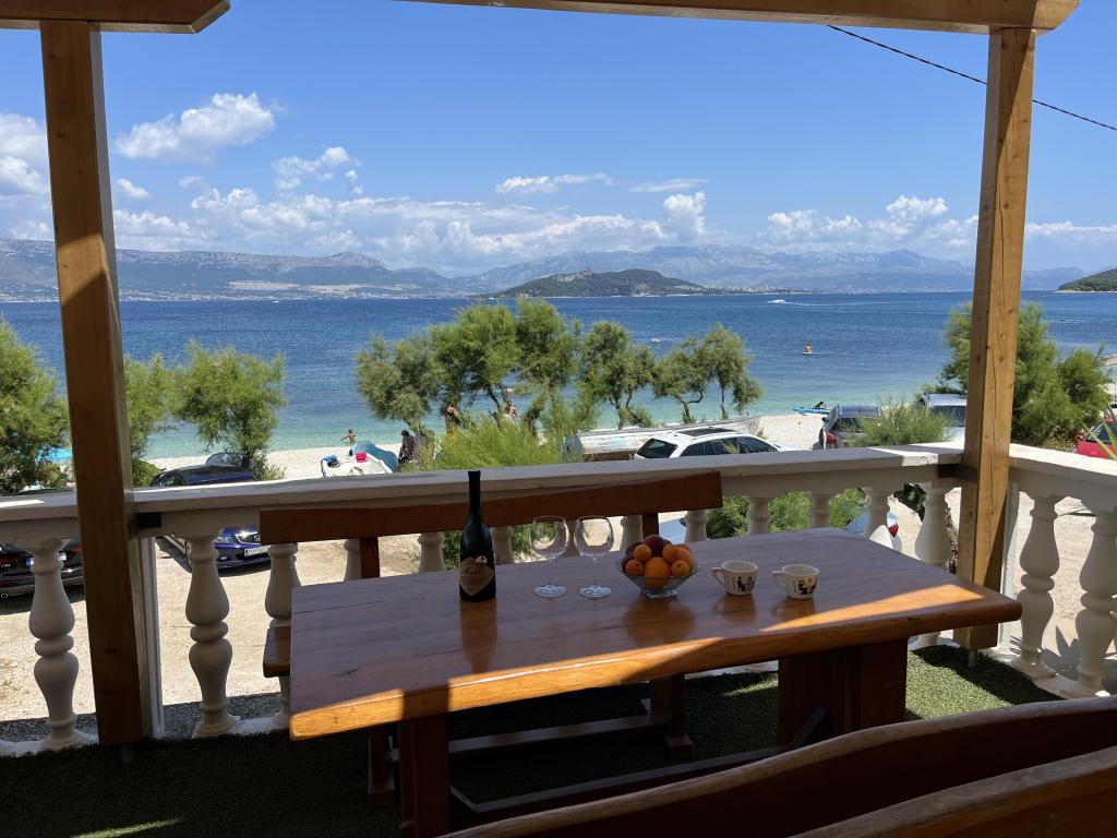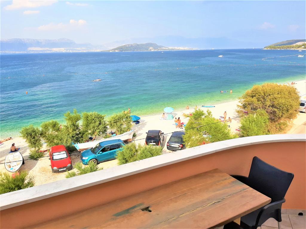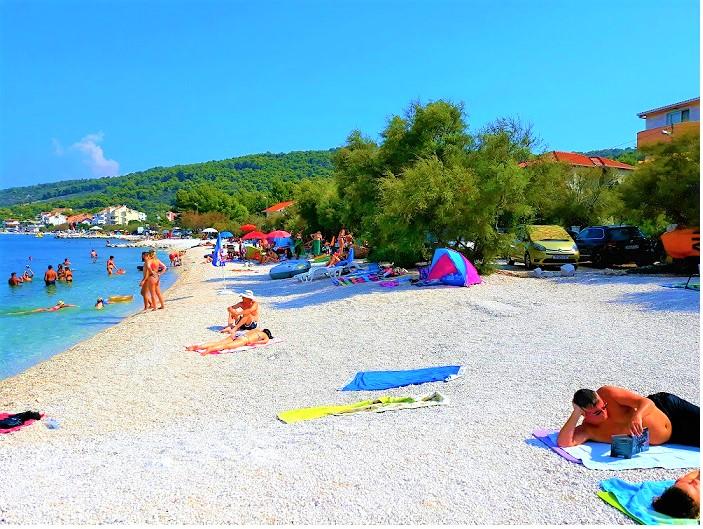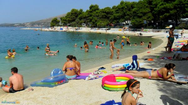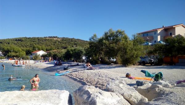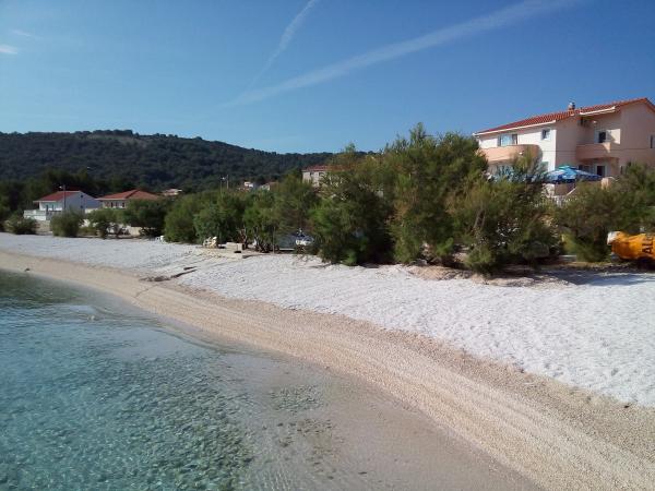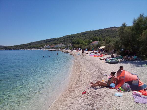 Apartmaji se nahajajo v neposredni bližini plaže, le 10 metrov stran, s čudovitim pogledom na morje. Zelo čisti, opremljeni z vsem potrebnim. Lastnica je zelo prijazna, ustrežljiva in skrbi za svoje goste. Urejena plaža z drobnim kamenčkom in zunanjim tušem. Kraj je na mirnem območju. Vendar je blizu barov, restavracij in vodnega igrišča. Blizu izletov v Trogir in Split. Do tja lahko pridete z javnim prevozom in trajektom.