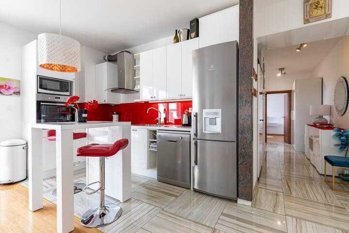 Bačvice, 2-sobno stanovanje, 3 klimatske naprave, terasa, parkirno mesto v garaži, dvigalo, 2 minuti do plaže, 10 minut hoje do centra. To čudovito dvosobno stanovanje v središču Splita ima 70 m2, teraso, masažno kad v kopalnici, klimatsko napravo v vsaki sobi. Morje je oddaljeno 50 m. Ta edinstvena namestitev se nahaja v bližini vseh zanimivosti, kar olajša načrtovanje vašega obiska. Center mesta in stara Dioklecijanova palača sta oddaljena 15 minut hoje. Imamo lastno parkirno mesto v garaži, do stanovanja pa se lahko pripeljete z dvigalom. Stanovanje se nahaja v 3. nadstropju nove stavbe. Supermarket -300 m, Restavracije -100 m, Caffe bar -50 m, Izleti z ladjo -500 m, Trajektno pristanišče -200 m, Avtobusna postaja -200 m Ključi stanovanja in garaže so v sefu za ključe v pritličju stavbe. Kodo za sef boste prejeli po e-pošti po opravljeni rezervaciji.