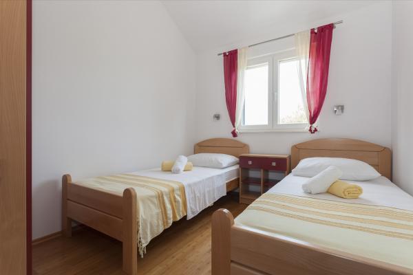 Sodobno in moderno stanovanje v prvem nadstropju družinske hiše v majhnem in mirnem kraju Srima. Druga vrsta do morja, 140 m od čudovite prodnate plaže (Modra zastava). Stanovanje ima 75 m2 (WC in kopalnica, dve spalnici, kuhinja, jedilnica in dnevna soba) galerija s kopalnico in WC-jem ter delno pokrito teraso 14 m2. Predvideno število oseb je 6 (soba 4, galerija 2) Popolnoma urejeno s kvalitetnim pohištvom in opremo (satelitska TV, internet, LCD TV, radio, pomivalni in pralni stroj, sušilniki za lase, mikrovalovna pečica, bojler, 2 klimatski napravi) bo zadovoljila gostje, ki želijo več. Zaradi svoje velikosti je idealen za dve družini. Srima se nahaja v bližini mesta Vodice, znanega letovišča z vsemi potrebnimi objekti za počitek in rekreacijo ter dveh narodnih parkov: NP Kornati in NP Krka.