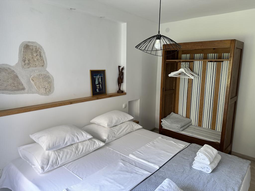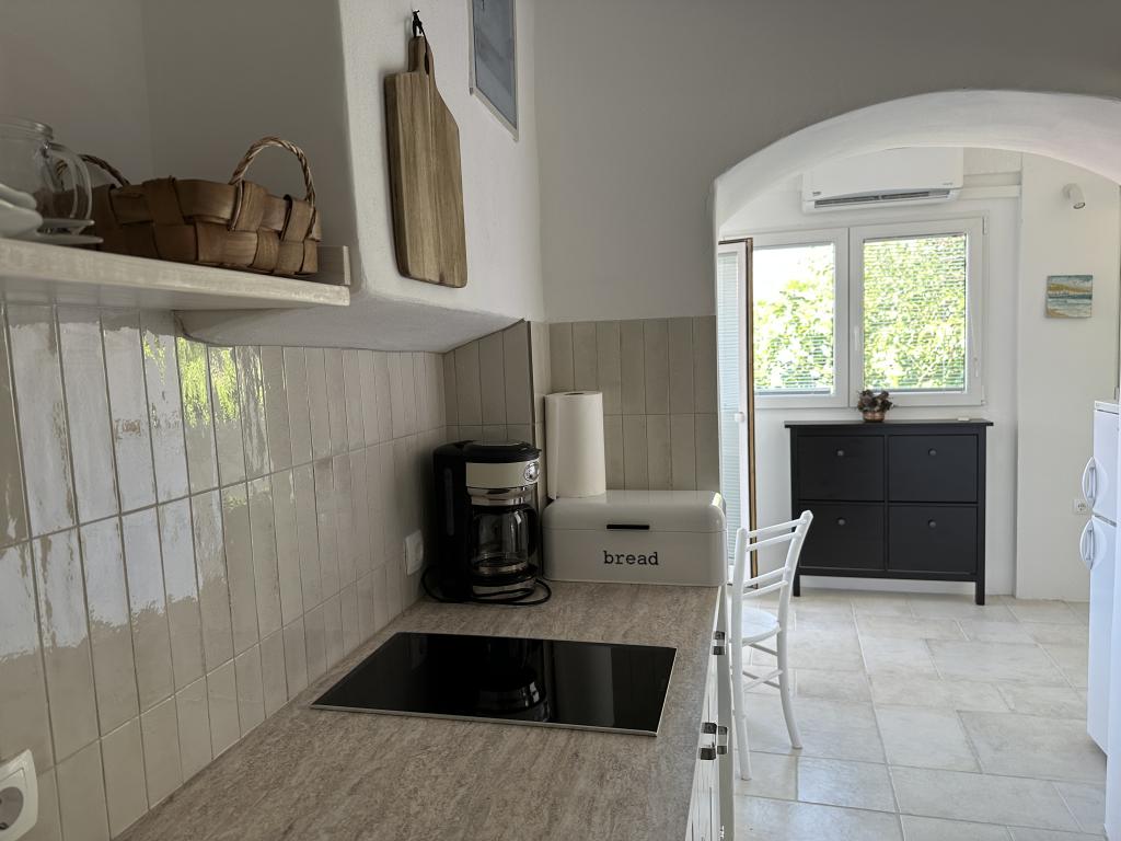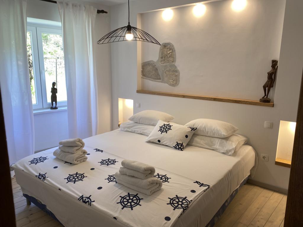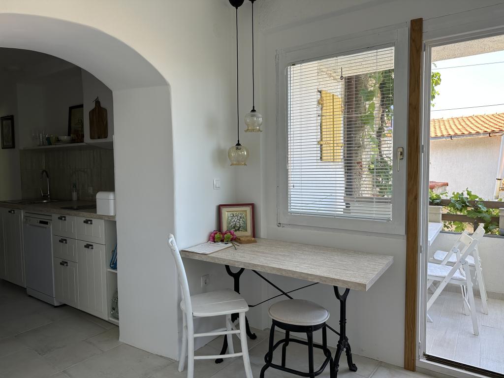 Hiša se nahaja 50 metrov od peščene in prodnate plaže. Na plaži ni gneče, morje pa je kristalno čisto. V hiši sta dva apartmaja. Stanovanje je na novo prenovljeno in v celoti opremljeno. Apartma ima dve spalnici z zakonsko posteljo, popolnoma opremljeno kuhinjo, kopalnico in balkon s pogledom na morje. Zagotovljeno je eno parkirno mesto 100m od hiše.