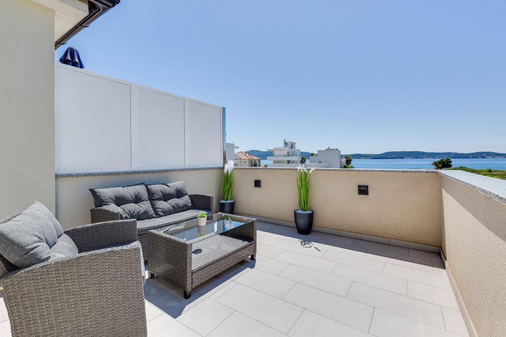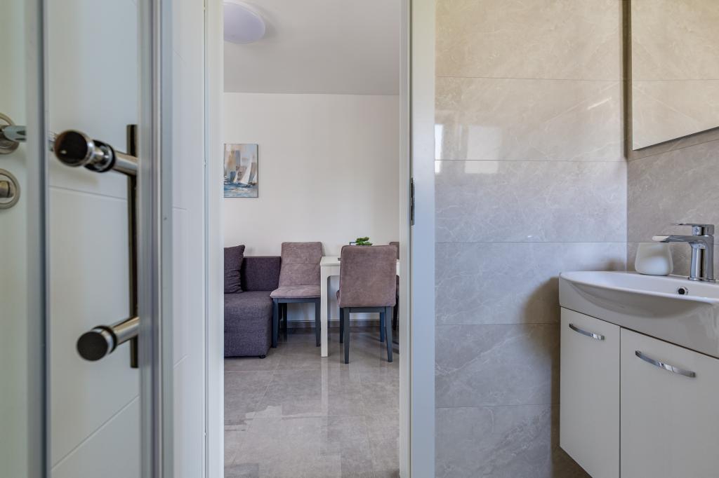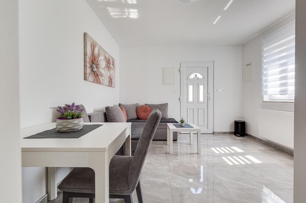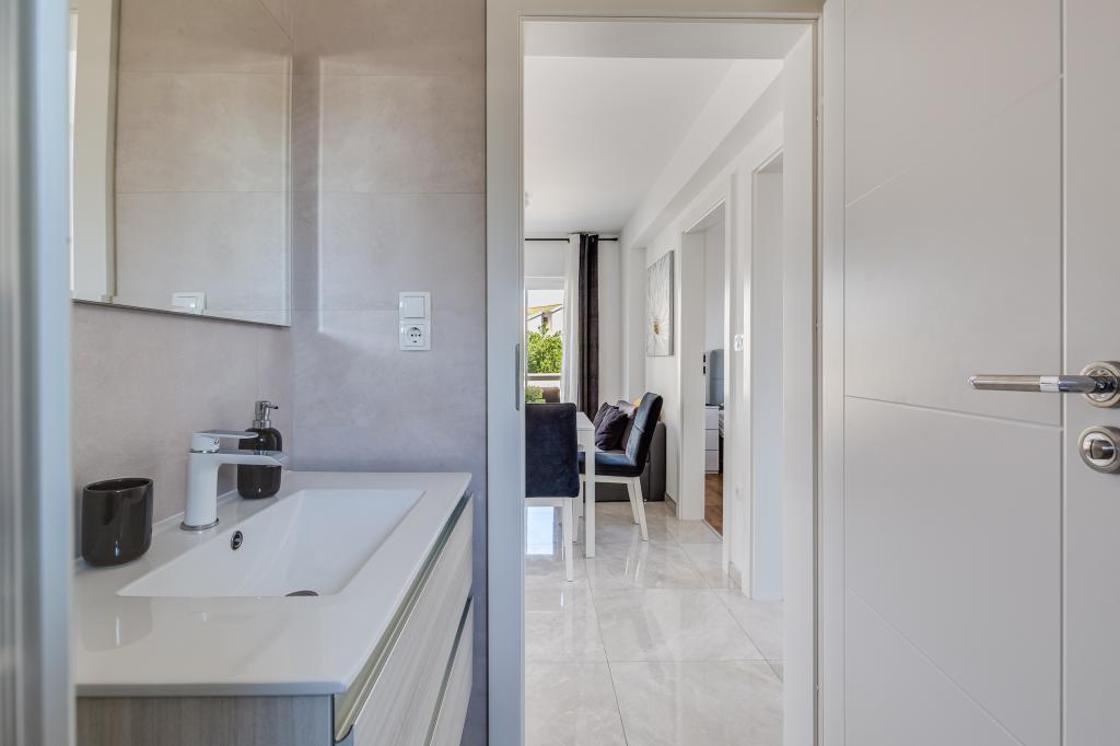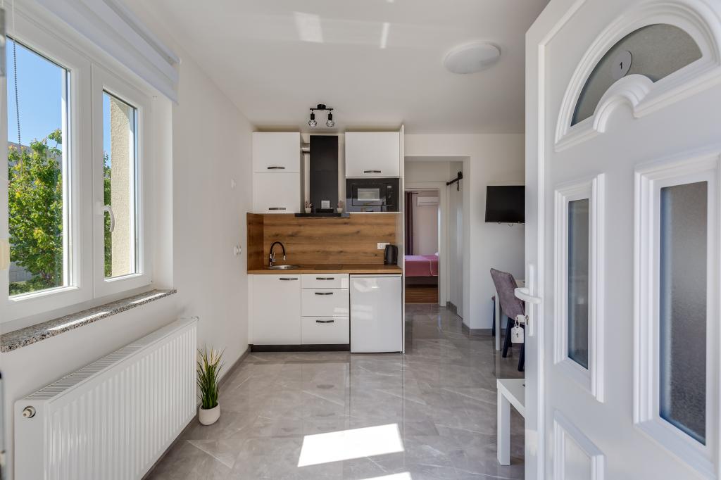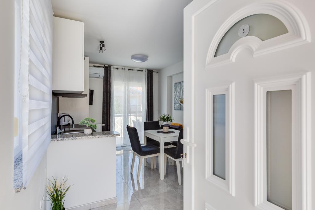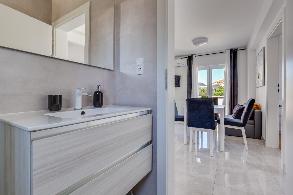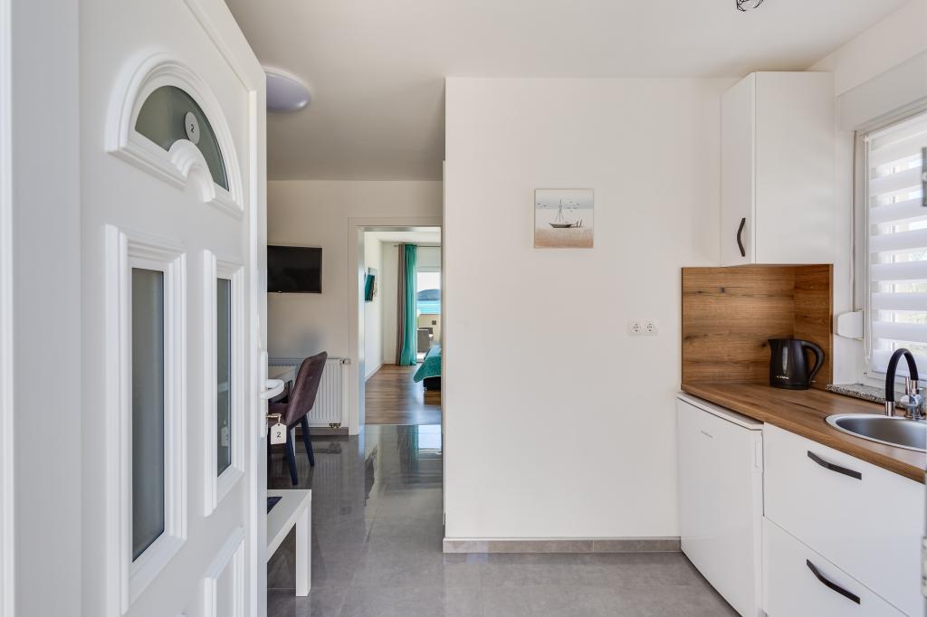Popolnoma in moderno opremljeni apartmaji v mirnem predelu Sukošana. Nahajajo se 100 metrov od morja in kamnite plaže. Nepremičnina se nahaja 400 metrov od peščene plaže Djećji raj in 500 metrov od centra mesta in drugih objektov. Gostje se lahko sprostijo in uživajo v tej udobni namestitvi in pogledu na morje.Na dvorišču je skupni žar