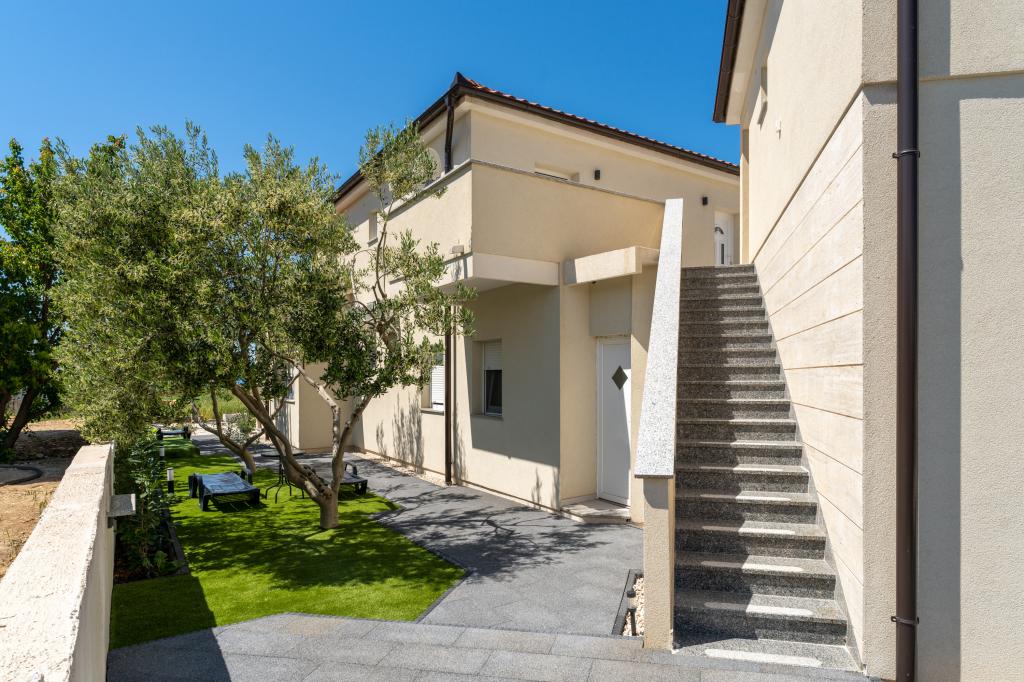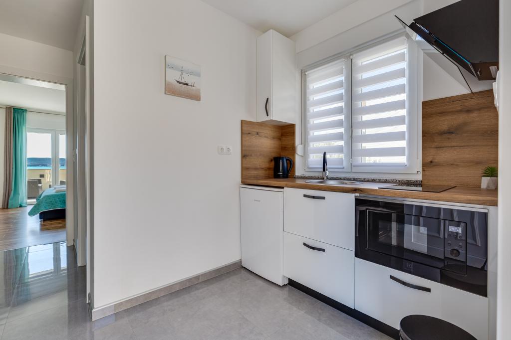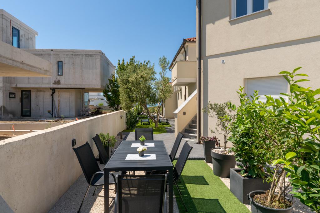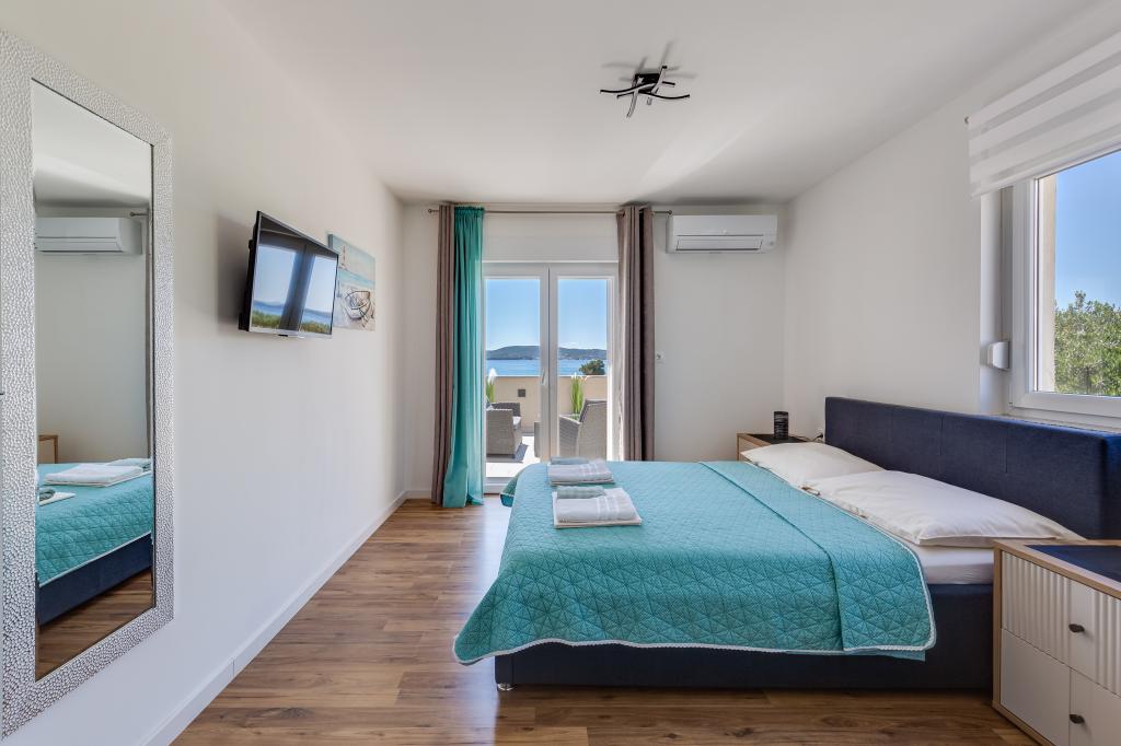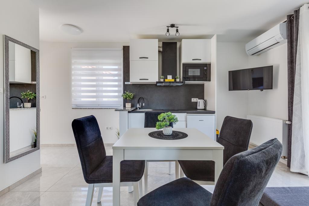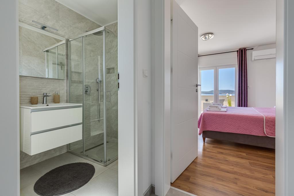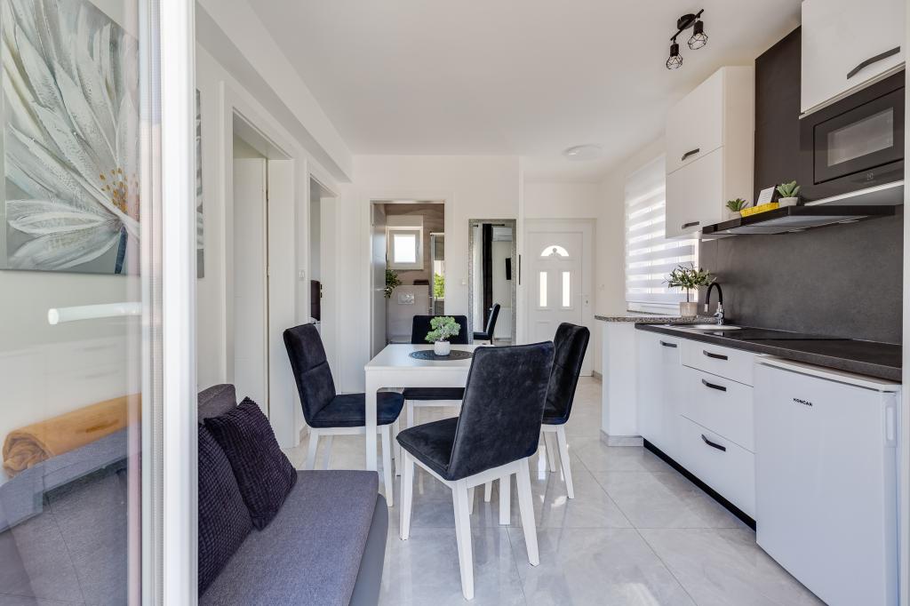 Popolnoma in moderno opremljeni apartmaji v mirnem predelu Sukošana. Nahajajo se 100 metrov od morja in kamnite plaže. Nepremičnina se nahaja 400 metrov od peščene plaže Djećji raj in 500 metrov od centra mesta in drugih objektov. Gostje se lahko sprostijo in uživajo v tej udobni namestitvi in pogledu na morje.Na dvorišču je skupni žar