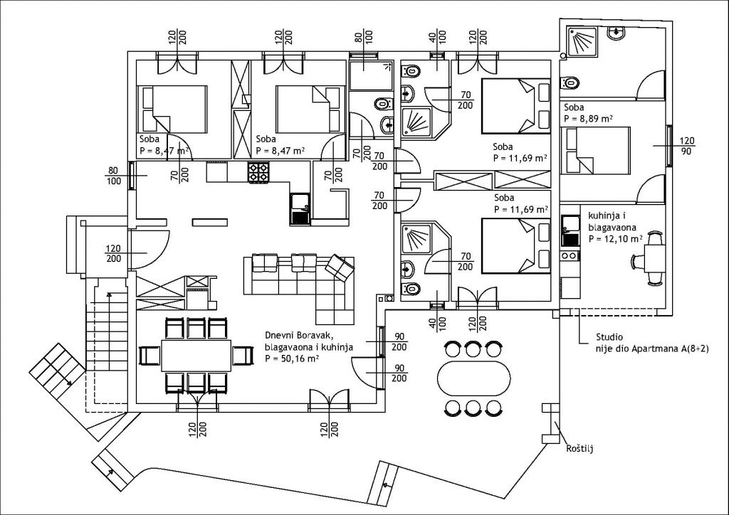 Dobrodošli v Apartmajih Pavlović – vaši oazi miru v srcu Supetra! Apartmaji Pavlović se nahajajo v enem najbolj privlačnih in hkrati mirnih delov Supetra na otoku Braču in so idealna izbira za popoln in sproščujoč oddih. Uživajte v bližini morja, različnih plaž in mestne promenade – vse je na dosegu roke! Naša hiša se nahaja v prvi vrsti družinskih hiš, tik za hotelskimi kompleksi, kar zagotavlja mir in zasebnost, hkrati pa tudi neposredno bližino vseh pomembnih vsebin. Najbližja plaža je oddaljena le 250 metrov, trgovina 50 metrov, do slikovite promenade pa se lahko sprehodite v petih minutah. Objekt ima skupno osem moderno opremljenih namestitvenih enot različnih kapacitet: 4 studio apartmaji za dve osebi 3 apartmaji za štiri osebe 1 velik apartma v pritličju, ki lahko sprejme do deset oseb – idealno za večje družine ali skupine prijateljev Vsi apartmaji so klimatizirani in popolnoma opremljeni – vključno s kuhinjo, jedilnico, kopalnico, zasebno teraso,