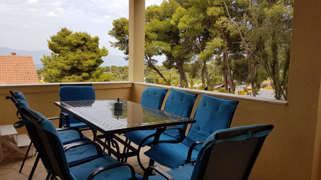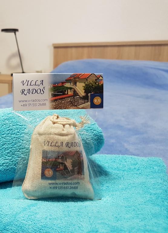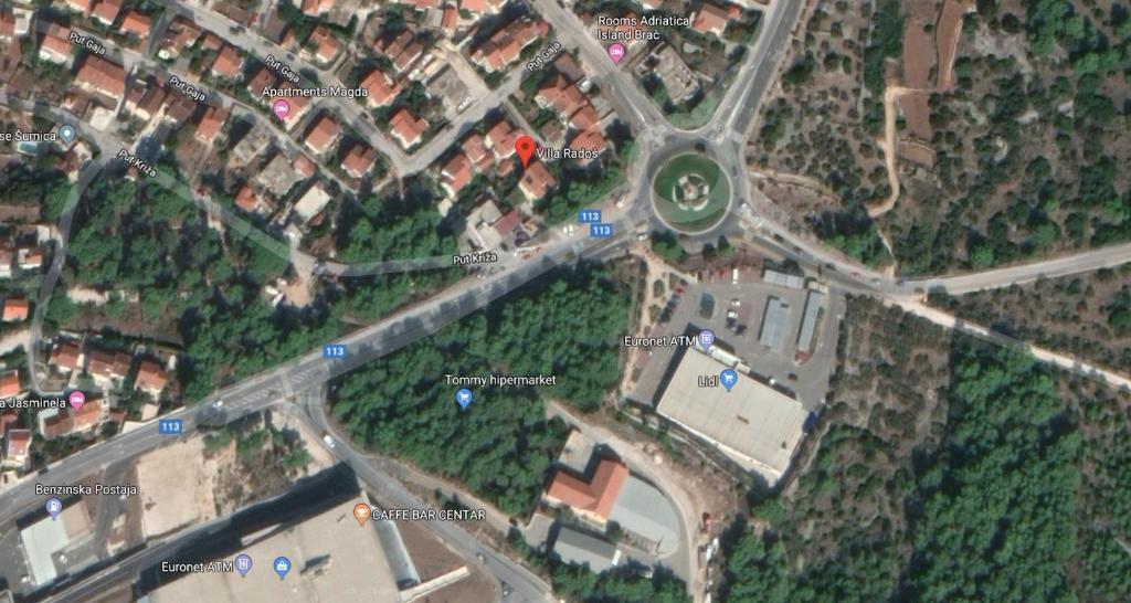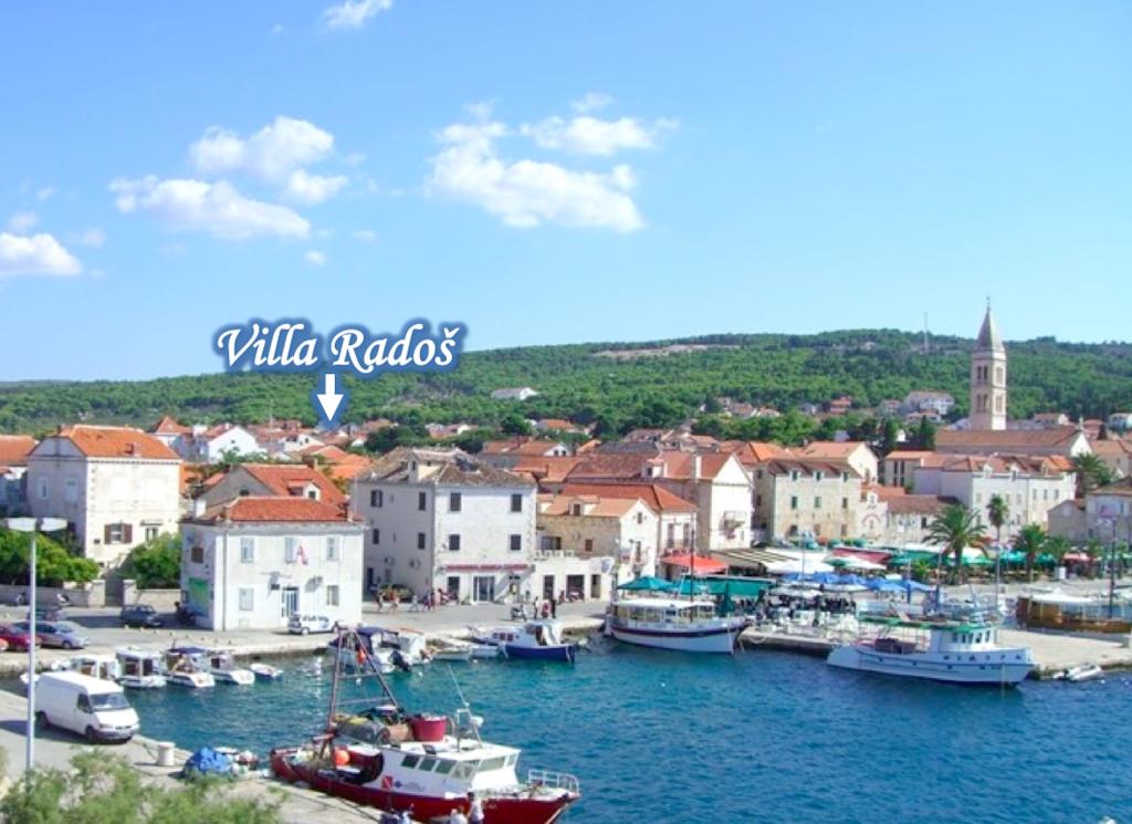 VILLA RADOŠ, 4 zvezdice, se nahaja v vzhodnem delu Supetra nasproti zelenega pasu. Od centra in plaže je oddaljen le nekaj minut hoje. Ima skupno 4 apartmaje: 2-nadstropna 4-sobna stanovanja za max. 6-8 oseb, 1 dvoposteljna soba za max. 2-4 osebe in 1 studio za max. 2 osebi. Vsi naši apartmaji imajo velike, popolnoma in sodobno opremljene sobe in tako omogočajo lagoden dopust. Vsak duplex apartma ima 3 spalnice (2 troposteljni in 1 dvoposteljna), kletni apartma ima 1 triposteljno sobo in dnevno sobo s kavčem, garsonjera pa 1 dvoposteljno sobo s kavčem. Vsak dvoetažni apartma ima 2 kopalnici, sodobno opremljeno kuhinjo (opekač kruha, aparat za kavo, mikrovalovna pečica, pomivalni stroj...), dnevno sobo (SAT-smart-TV, hi-fi, DVD itd.) ter veliko teraso in balkon., v pritličju pa velik vrt z različnim cvetjem in agrumi. Manjša stanovanja imajo po 1 kopalnico in novo opremo. Parkirišče za 6 avtomobilov je pred glavnim vhodom, prav čez cesto pa so največji supermarketi LIDL, TOMMY in KONZUM.