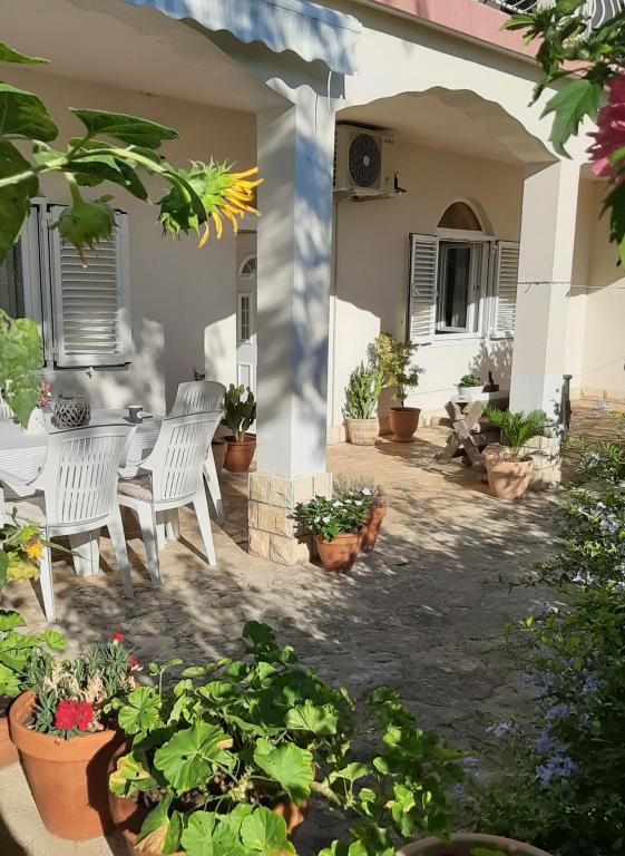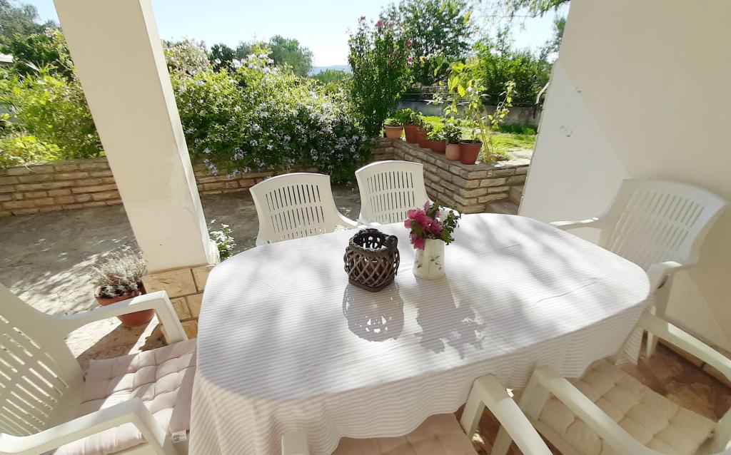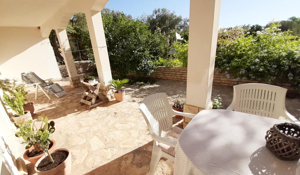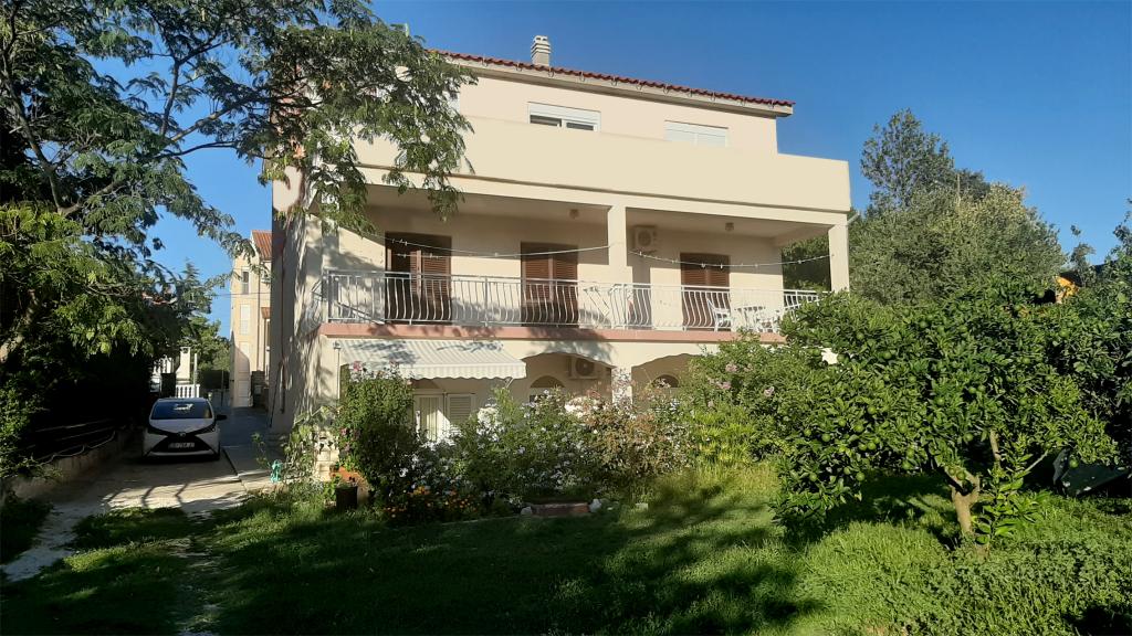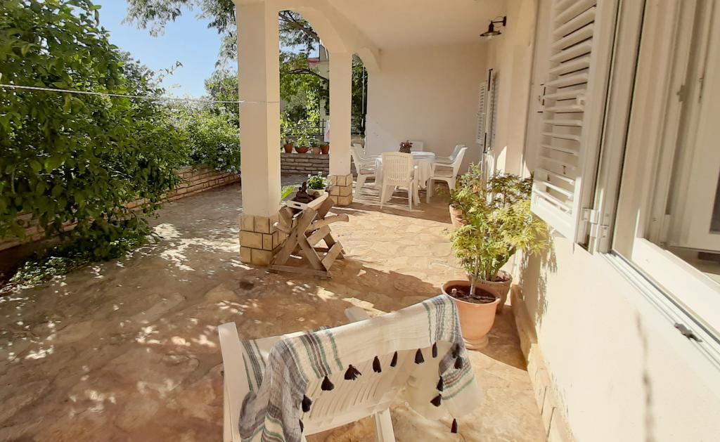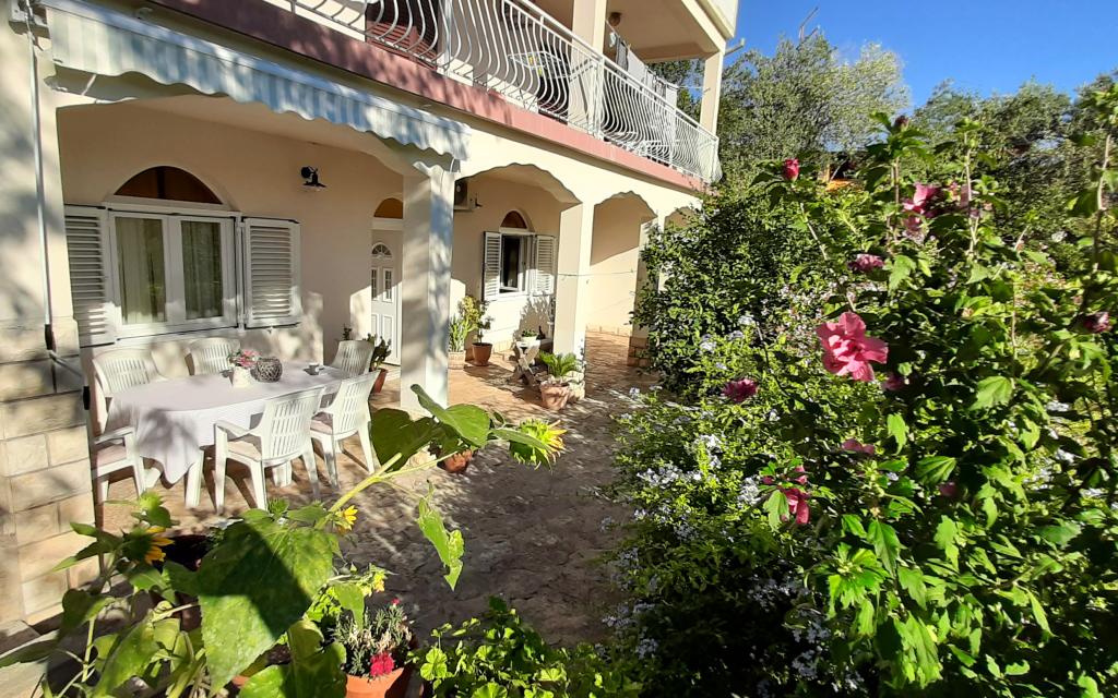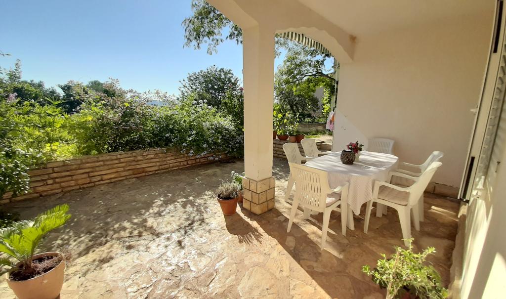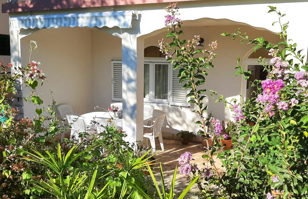 Apartma se nahaja v pritličju družinske hiše, ki je prva vrsta do morja, le 100m od plaže. Ima 2 spalnici z zakonsko posteljo, kopalnico, prostorno dnevno sobo in dobro opremljeno kuhinjo. Stanovanje je veliko 100m2. Na voljo je tudi velika in prijetna terasa s sedežno garnituro in zunanjim tušem s čudovitim pogledom na vrt in oljčni nasad. Apartma je klimatiziran, ima zagotovljeno parkirišče za 1-2 avtomobila, wi-fi in ima možnost uporabe žara. Turistična taksa in klima sta vključeni v ceno.