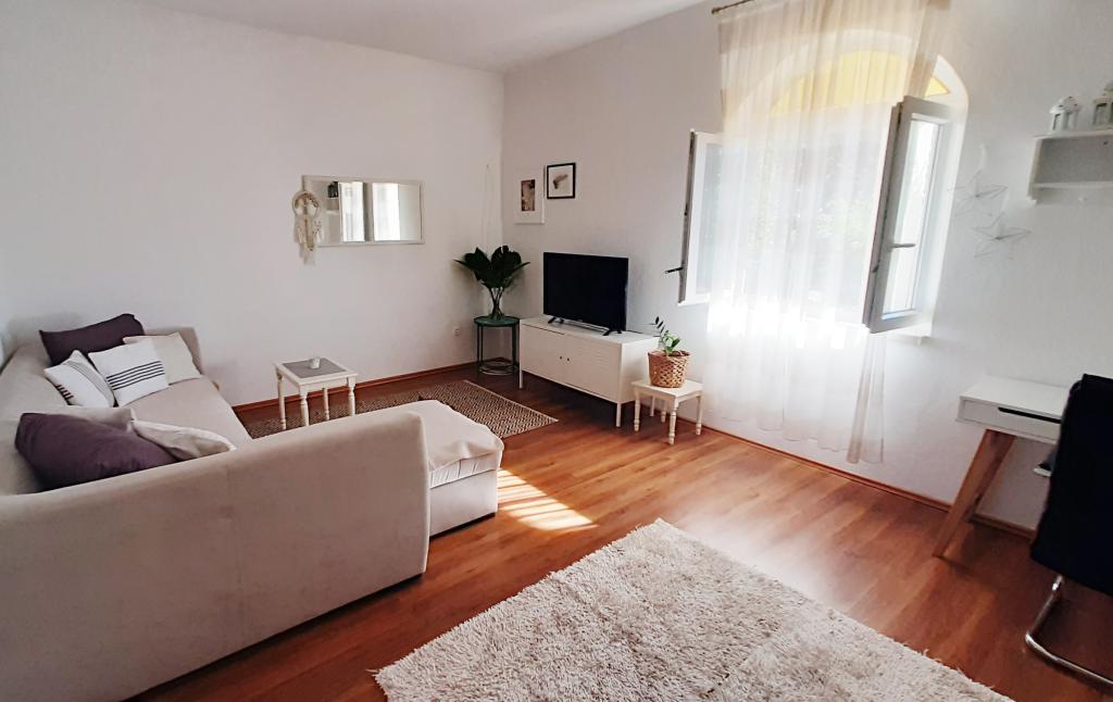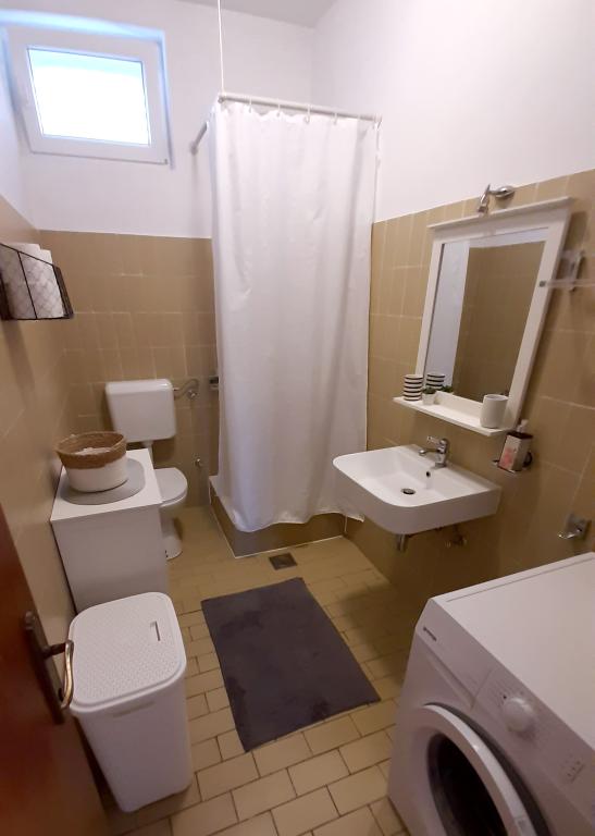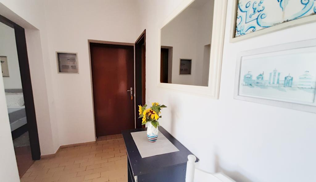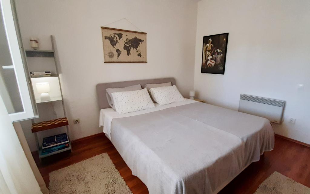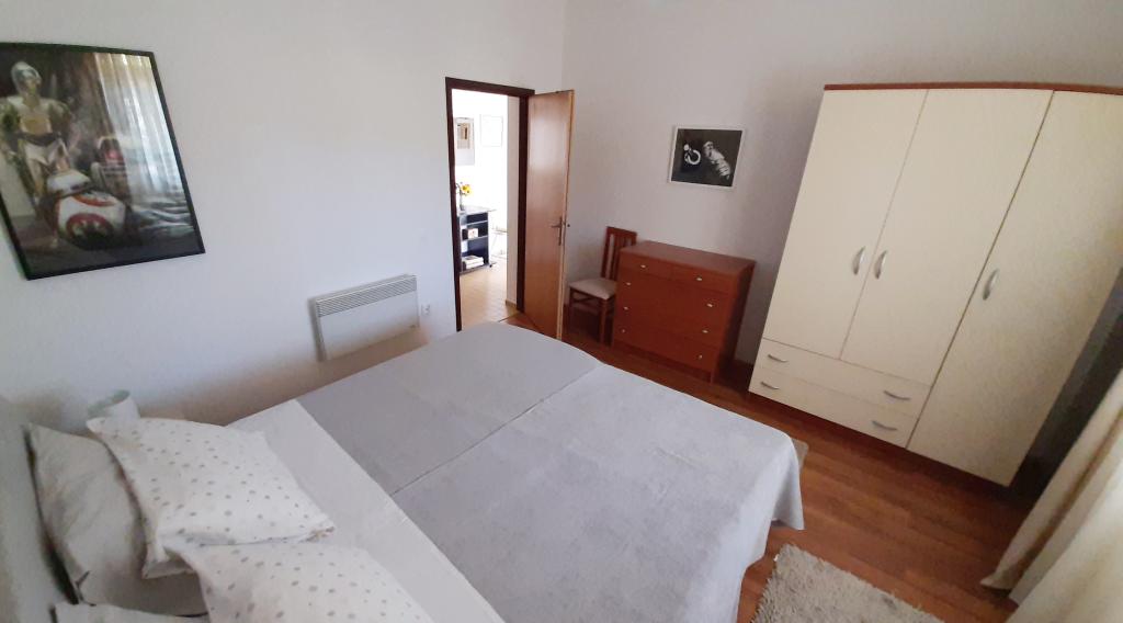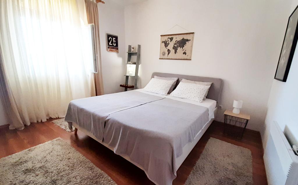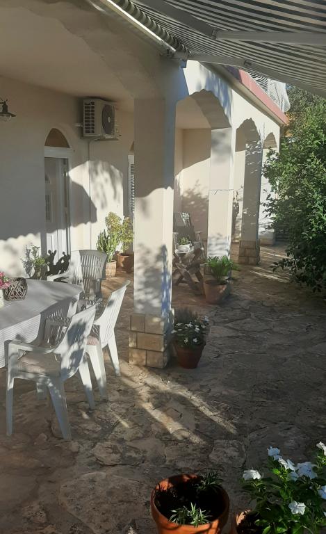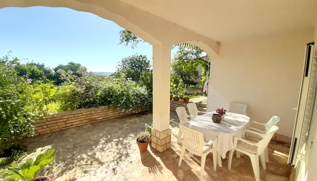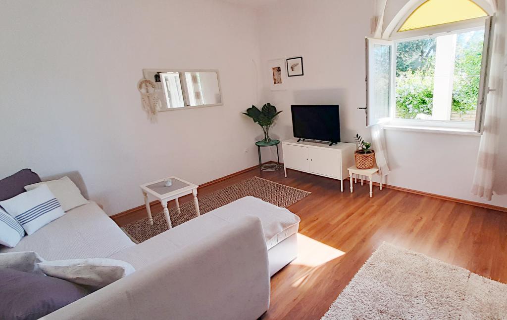 Apartma se nahaja v pritličju družinske hiše, ki je prva vrsta do morja, le 100m od plaže. Ima 2 spalnici z zakonsko posteljo, kopalnico, prostorno dnevno sobo in dobro opremljeno kuhinjo. Stanovanje je veliko 100m2. Na voljo je tudi velika in prijetna terasa s sedežno garnituro in zunanjim tušem s čudovitim pogledom na vrt in oljčni nasad. Apartma je klimatiziran, ima zagotovljeno parkirišče za 1-2 avtomobila, wi-fi in ima možnost uporabe žara. Turistična taksa in klima sta vključeni v ceno.