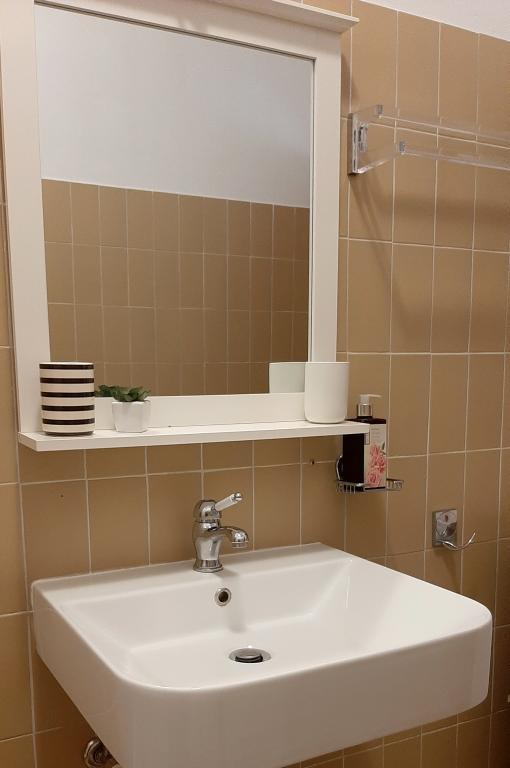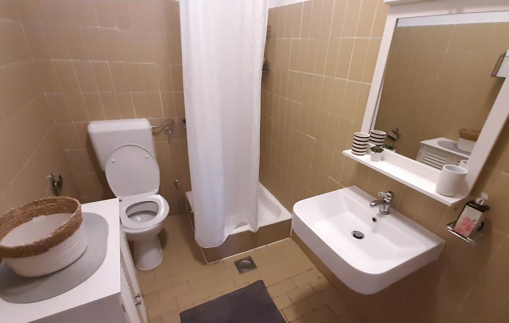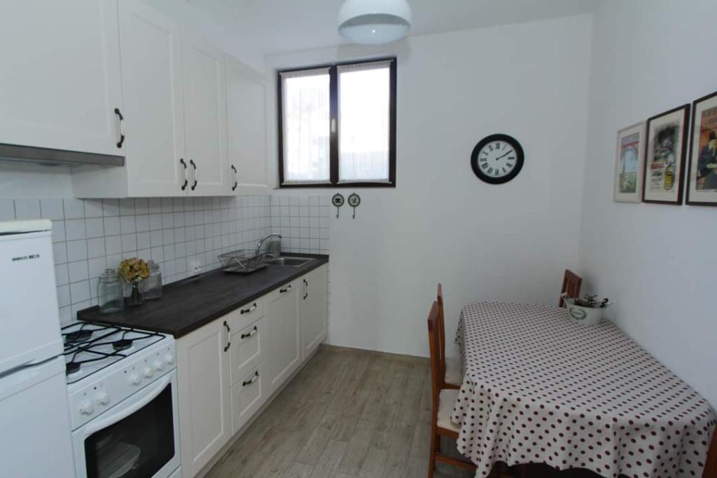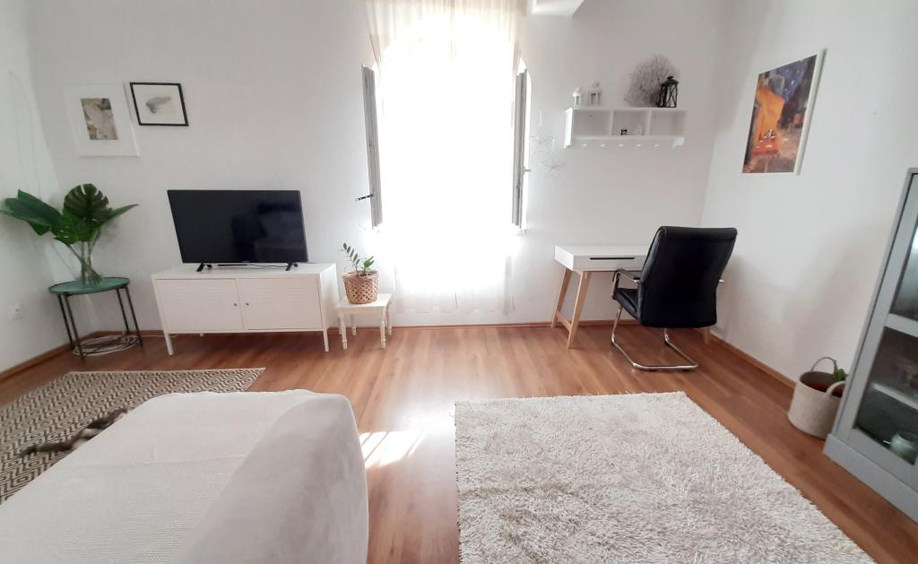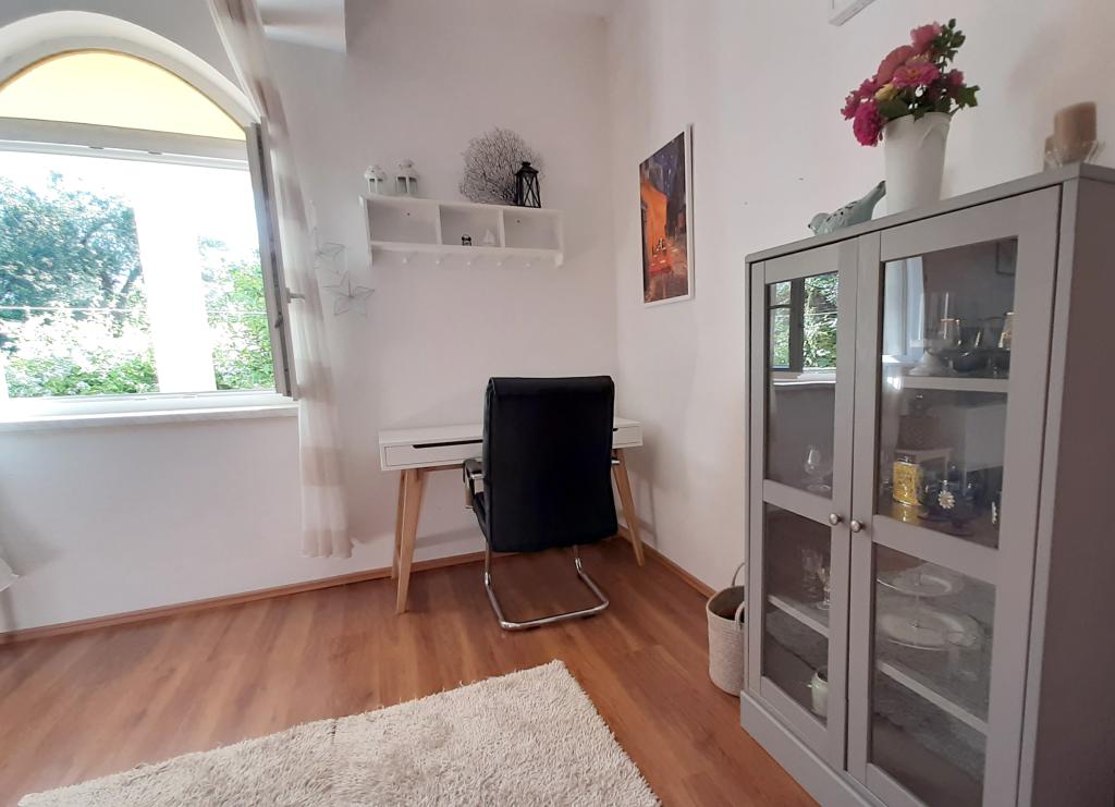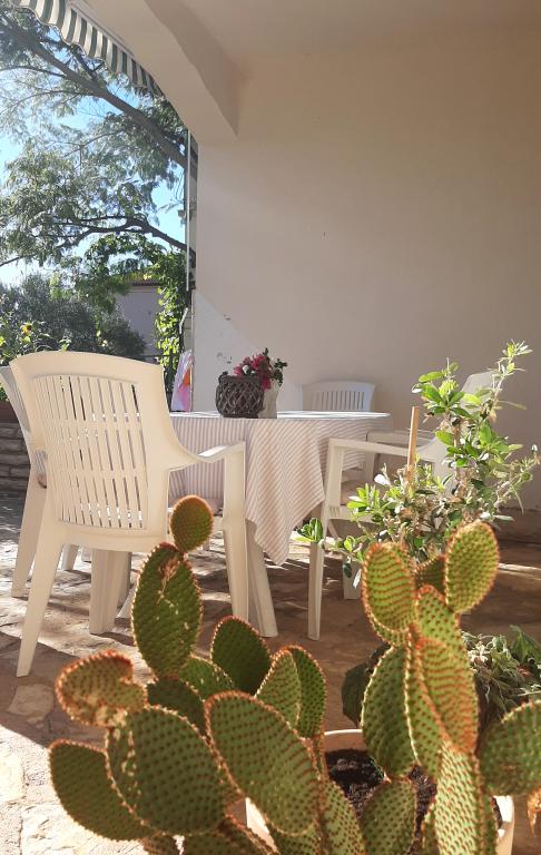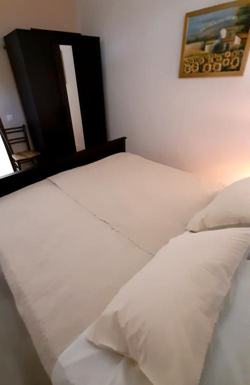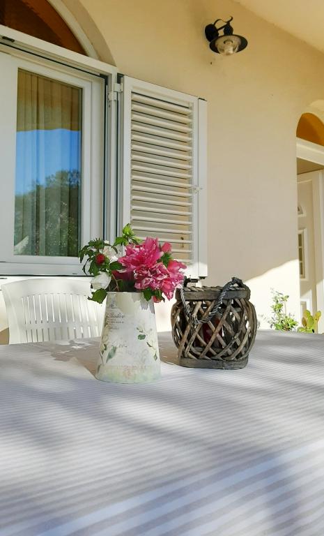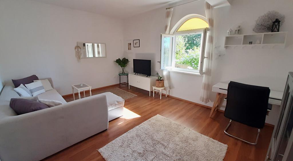 Apartma se nahaja v pritličju družinske hiše, ki je prva vrsta do morja, le 100m od plaže. Ima 2 spalnici z zakonsko posteljo, kopalnico, prostorno dnevno sobo in dobro opremljeno kuhinjo. Stanovanje je veliko 100m2. Na voljo je tudi velika in prijetna terasa s sedežno garnituro in zunanjim tušem s čudovitim pogledom na vrt in oljčni nasad. Apartma je klimatiziran, ima zagotovljeno parkirišče za 1-2 avtomobila, wi-fi in ima možnost uporabe žara. Turistična taksa in klima sta vključeni v ceno.