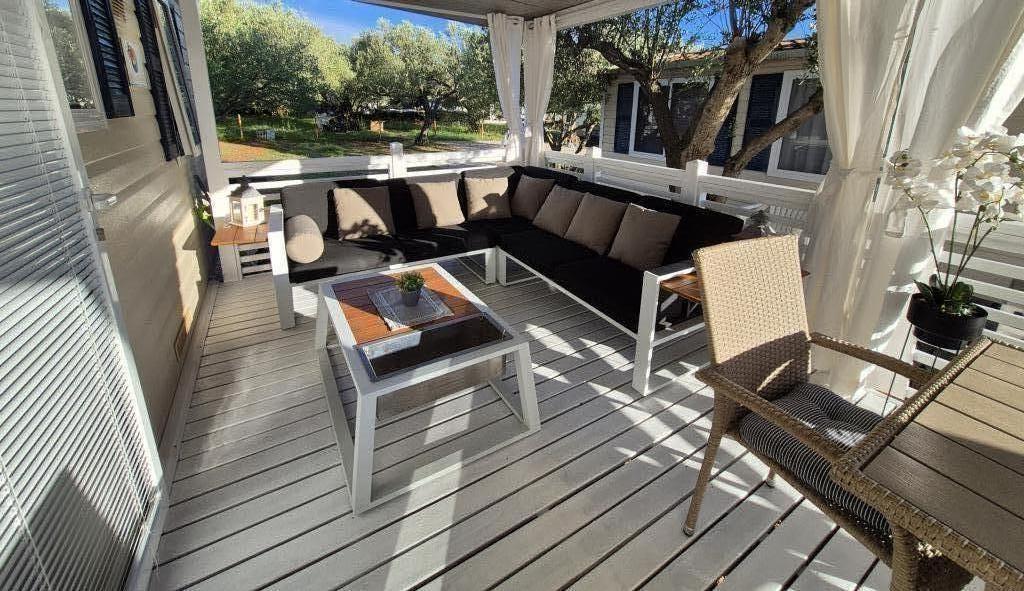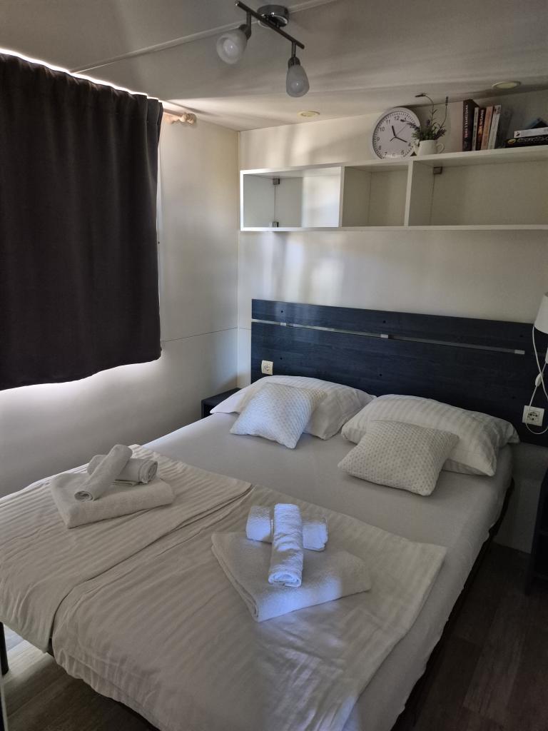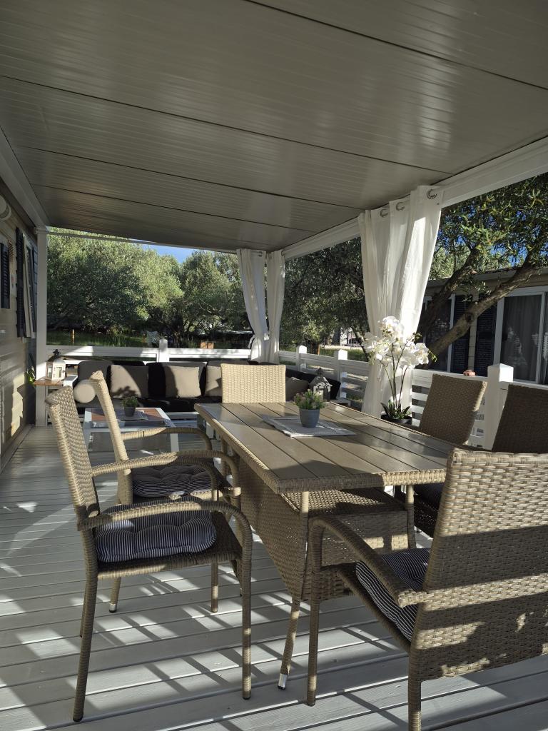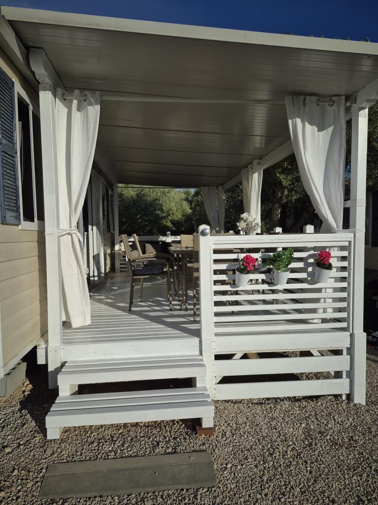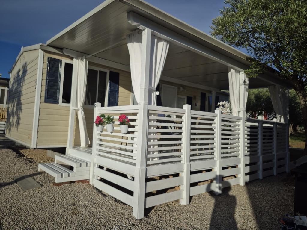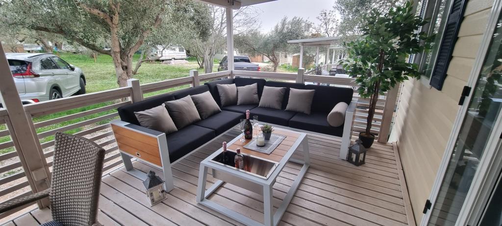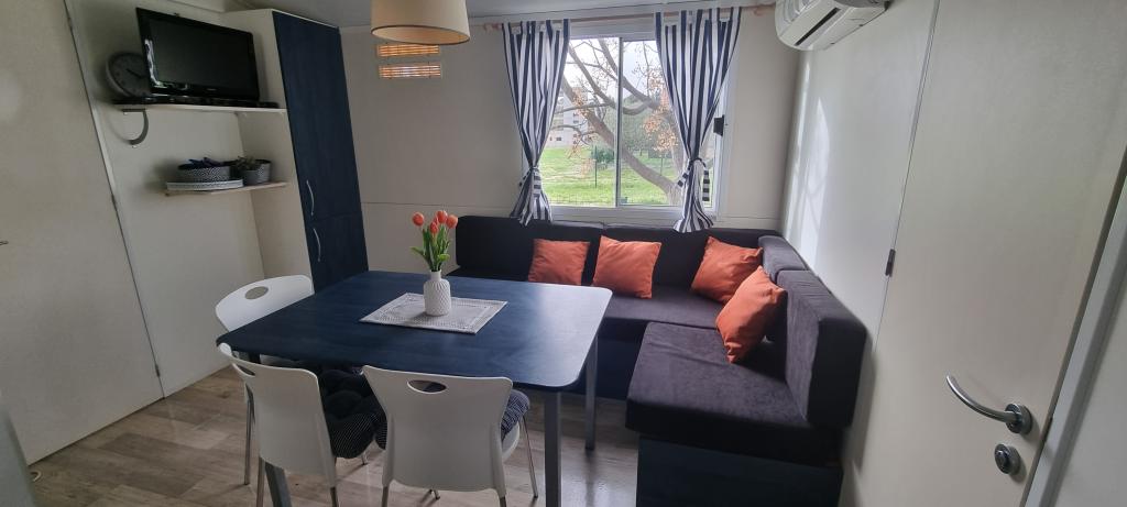 Mobilna hišica San Antonio se nahaja v manjšem kampu, obdanem z mediteranskim rastlinjem, tik ob prodnati in peščeni plaži Iza Banja, primerni za družine z majhnimi otroki zaradi postopnega vstopa v morje. Mobilna hišica San Antonio je sestavljena iz 3 spalnic: 1 sobe z zakonsko posteljo in 2 sob z dvema posteljama, kopalnice s tušem in straniščem, dnevne sobe s popolnoma opremljeno kuhinjo z jedilno mizo in stoli ter kotnim kavčem, hladilnika z zamrzovalnikom, mikrovalovne pečice, električnega grelnika vode, posode in jedilnega pribora, kavnega avtomata, TV-ja, opekača kruha in klimatske naprave. Terasa je opremljena z mizo in 6 stoli, kotno sedežno garnituro in plinskim žarom. Cena vključuje posteljnino, brisače (2x na teden) in parkirno mesto za eno vozilo.