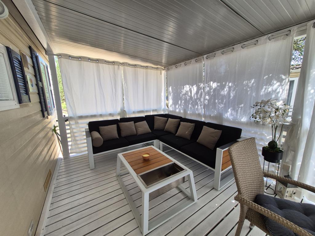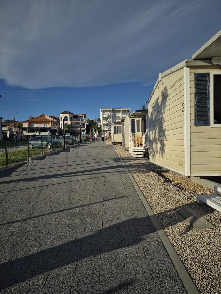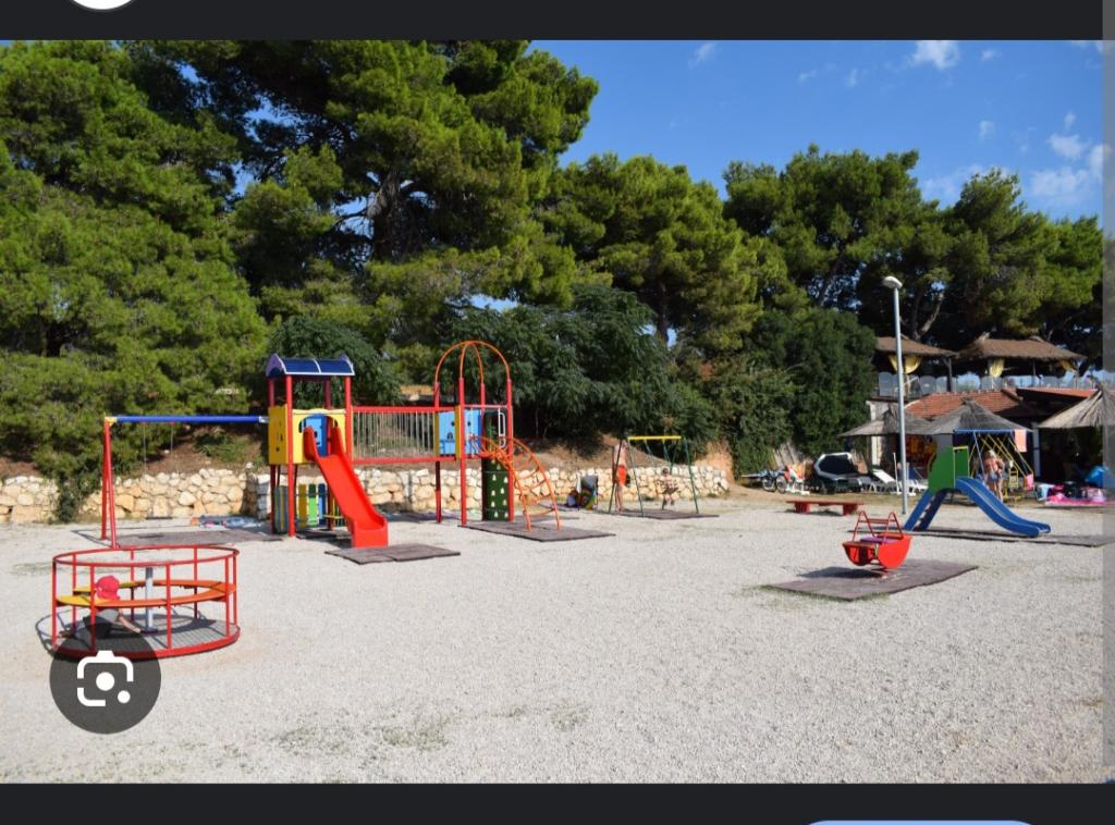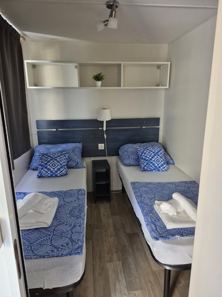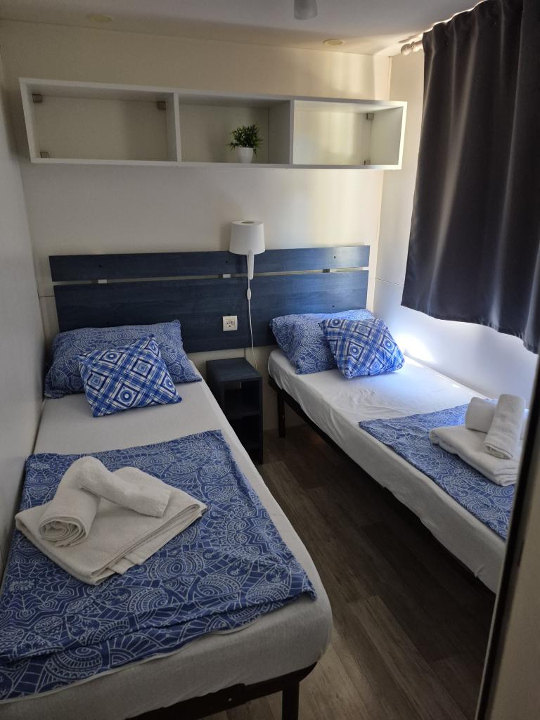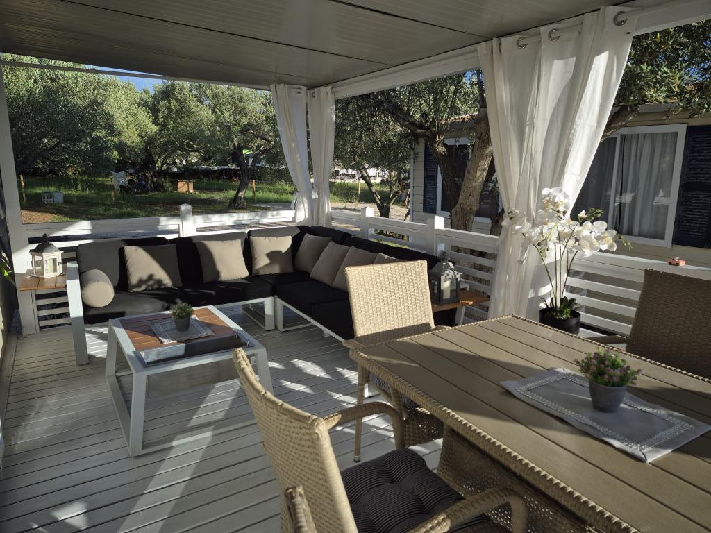 Mobilna hišica San Antonio se nahaja v manjšem kampu, obdanem z mediteranskim rastlinjem, tik ob prodnati in peščeni plaži Iza Banja, primerni za družine z majhnimi otroki zaradi postopnega vstopa v morje. Mobilna hišica San Antonio je sestavljena iz 3 spalnic: 1 sobe z zakonsko posteljo in 2 sob z dvema posteljama, kopalnice s tušem in straniščem, dnevne sobe s popolnoma opremljeno kuhinjo z jedilno mizo in stoli ter kotnim kavčem, hladilnika z zamrzovalnikom, mikrovalovne pečice, električnega grelnika vode, posode in jedilnega pribora, kavnega avtomata, TV-ja, opekača kruha in klimatske naprave. Terasa je opremljena z mizo in 6 stoli, kotno sedežno garnituro in plinskim žarom. Cena vključuje posteljnino, brisače (2x na teden) in parkirno mesto za eno vozilo.