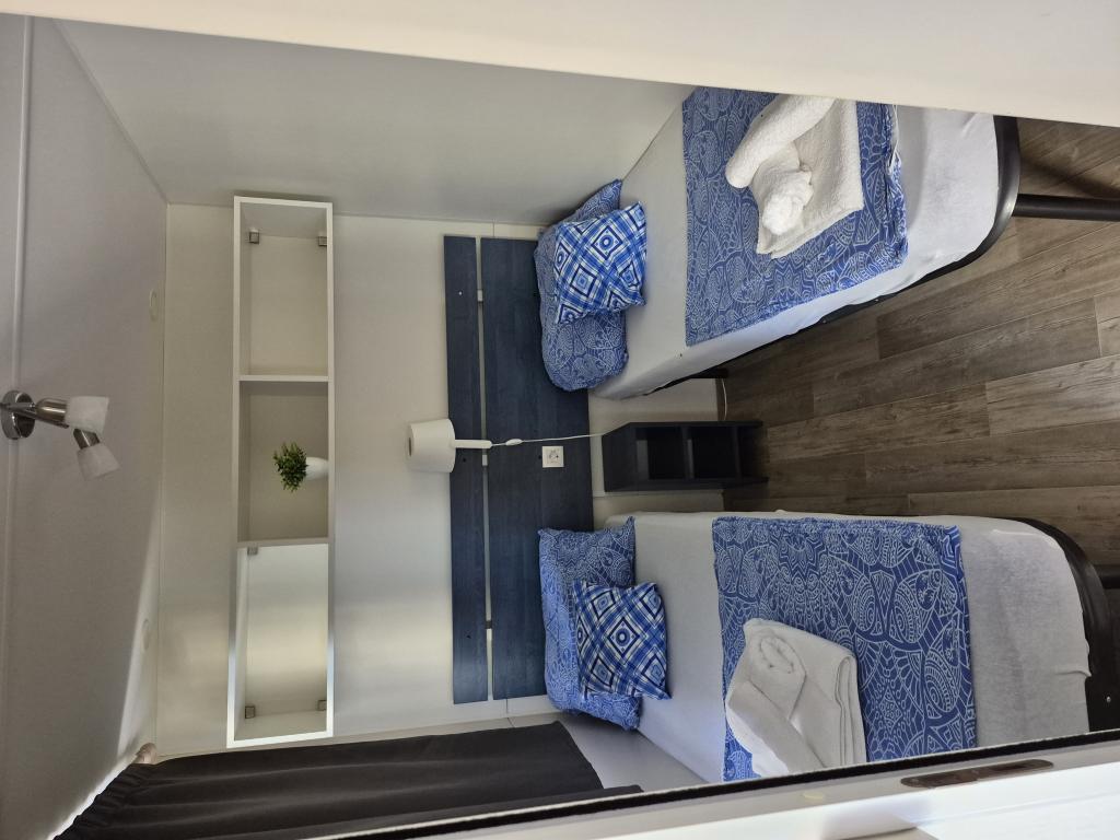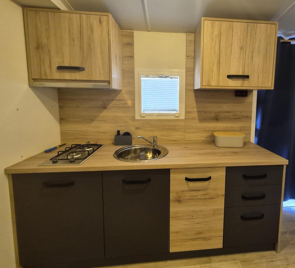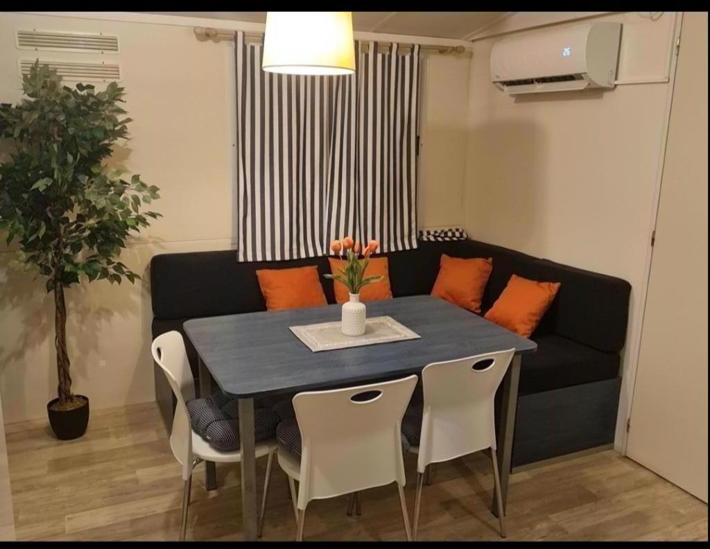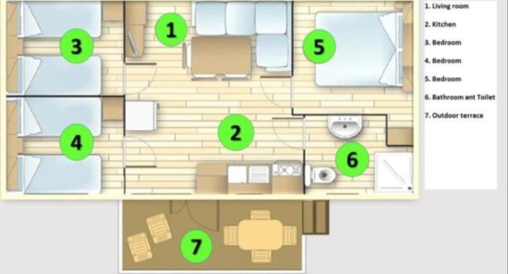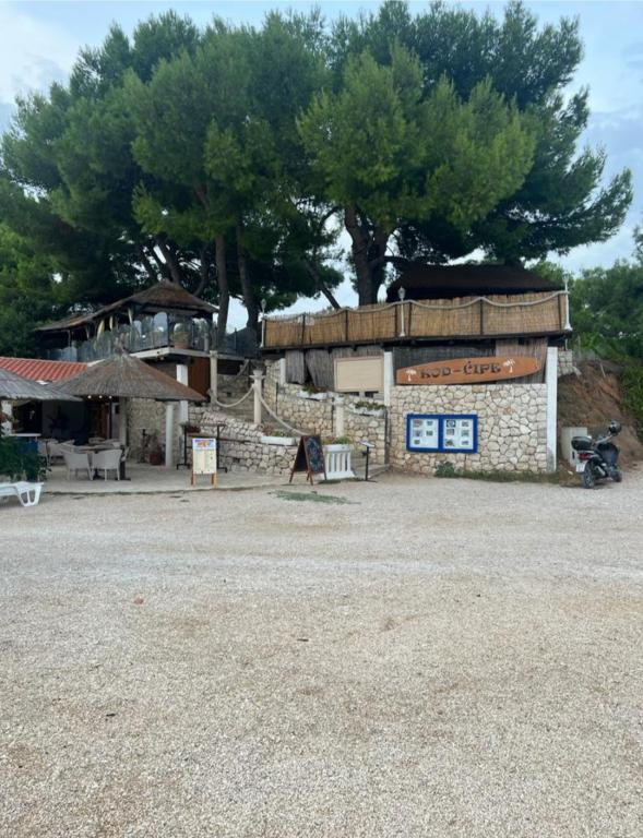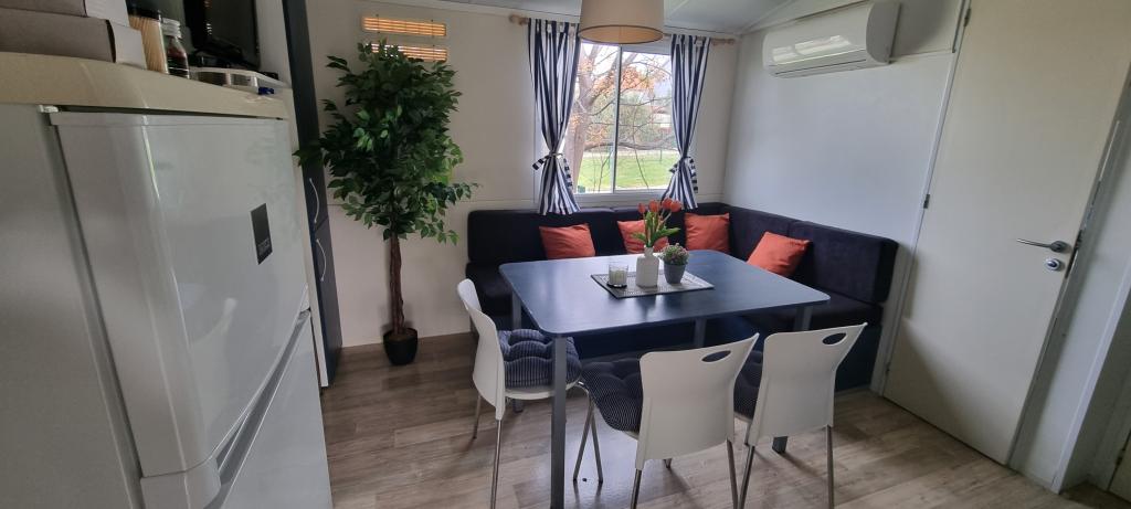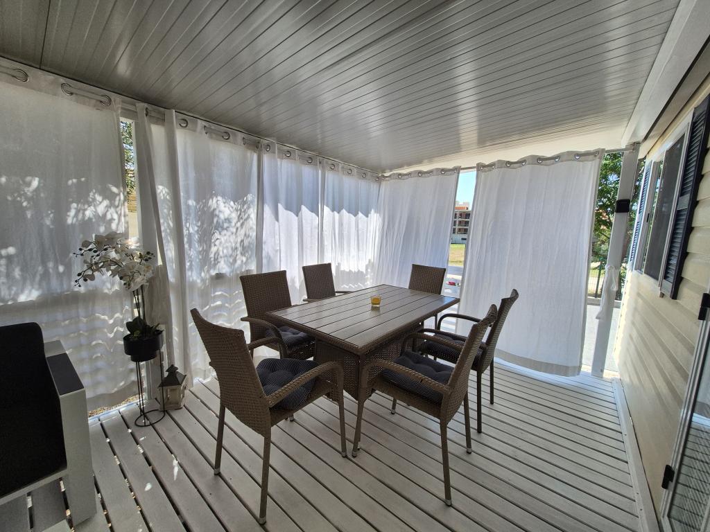 Mobilna hišica San Antonio se nahaja v manjšem kampu, obdanem z mediteranskim rastlinjem, tik ob prodnati in peščeni plaži Iza Banja, primerni za družine z majhnimi otroki zaradi postopnega vstopa v morje. Mobilna hišica San Antonio je sestavljena iz 3 spalnic: 1 sobe z zakonsko posteljo in 2 sob z dvema posteljama, kopalnice s tušem in straniščem, dnevne sobe s popolnoma opremljeno kuhinjo z jedilno mizo in stoli ter kotnim kavčem, hladilnika z zamrzovalnikom, mikrovalovne pečice, električnega grelnika vode, posode in jedilnega pribora, kavnega avtomata, TV-ja, opekača kruha in klimatske naprave. Terasa je opremljena z mizo in 6 stoli, kotno sedežno garnituro in plinskim žarom. Cena vključuje posteljnino, brisače (2x na teden) in parkirno mesto za eno vozilo.