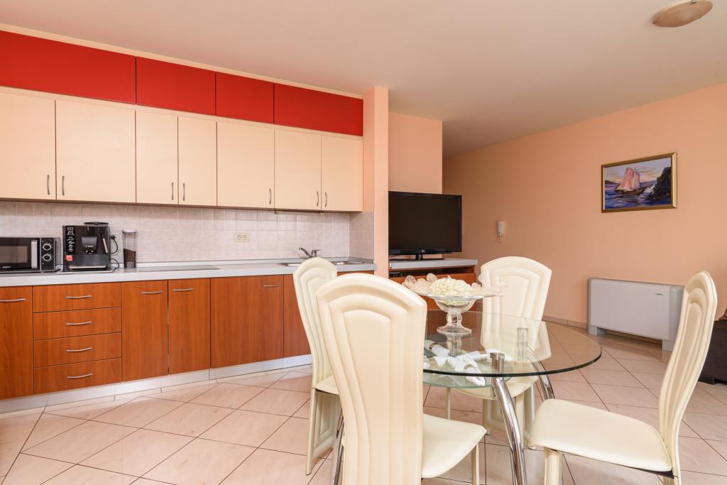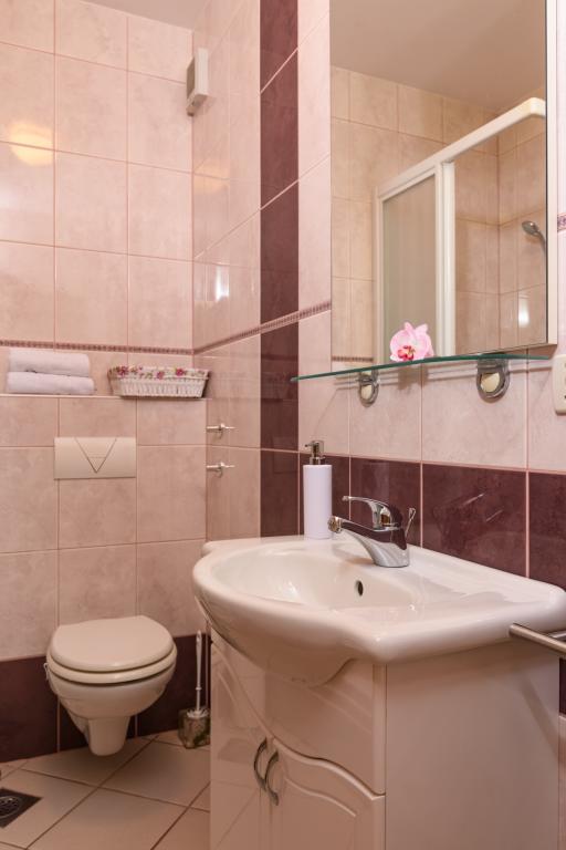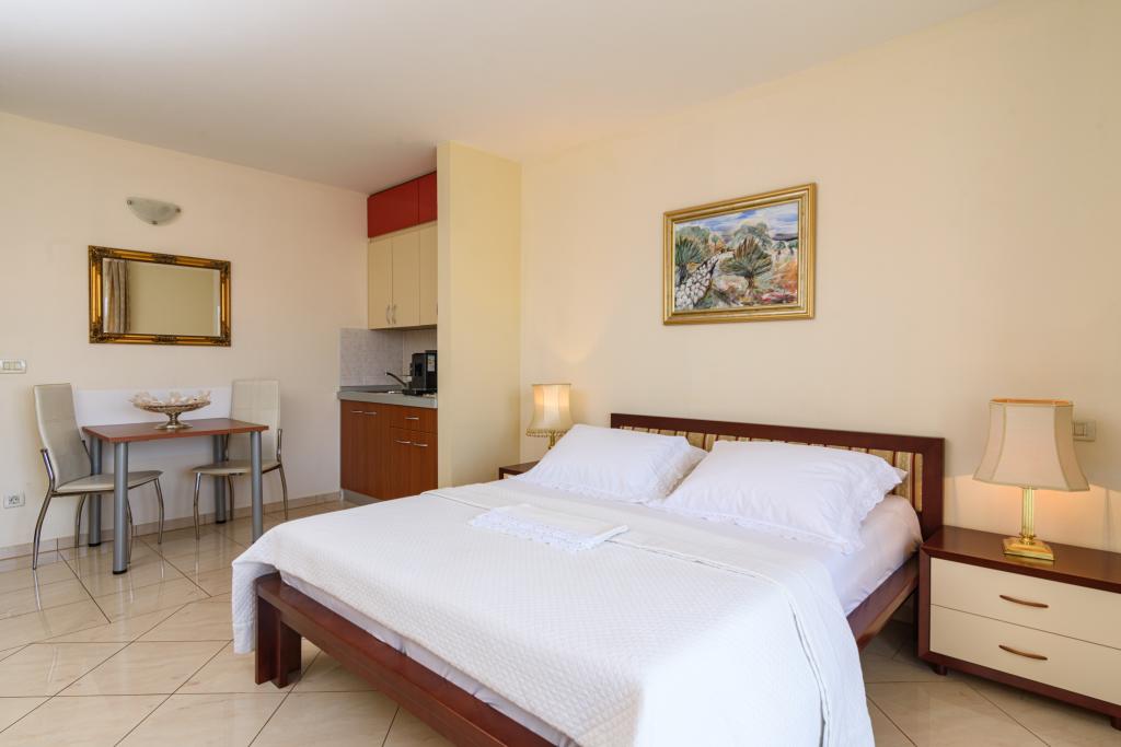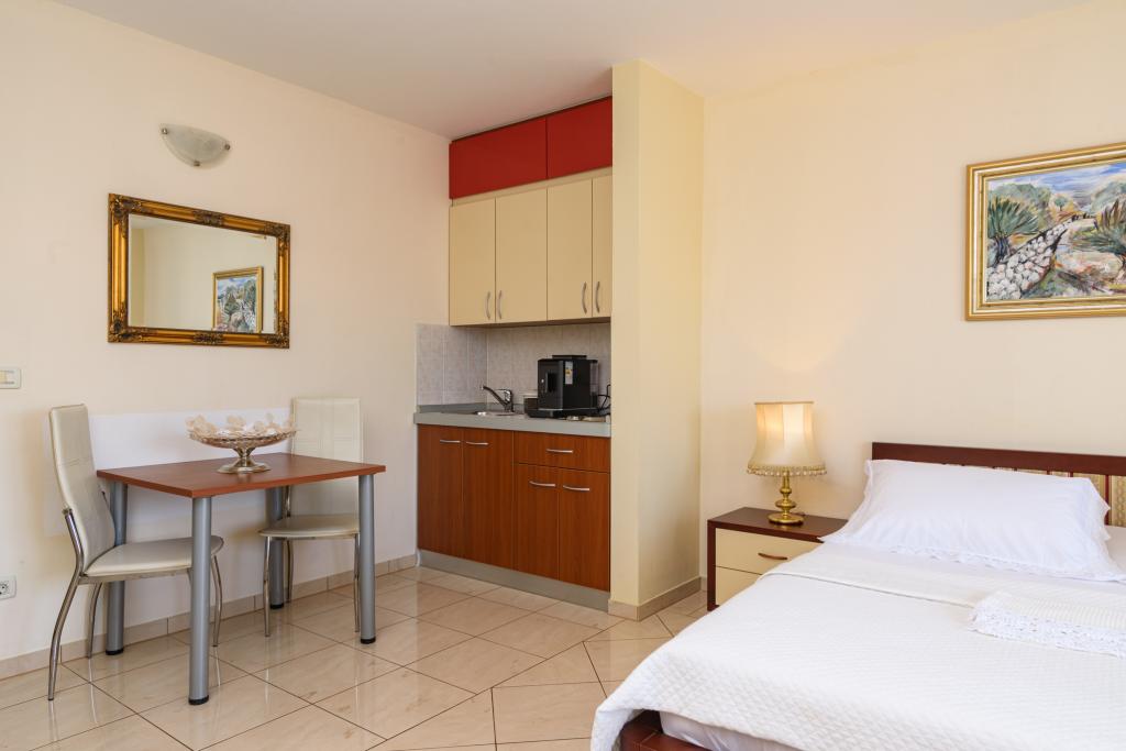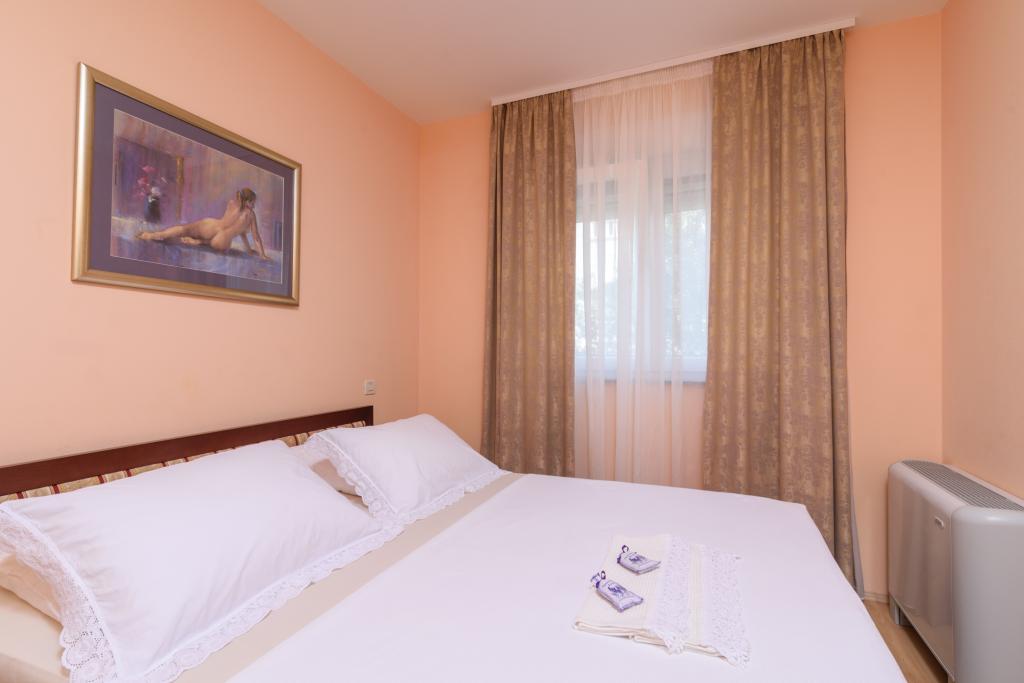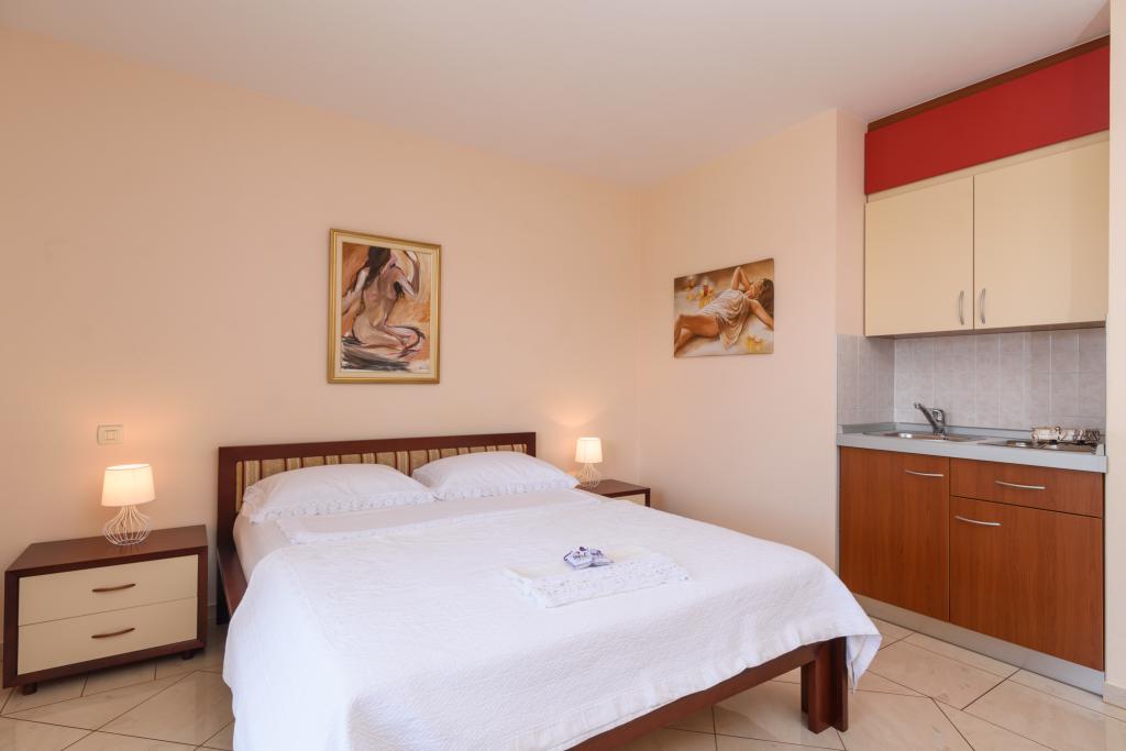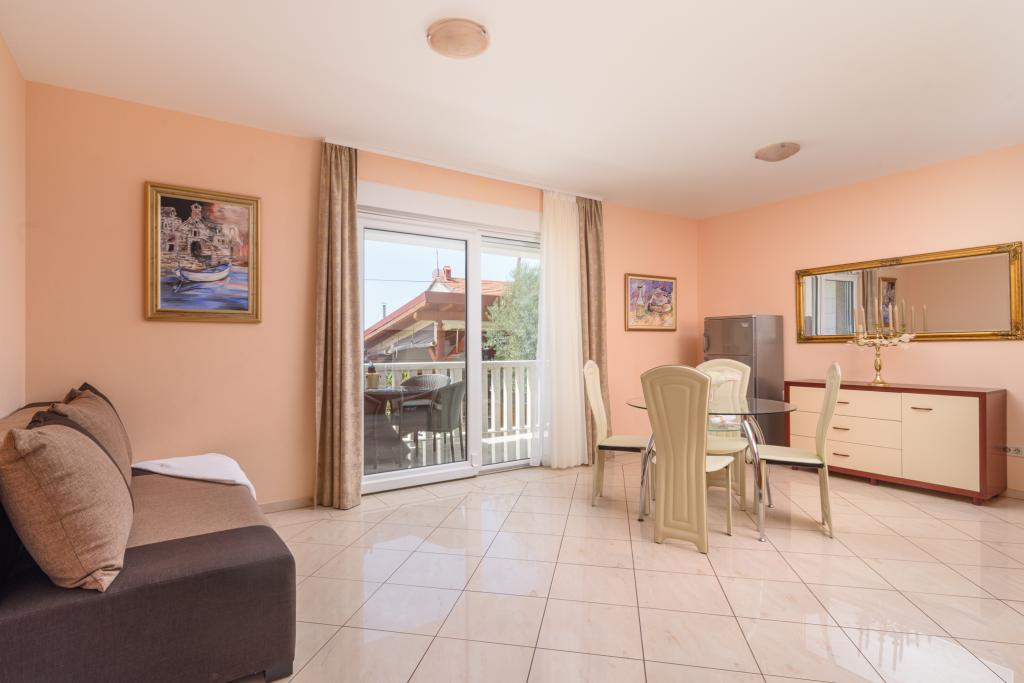 Turistična taksa je vključena v ceno.Apartma A2 tipa 2 (51m2) - Velika dnevna soba s kuhinjo in eno posteljo za dve osebi, eno spalnico, kopalnico in balkon (12m2). Tip apartma / studio apartma A2 1 (30m2) - dnevna soba s kuhinjo, z zakonsko posteljo, kavč razvalčenje eno posteljo, kopalnico in balkon (6,5m2). Tip apartma / studio apartma A2 (26m2) - dnevna soba s kuhinjo, zakonsko posteljo, kopalnica in balkon (6,5m2). Vsi naši gostje lahko uporabljajo žar z lesom peči, ki se nahaja v vrtu in uživajte kosila in večerje v kasnejših urah, v skupni zasebnosti. Za vse goste je zasebna prakig pred hišo.