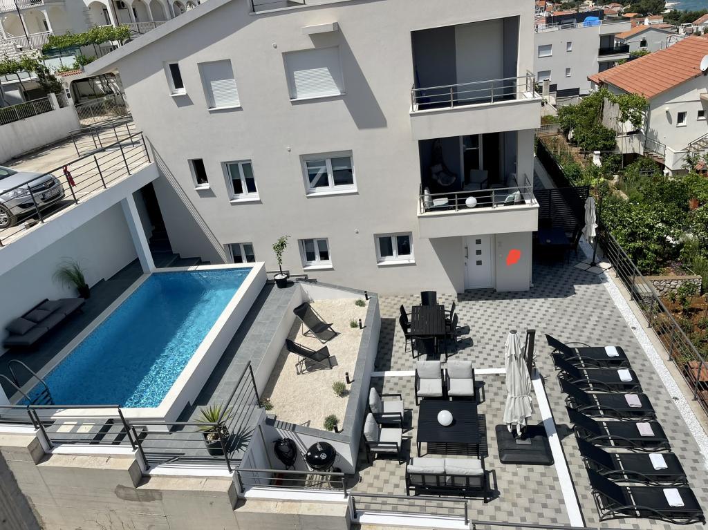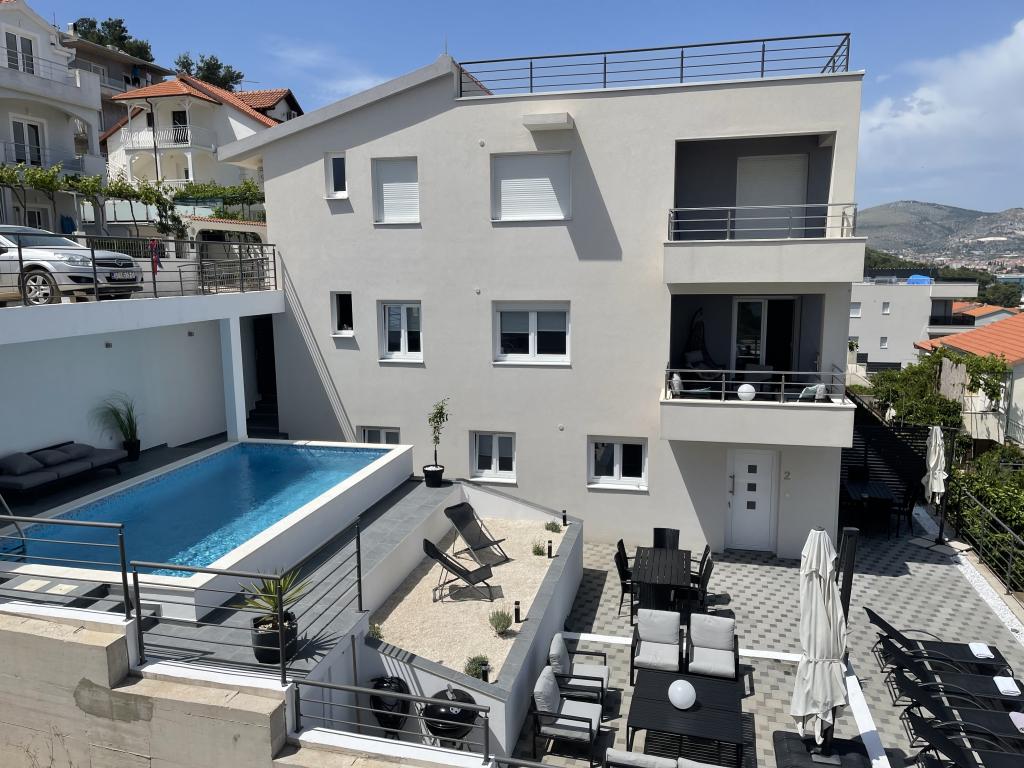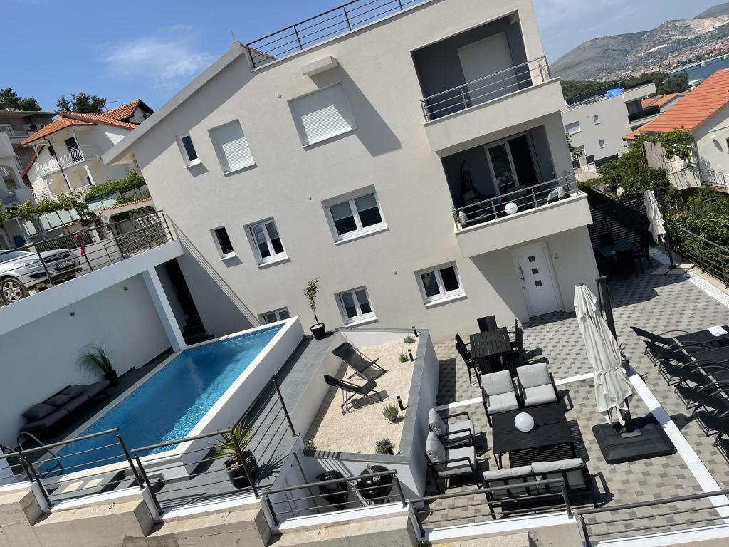 Zaradi svoje lege na pobočju imata oba apartmaja čudovit razgled na zaliv. Velik bazen vas vabi, da se ohladite in sprostite na številnih ležalnikih. Zunaj je tudi udobno dnevno pohištvo in jedilne mize, na primer za zajtrk zunaj. Apartmaji so zelo moderni - vključno s klimatsko napravo, pomivalnim strojem, pralnim strojem itd. - in ne puščajo ničesar želenega. Za vsako stanovanje je tudi prostorno parkirno mesto za avto. Bližnji Trogir ima s svojim lepim in živahnim starim mestnim jedrom veliko za ponuditi in tam se vsak s kulinaričnega vidika nabere. Voda na številnih plažah in zalivih je kristalno čista, tako da lahko med potapljanjem raziskujete podvodni svet. Z veseljem se oziram na te počitnice in se bom z veseljem vrnil.