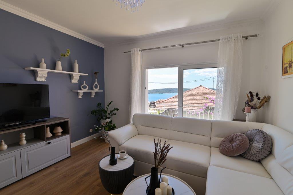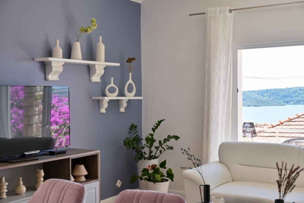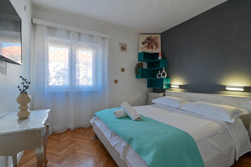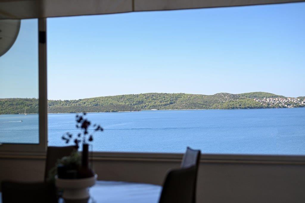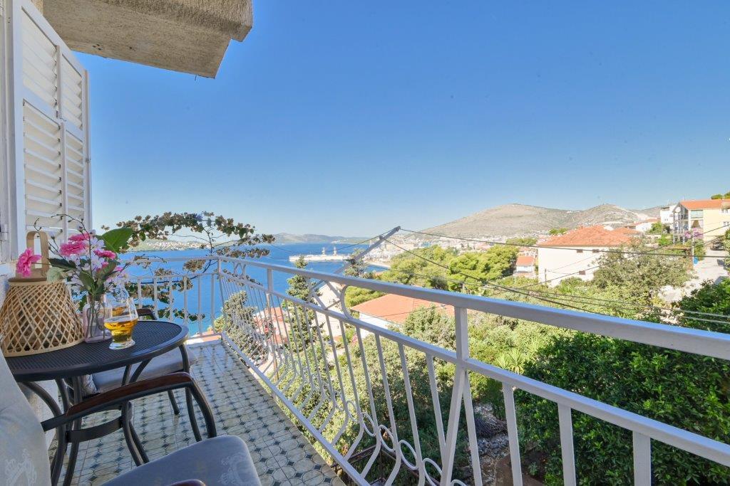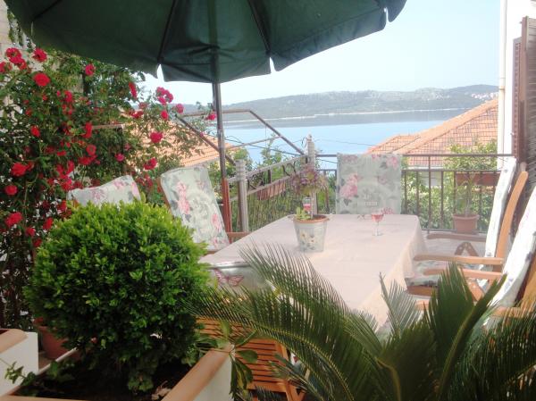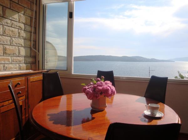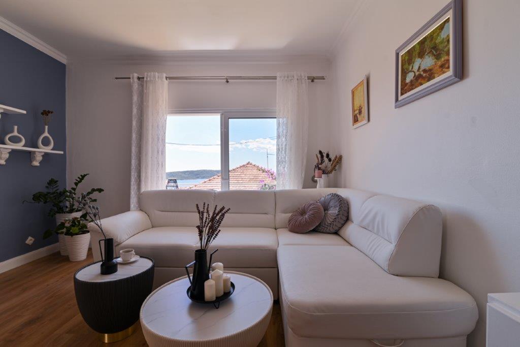 To je hiša z tekskluzivna stanovanj. To se nahaja v privlačen del mesta. Južni strani otoka Čiovo (z mostom povezan z obalo in lepe mesta Trogir (UNESCO)). Hiša se nahaja v Mirnyi soseski, stran od morja (plaže z borovci), nekaj 200m od atraktivni mestni plaži v Okrug Gornji približno 700m. Oddaljenost od restavracij in trgovin je bila zaključena 150m, bolnišnica, pošta in vsi objekti se nahajajo v centru mesta, ki se nahaja približno 15 minut. hojo in nekaj 5 km od letališča Split (ponujajo prevoz od letališča po predhodnem dogovoru z lastniki). Hiša ima dva apartmaja. Vsak je v celoti opremljen in ima čudovit pogled na morje. Ena je kategoriziran s 4 zvezdicami. To se nahaja v pritličju ima teraso in dva balkona. 2 spalnici, dnevna soba s kavčem, jedilnico in kuhinjo ter 2 kopalnici. Opremljen s popolnoma (klimatsko napravo, brezžični internet, satelitsko televizijo, pralni stroj, vsi gospodinjski aparati, parkirišče ... a. Drugi je kategoriziran s 3 zvezdicami. Je prva
