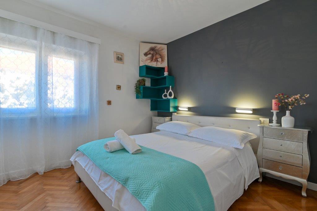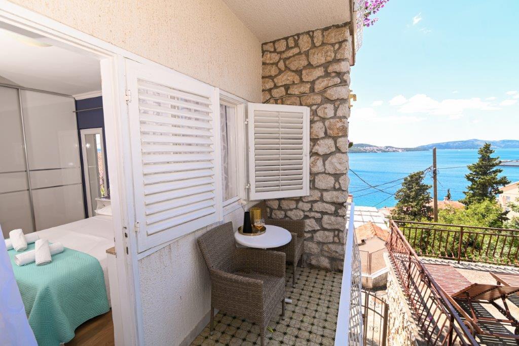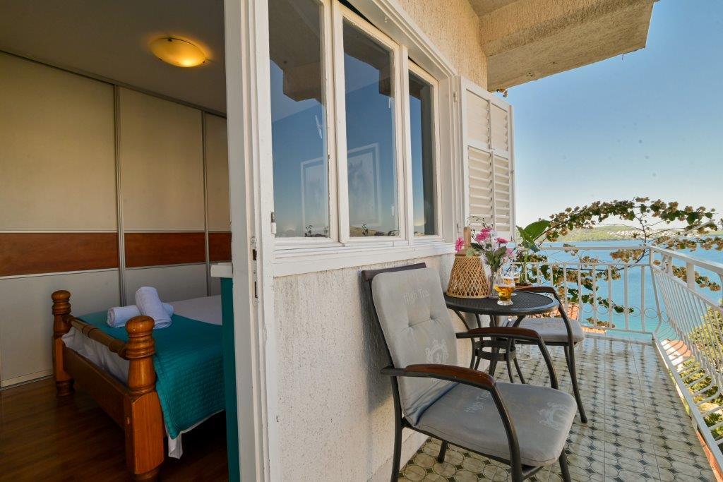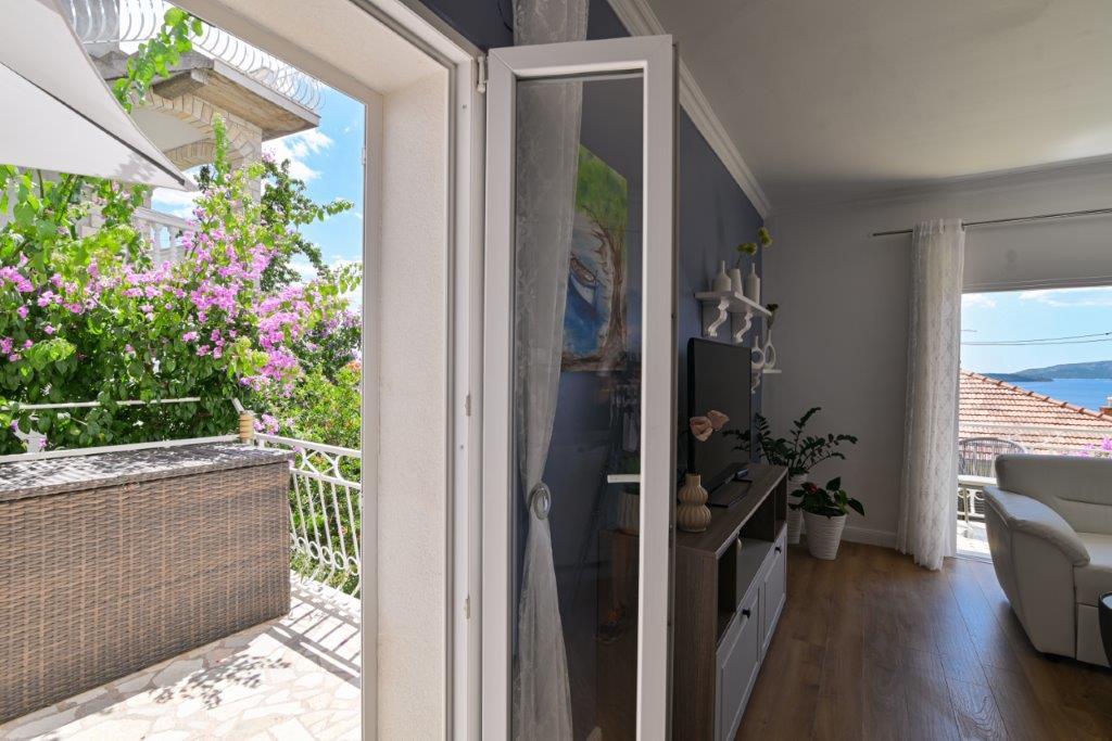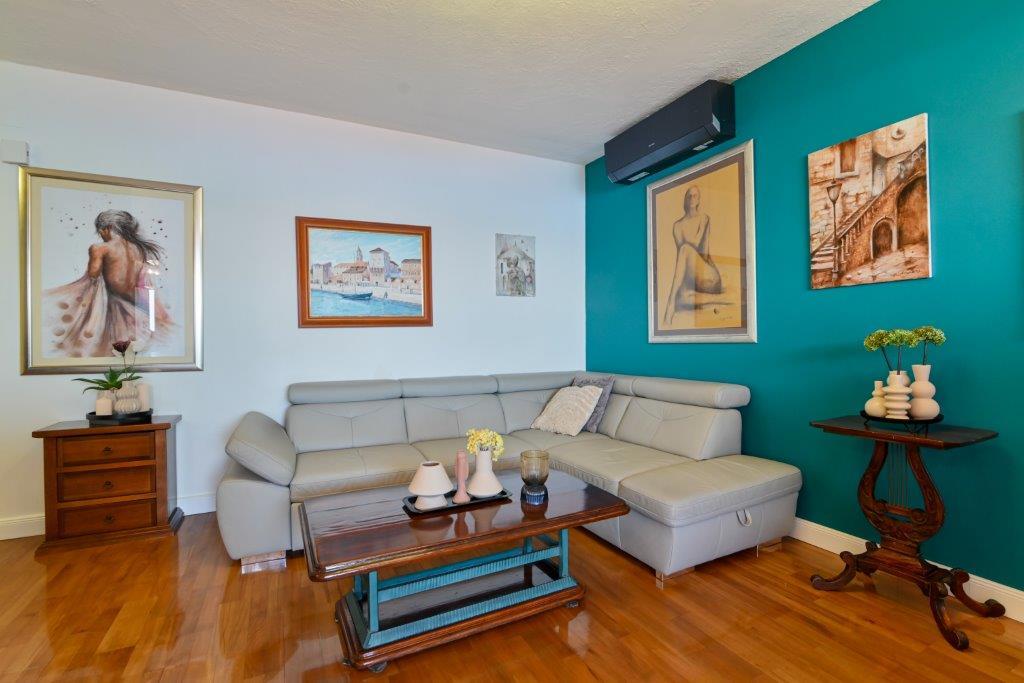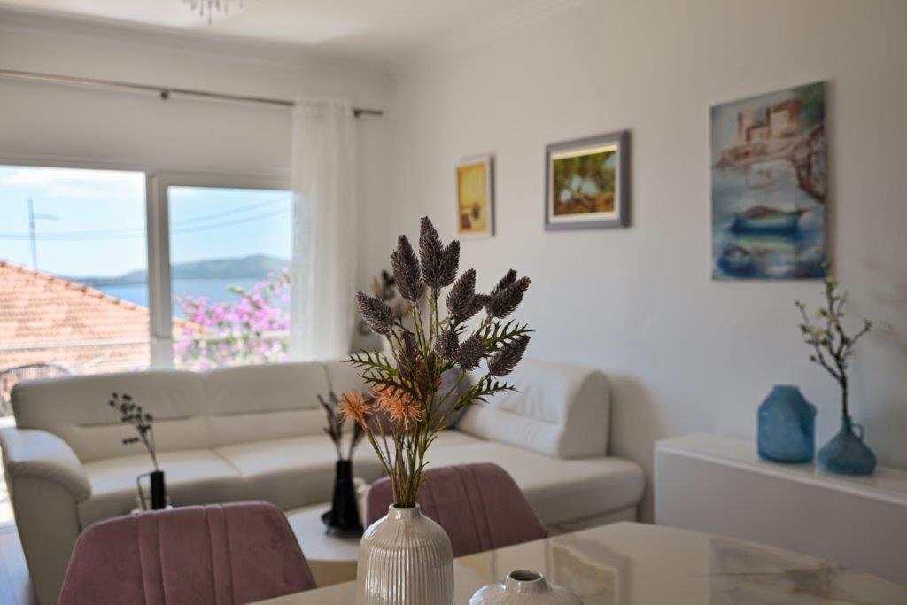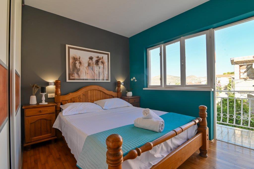 To je hiša z tekskluzivna stanovanj. To se nahaja v privlačen del mesta. Južni strani otoka Čiovo (z mostom povezan z obalo in lepe mesta Trogir (UNESCO)). Hiša se nahaja v Mirnyi soseski, stran od morja (plaže z borovci), nekaj 200m od atraktivni mestni plaži v Okrug Gornji približno 700m. Oddaljenost od restavracij in trgovin je bila zaključena 150m, bolnišnica, pošta in vsi objekti se nahajajo v centru mesta, ki se nahaja približno 15 minut. hojo in nekaj 5 km od letališča Split (ponujajo prevoz od letališča po predhodnem dogovoru z lastniki). Hiša ima dva apartmaja. Vsak je v celoti opremljen in ima čudovit pogled na morje. Ena je kategoriziran s 4 zvezdicami. To se nahaja v pritličju ima teraso in dva balkona. 2 spalnici, dnevna soba s kavčem, jedilnico in kuhinjo ter 2 kopalnici. Opremljen s popolnoma (klimatsko napravo, brezžični internet, satelitsko televizijo, pralni stroj, vsi gospodinjski aparati, parkirišče ... a. Drugi je kategoriziran s 3 zvezdicami. Je prva