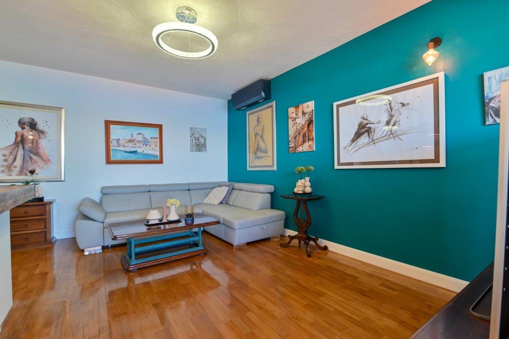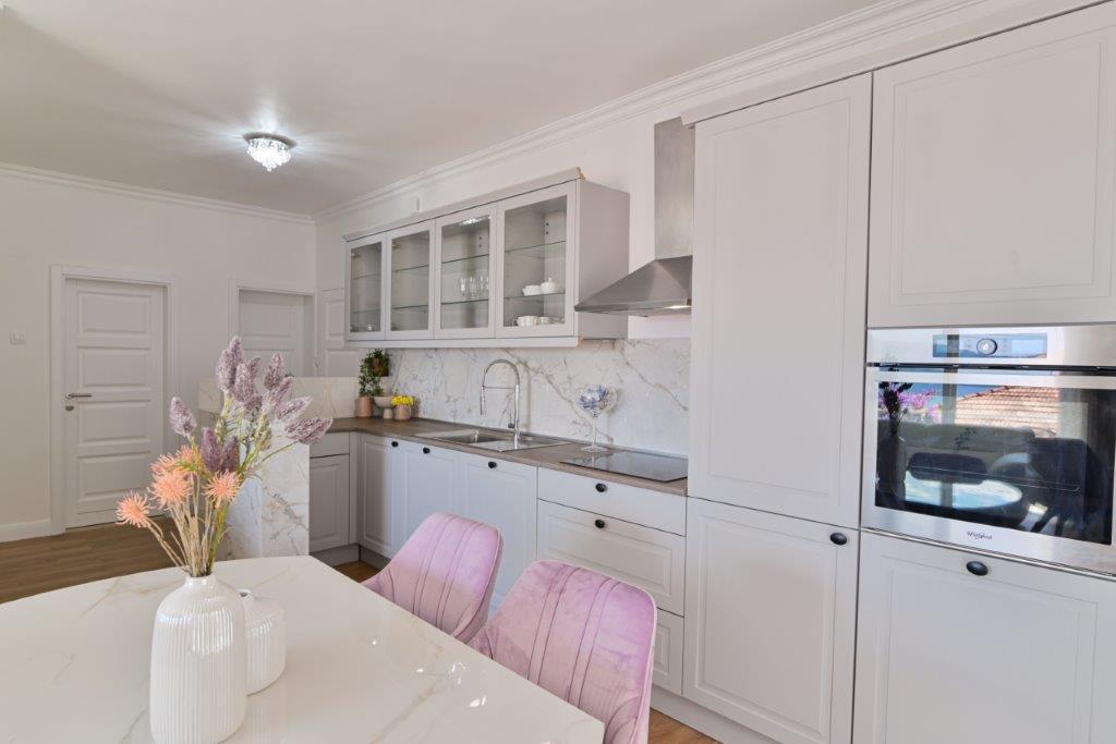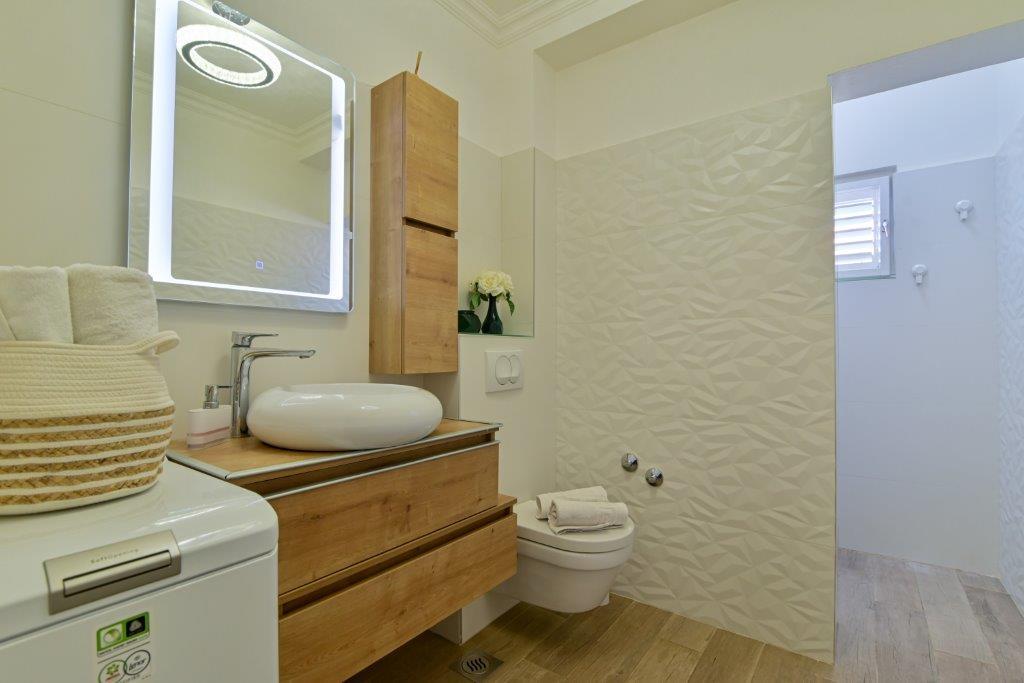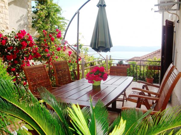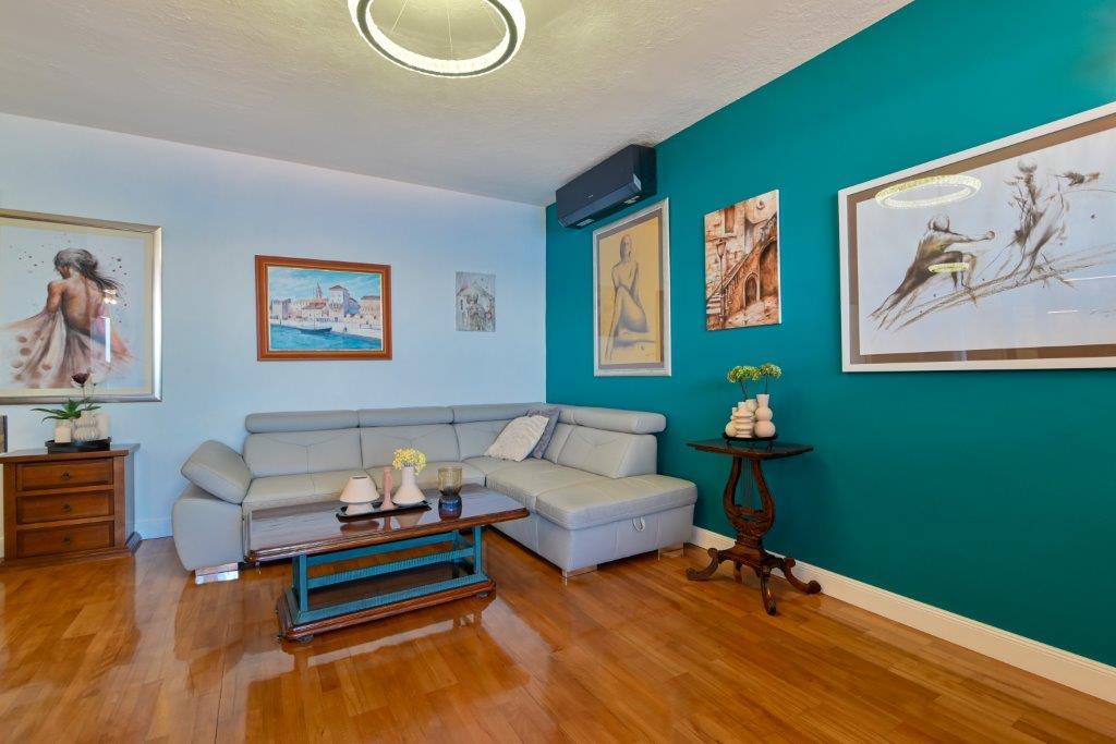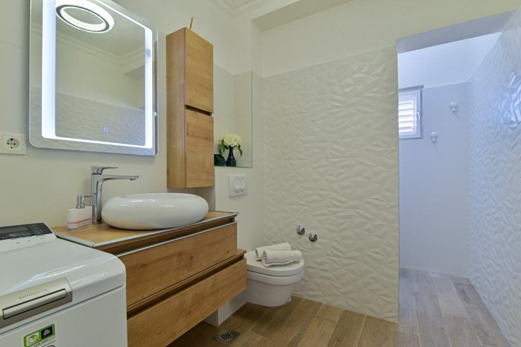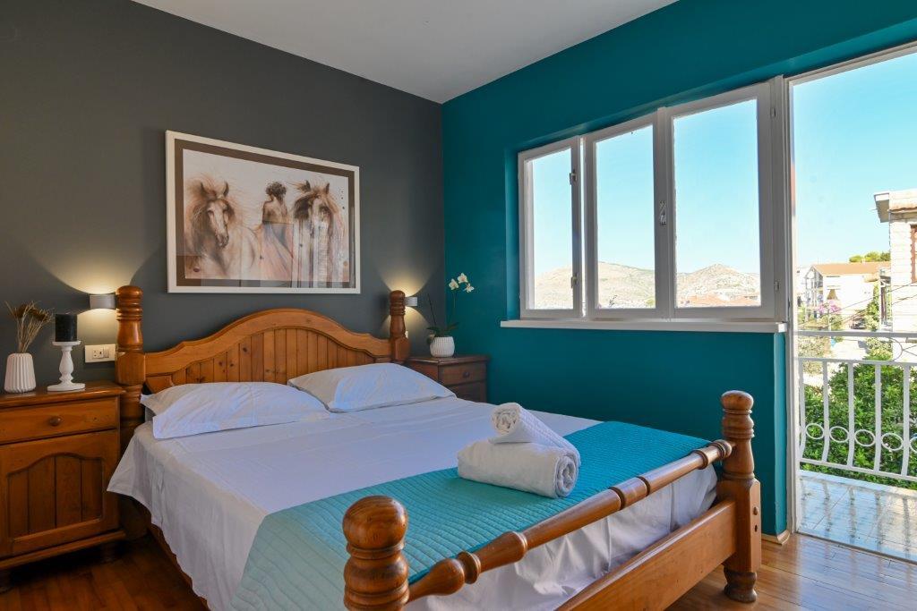 To je hiša z tekskluzivna stanovanj. To se nahaja v privlačen del mesta. Južni strani otoka Čiovo (z mostom povezan z obalo in lepe mesta Trogir (UNESCO)). Hiša se nahaja v Mirnyi soseski, stran od morja (plaže z borovci), nekaj 200m od atraktivni mestni plaži v Okrug Gornji približno 700m. Oddaljenost od restavracij in trgovin je bila zaključena 150m, bolnišnica, pošta in vsi objekti se nahajajo v centru mesta, ki se nahaja približno 15 minut. hojo in nekaj 5 km od letališča Split (ponujajo prevoz od letališča po predhodnem dogovoru z lastniki). Hiša ima dva apartmaja. Vsak je v celoti opremljen in ima čudovit pogled na morje. Ena je kategoriziran s 4 zvezdicami. To se nahaja v pritličju ima teraso in dva balkona. 2 spalnici, dnevna soba s kavčem, jedilnico in kuhinjo ter 2 kopalnici. Opremljen s popolnoma (klimatsko napravo, brezžični internet, satelitsko televizijo, pralni stroj, vsi gospodinjski aparati, parkirišče ... a. Drugi je kategoriziran s 3 zvezdicami. Je prva