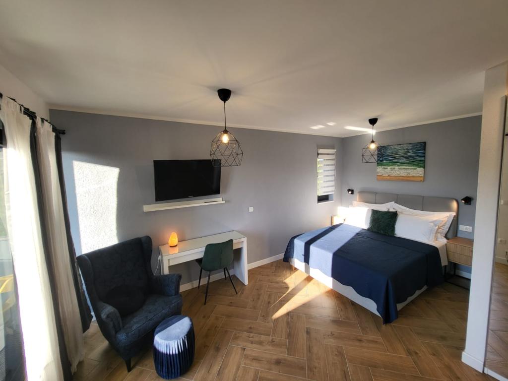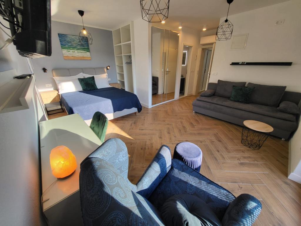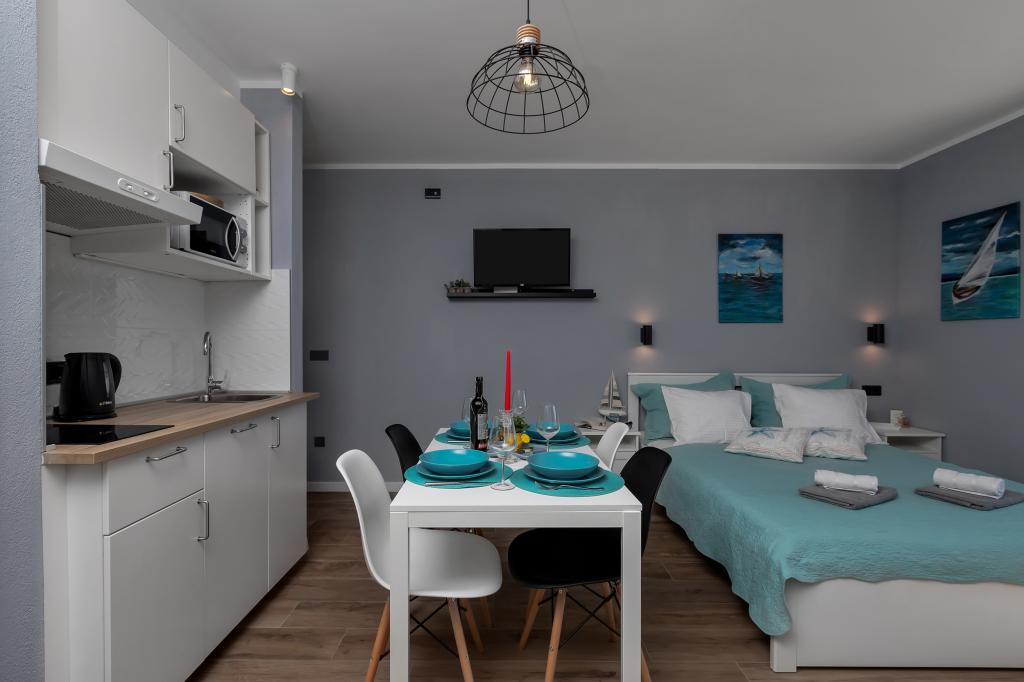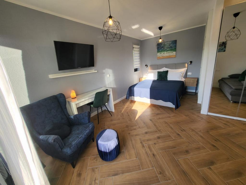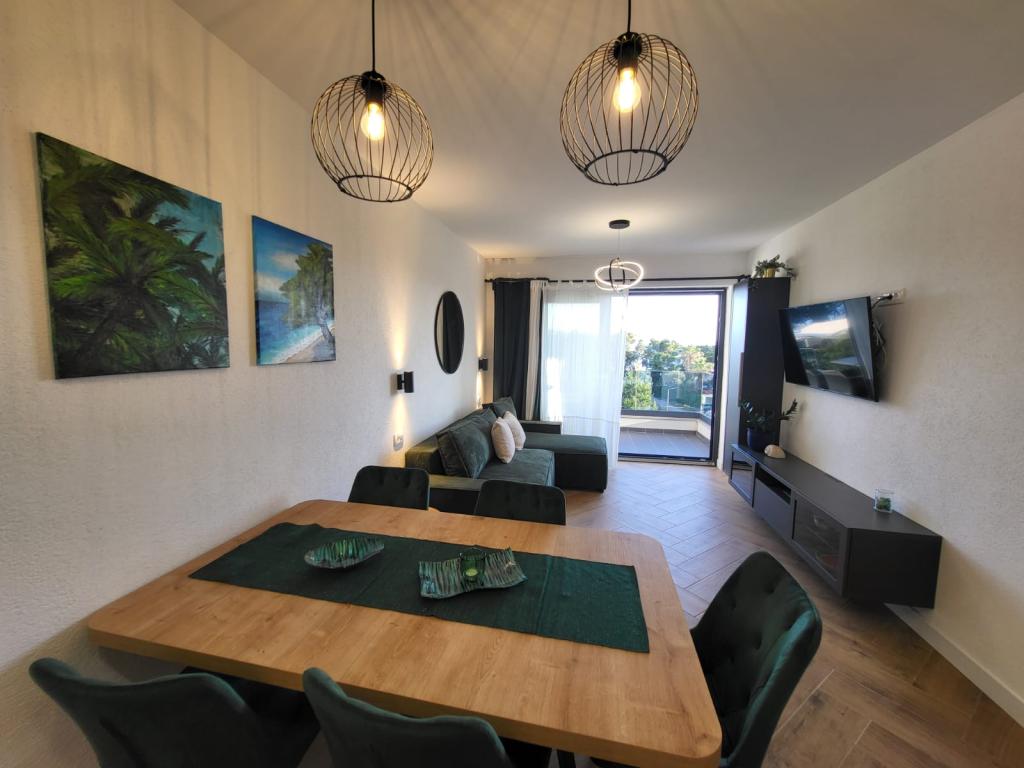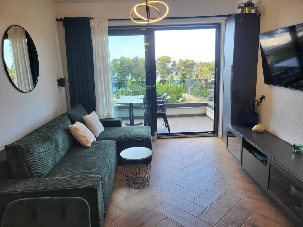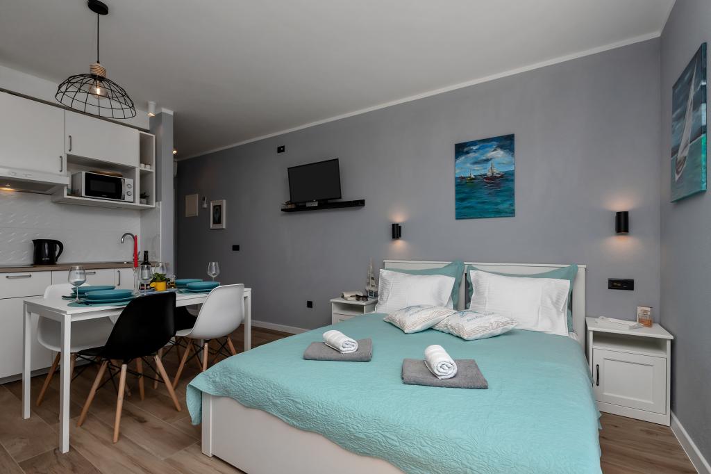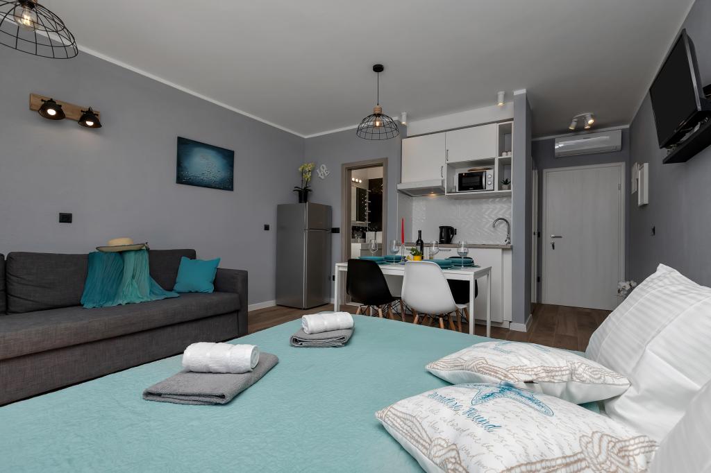 Moderno opremljeni apartmaji se nahajajo v prvi vrsti do morja. Objekt se nahaja nekaj minut hoje od plaže. Na tej lokaciji okoli objekta trenutno ni drugih hiš. Parkiranje je brezplačno, garaža pa je na voljo z doplačilom, odvisno od razpoložljivosti. Topel sprejem in prijetno bivanje vsem gostom.