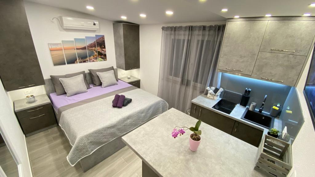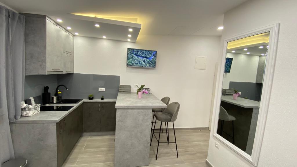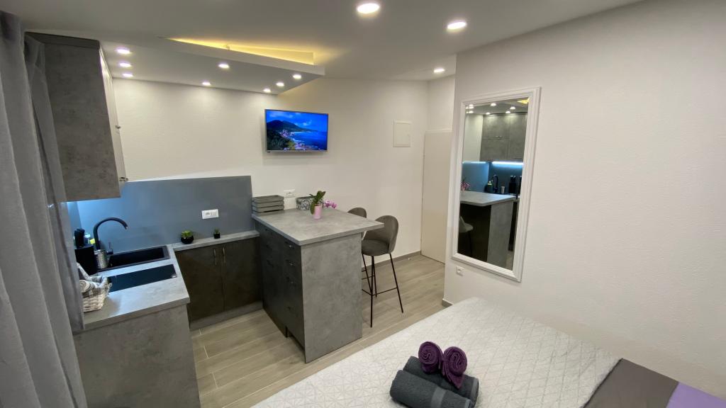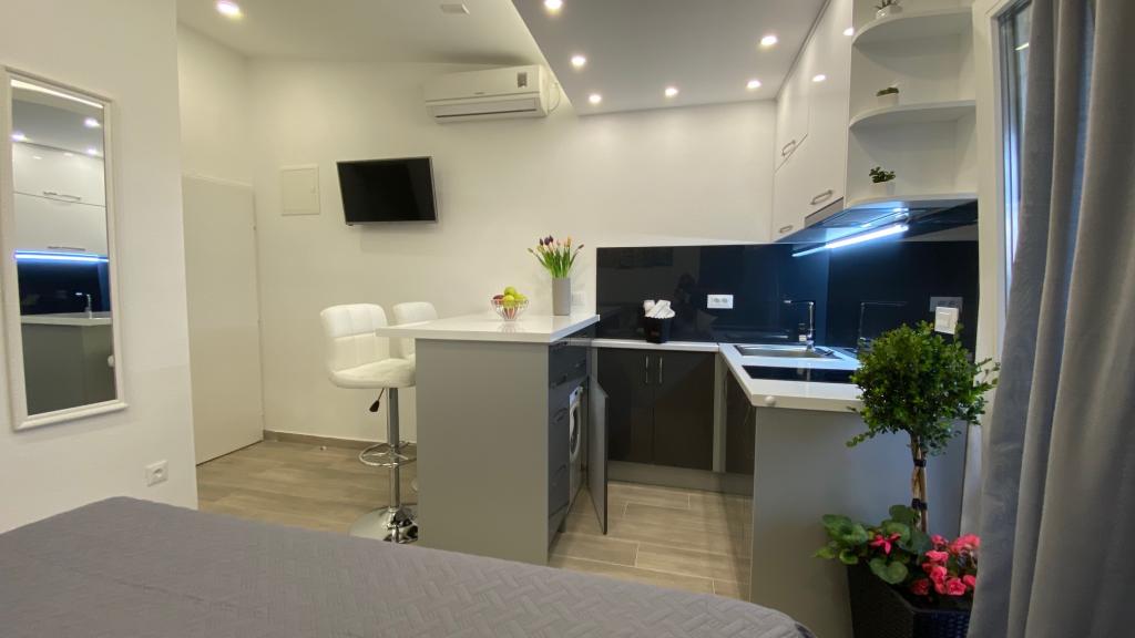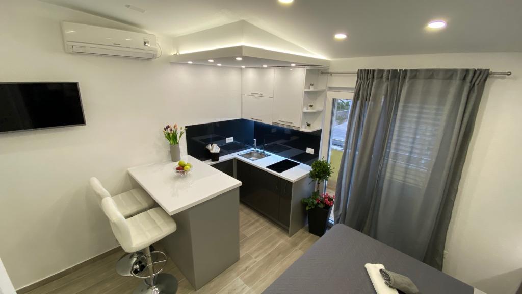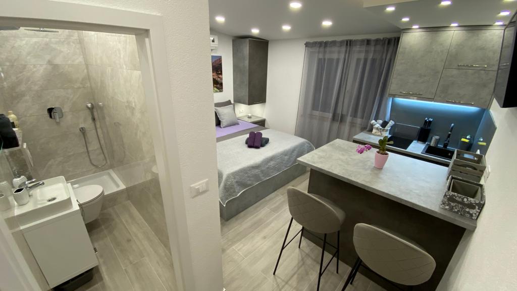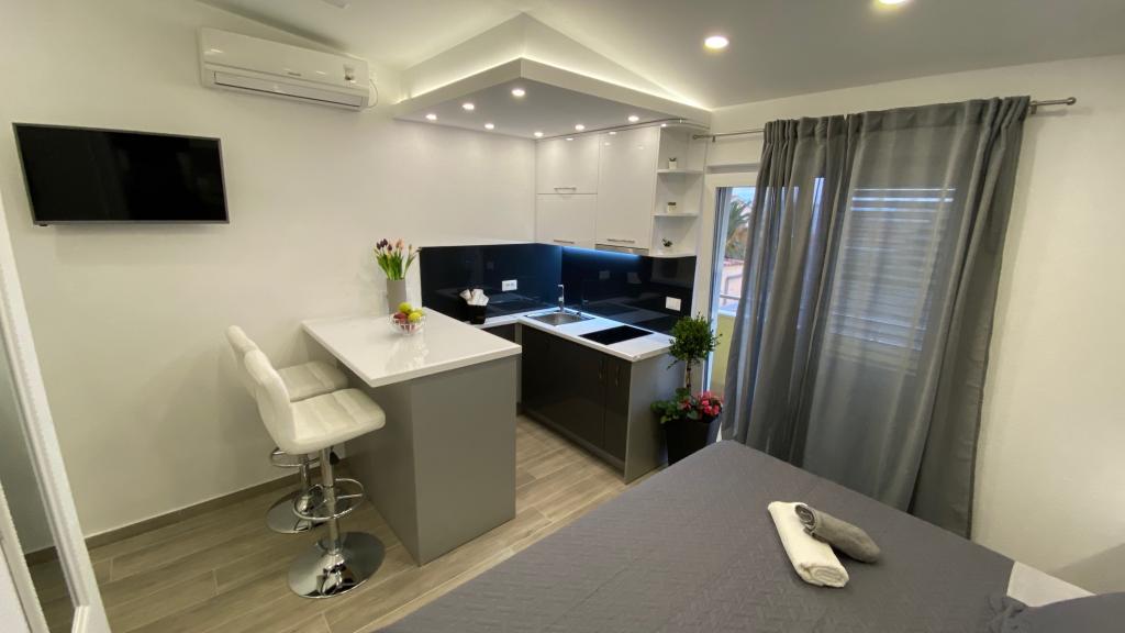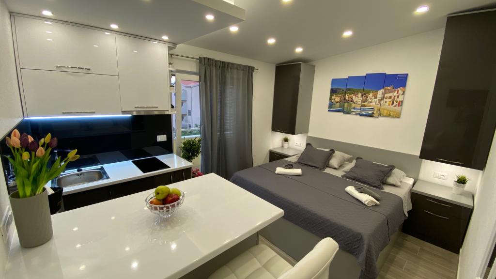 Luksuzno opremljen studio apartma **** za 2 osebi ponuja vse, kar lahko pričakujete, in še več. Moderno pohištvo, kuhinja z barom, barski stolčki, fantastična LED osvetlitev, vsi mogoči aparati, pametna televizija, klima, balkon s pogledom na morje in otroško igrišče, vse je izjemno lepo in čisto. Domačini so fenomenalni ljudje. Zelo prijazni, nasmejani, prijazni. Prvič ste tam in imate občutek, kot da ste prišli do dobrih, starih, prijateljev. In morje in plaža ... 100 metrov od apartmaja, pa tudi center mesta s trgovinami in restavracijami. Vse je na dosegu roke, pa vendar se sama namestitev nahaja v mirnejšem delu soseske. Neverjetna kombinacija! Absolutno vsa priporočila !!!