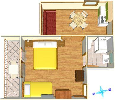 Apartma za dve osebi, možnost dveh dodatnih ležišč (25 m2)