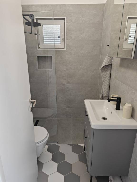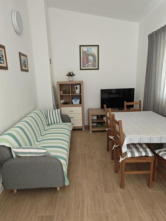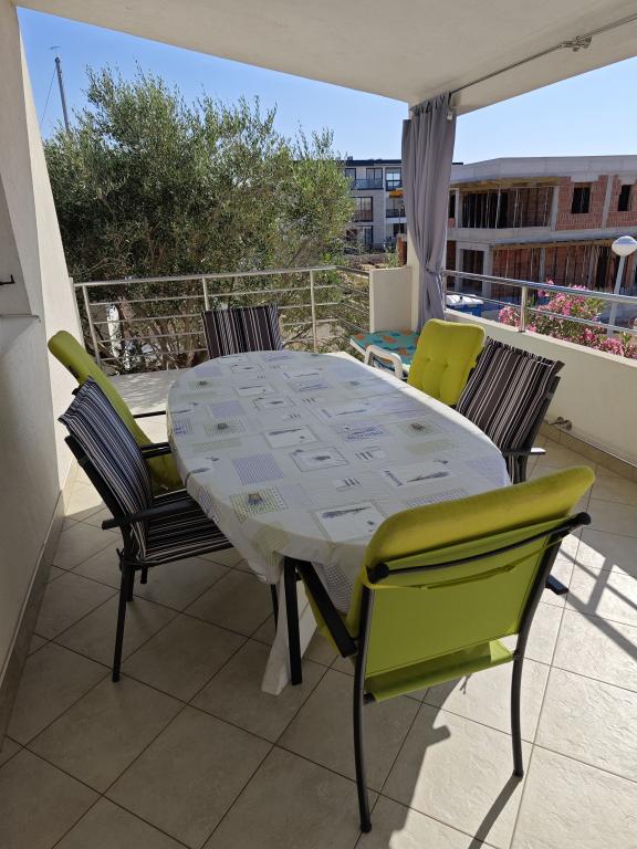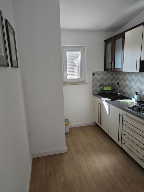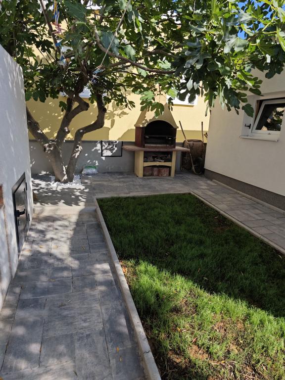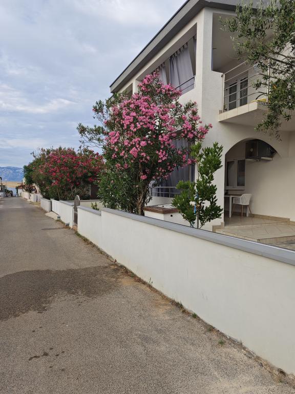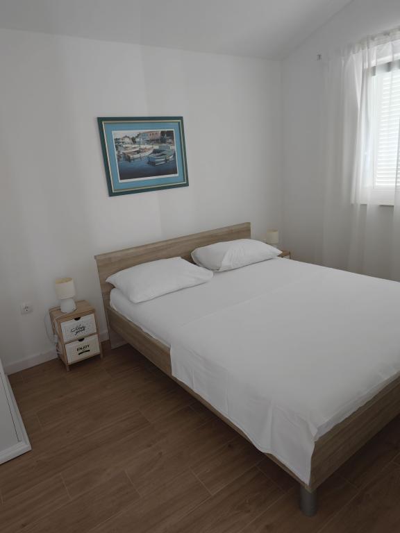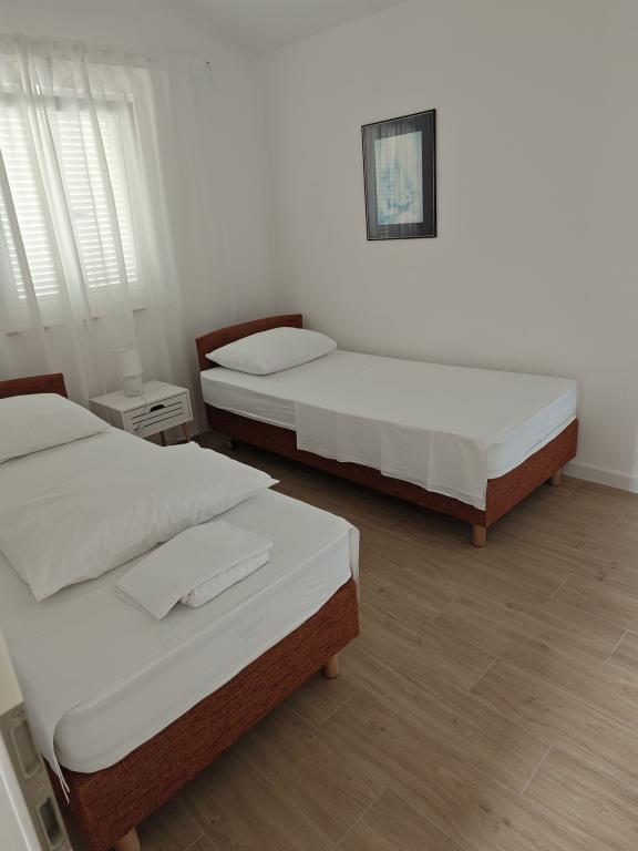 Mi najem apartmaja v hiši, prvo nadstropje, ločen vhod, parkirišče v dvorišču. Apartma je sestavljen iz dveh sob, - Ena z zakonsko posteljo in - Druga z dvema ločenima ležiščema, - Dnevna soba s kavčem, TV, klima - V celoti opremljena kuhinja, - Kopalnica s tušem, - Velika terasa, parkirišče in žar Prenovljene, klimatizirane, 100 metrov od morja, za 5 oseb.