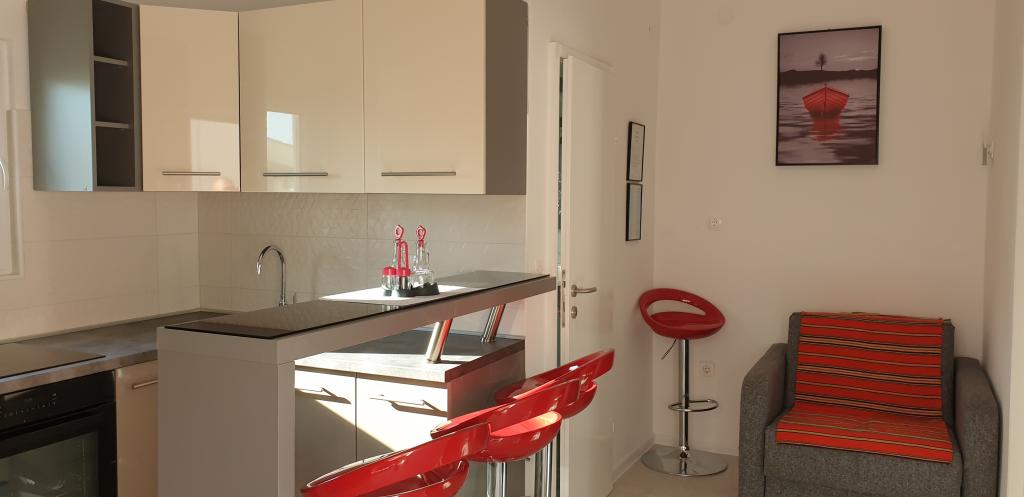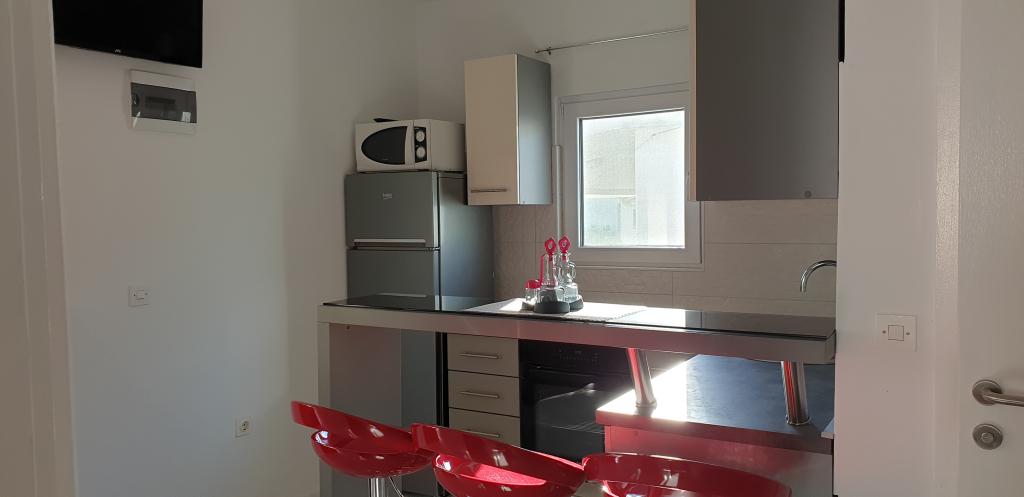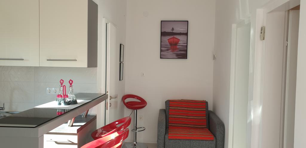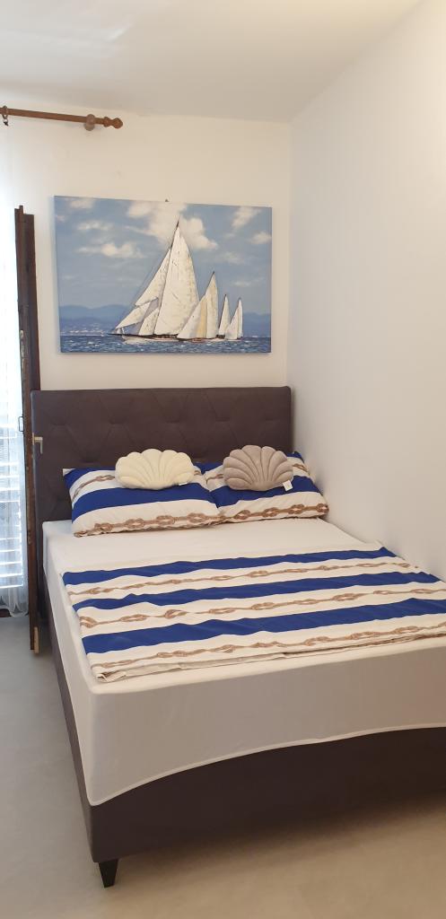 Popolnoma opremljen apartma, TV, klima, wi-fi, indukcijska kuhalna plošča, pečica, mikrovalovna pečica, kuhalnik vode, pomivalni stroj. Apartma je v zgornjem nadstropju, sestavljen iz kuhinje, kopalnice in dveh spalnic, ena z zakonsko posteljo in druga z dvema ločenima posteljama, ki vodita na teraso s pogledom na morje. Center je oddaljen približno 2 km po promenadi ob morju, trgovina je oddaljena 300 metrov, restavracija pa 30 metrov. Veselimo se vašega obiska in smo vedno na voljo za vprašanja in rezervacije.