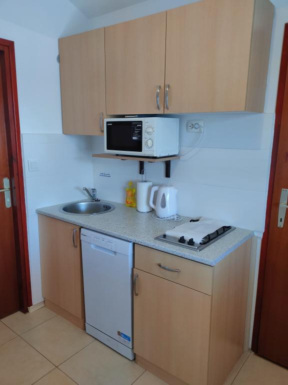 Popolnoma opremljen studio apartma z dvema spalnicama, kuhinjo, kopalnico in veliko teraso, ki ima neposreden pogled na morje. Sredstva so 3 parkirna mesta in žar za goste. Peščena plaža primerna za družine z majhnimi otroki, je le 100 metrov od apartmaja, na plaži pa je majhno kavarno.