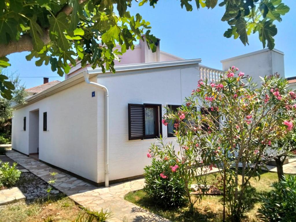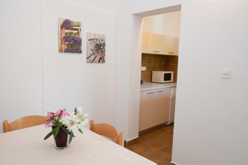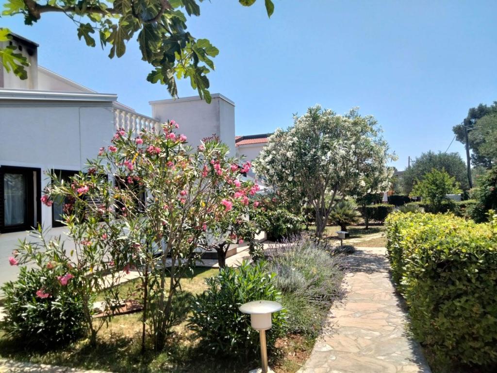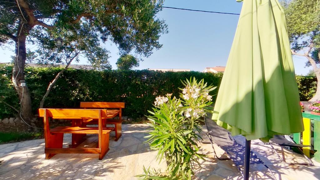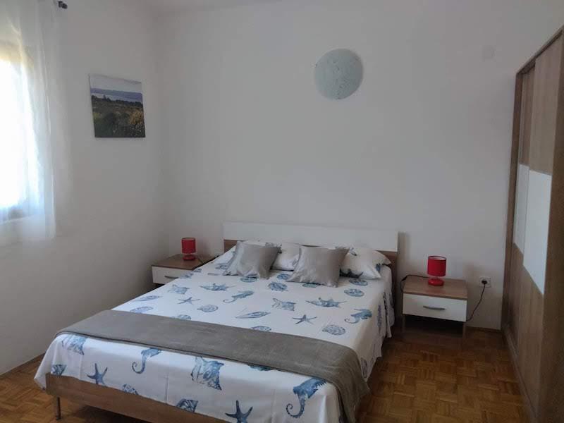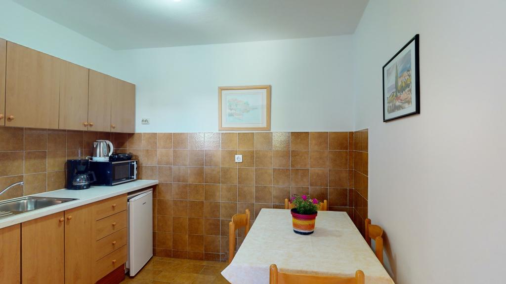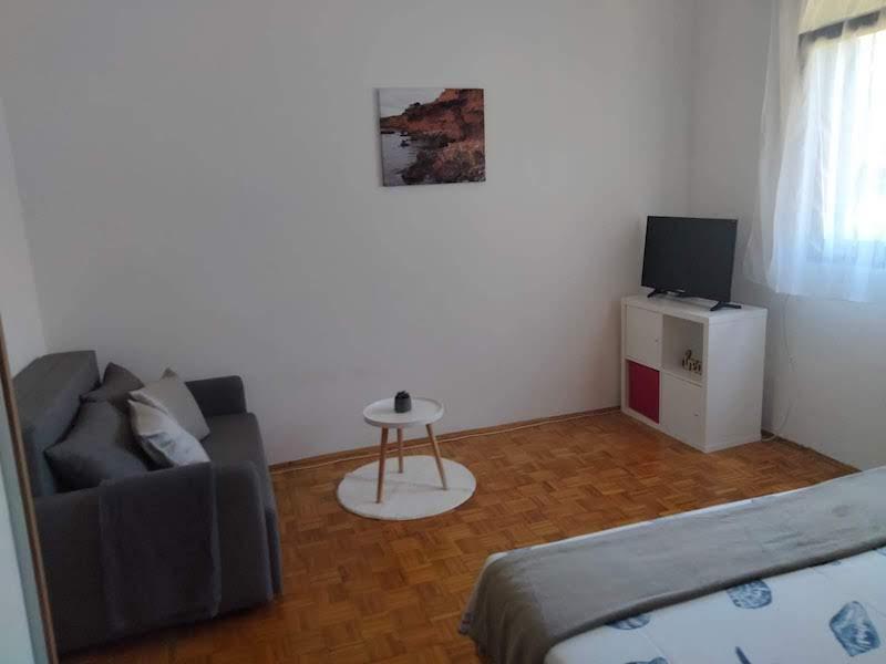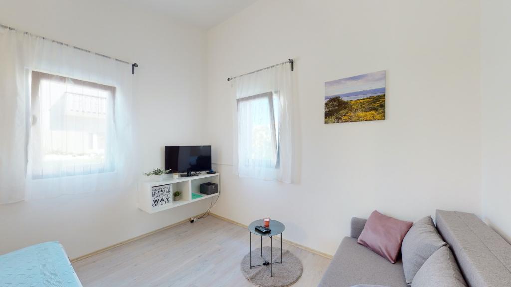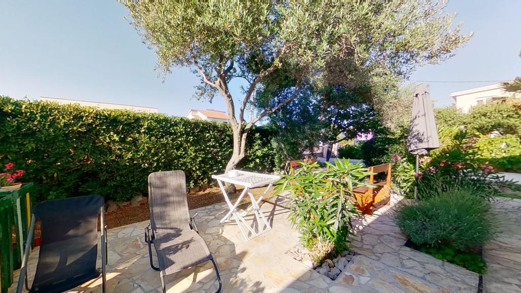 Popolnoma opremljeno stanovanje v pritličju. Pred stanovanjem je 40 m2 kamnita terasa, obdana z zelenjem. Parkirišče in žar na dvorišču stavbe. V radiju 250 m je na voljo vse za prijetno bivanje: plaža, center, tržnica, restavracija.