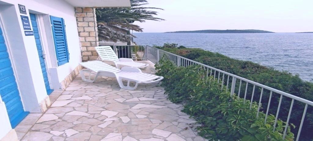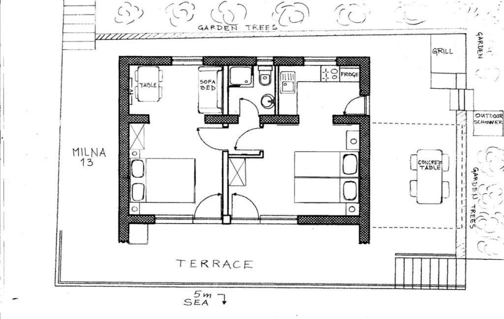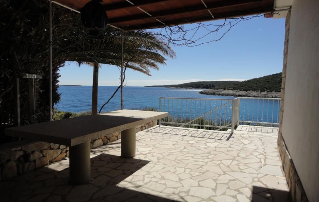 Celotna hiša se oddaja v najem, 5 m od morja: izjemna lokacija - prva vrsta do morja, zaliv Milna (otok Vis), idealno za družino. Hiša je samostojna, z notranjo površino 50 m2, obdana s 60 m2 teraso in vrtom (150 m2) z zelenjem, ki vam zagotavlja zasebnost in prijeten oddih. Tik ob hiši, 5 metrov od terase, se lahko kopate, potapljate ali skačete v morje. Ko se vrnete z morja, je na voljo zunanji tuš. Na terasi sta dva ležalnika, žar in betonska miza za sedenje in jedilnico s pogledom na modro morje, v katerem lahko uživate ves dan. Del terase nad mizo in žarom je pokrit, kar zagotavlja senco/zaščito ves dan. Hiša je klimatizirana, ima neomejen Wi-Fi internet, LCD TV, štedilnik s plinskim in električnim kuhalnikom, velik hladilnik (250 litrov) z zamrzovalnikom in vse ostalo, kar potrebujete za kuhanje/peko in serviranje. Zasebno parkirišče je 250 m od hiše: ob obali, do hiše, vodi betonska pešpot (širine 2-3 m). Na voljo: do 10.06.; 24.06. - 5.07.; in od 20.08.