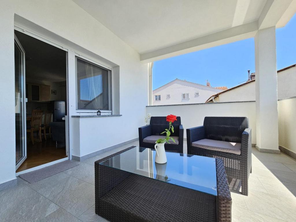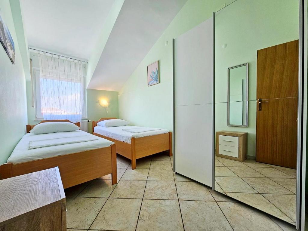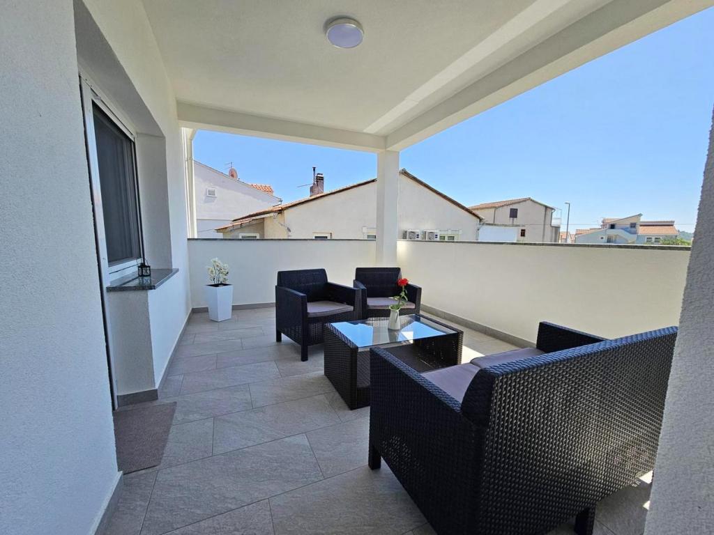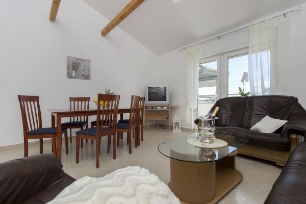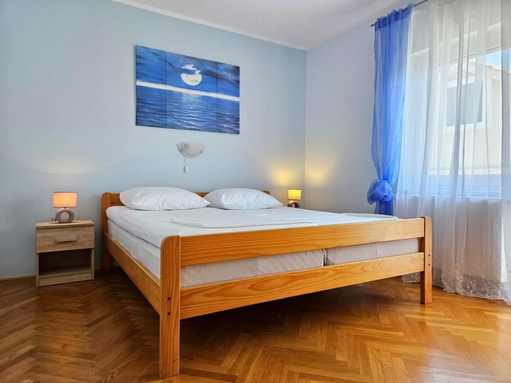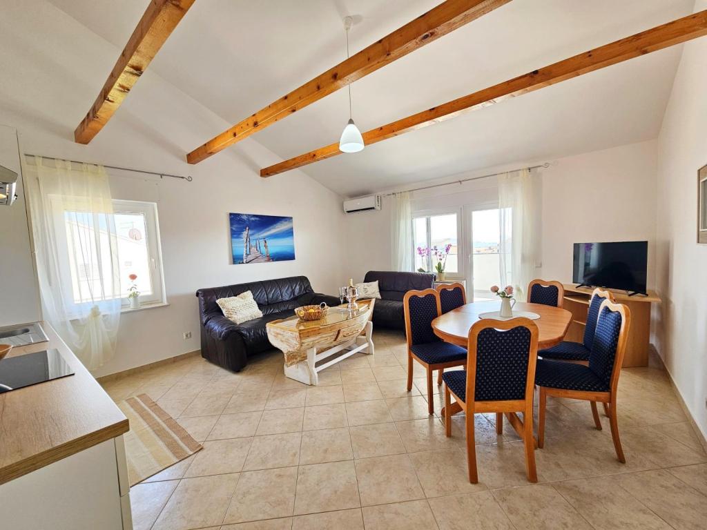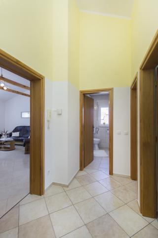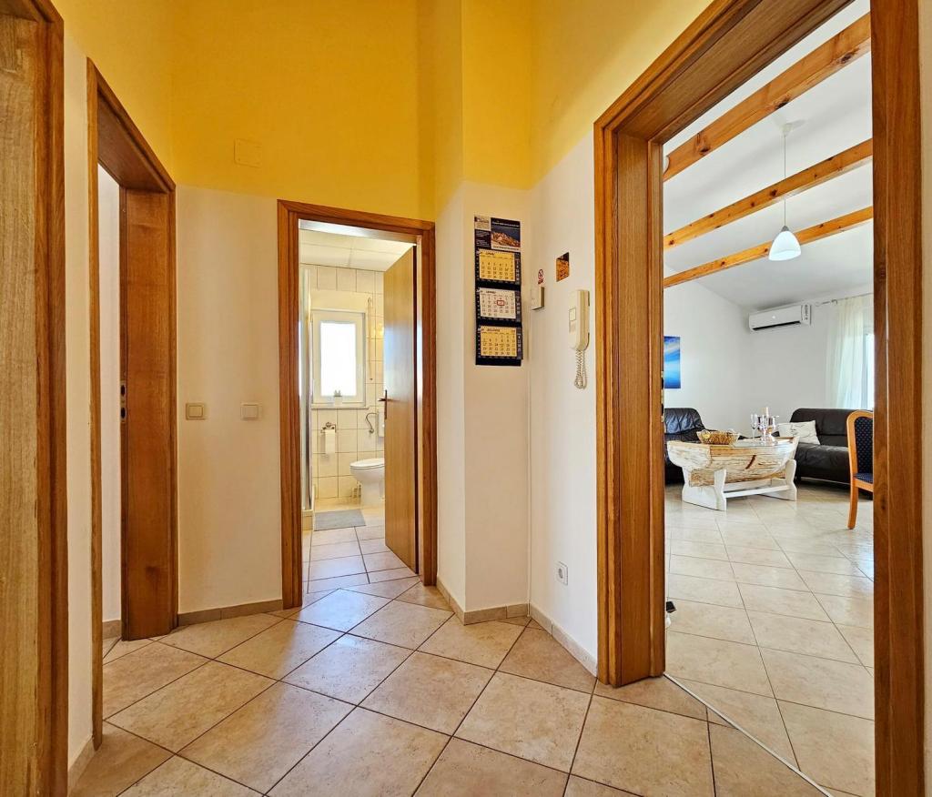 NOVO!!! Dobrodošli naši dragi gostje v prenovljenih prostornih apartmajih velikosti 70 m2 v družinski hiši: velika dnevna soba povezana s kuhinjo in jedilnico ter izhodom na veliko teraso 16 m2 s pogledom na morje; spalnica z zakonsko posteljo in dodatnim balkonom, druga spalnica z 2 ločenima posteljama, velika kopalnica in hodnik. V istem nadstropju 2 popolnoma enaki stanovanji z novozgrajenimi velikimi terasami! Objekt se nahaja 3 minute od plaže in prve trgovine. Udobno in prostorno! Čisto in urejeno! V sklopu objekta je varno in pokrito parkirišče. WiFi, klima, SAT TV, žar, zunanji tuš, varovano parkirišče in turistična taksa vključena v ceno! Za vse dodatne potrebe so vam prijazni gostitelji vedno na voljo!