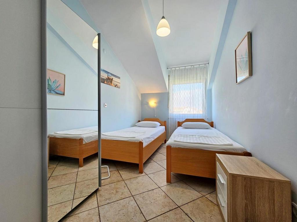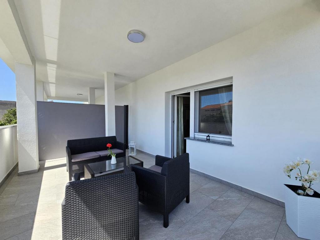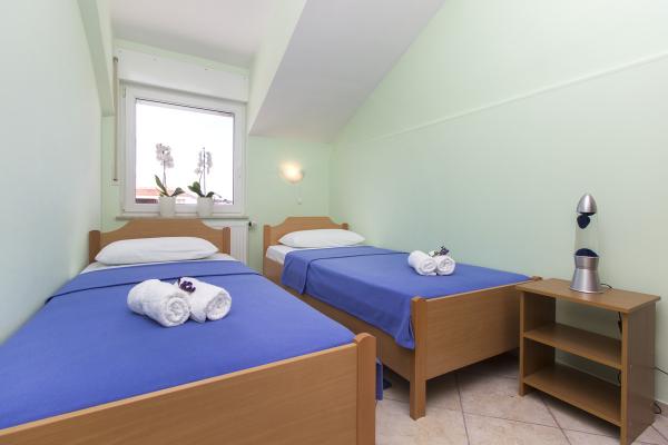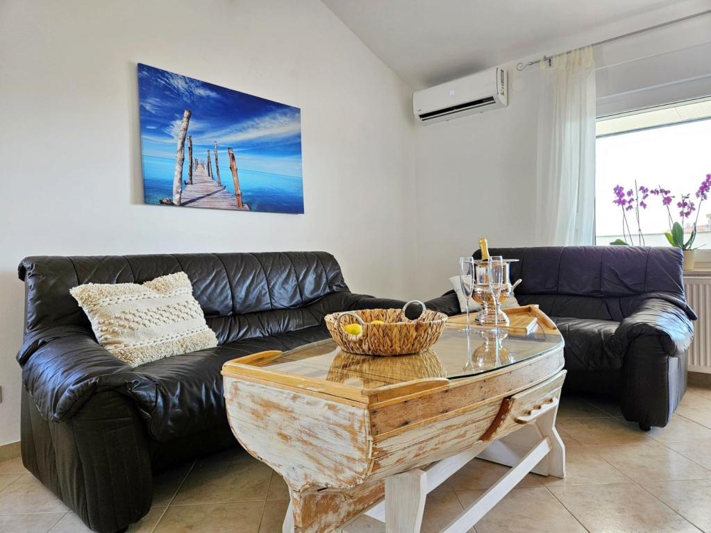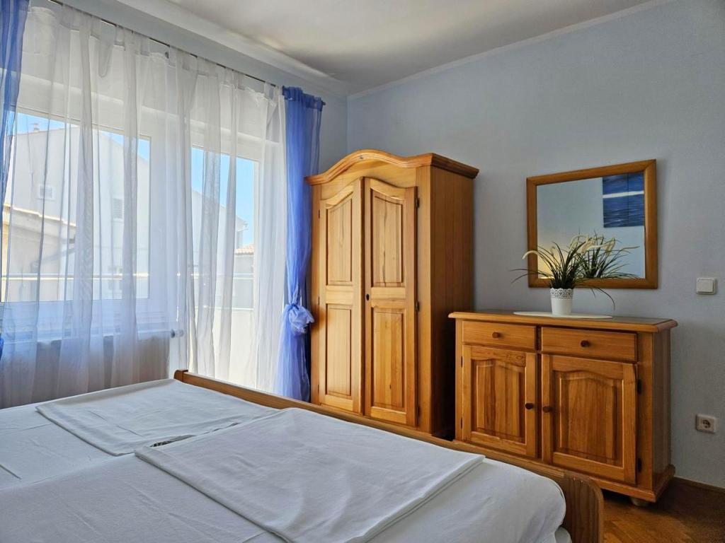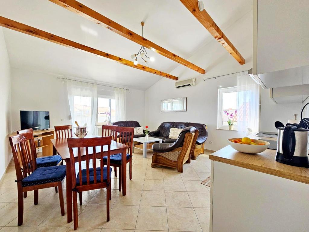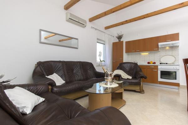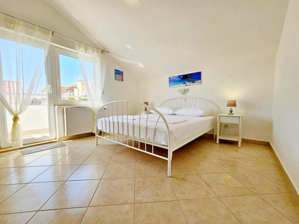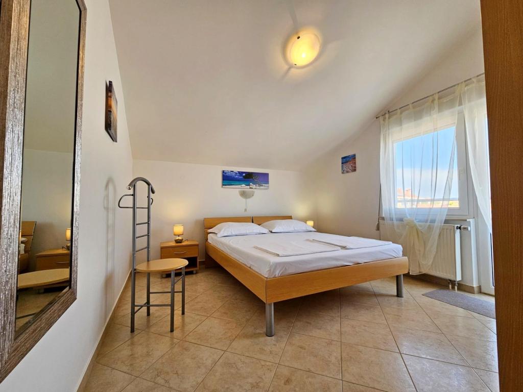 NOVO!!! Dobrodošli naši dragi gostje v prenovljenih prostornih apartmajih velikosti 70 m2 v družinski hiši: velika dnevna soba povezana s kuhinjo in jedilnico ter izhodom na veliko teraso 16 m2 s pogledom na morje; spalnica z zakonsko posteljo in dodatnim balkonom, druga spalnica z 2 ločenima posteljama, velika kopalnica in hodnik. V istem nadstropju 2 popolnoma enaki stanovanji z novozgrajenimi velikimi terasami! Objekt se nahaja 3 minute od plaže in prve trgovine. Udobno in prostorno! Čisto in urejeno! V sklopu objekta je varno in pokrito parkirišče. WiFi, klima, SAT TV, žar, zunanji tuš, varovano parkirišče in turistična taksa vključena v ceno! Za vse dodatne potrebe so vam prijazni gostitelji vedno na voljo!
