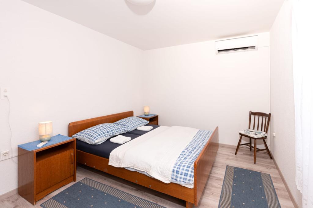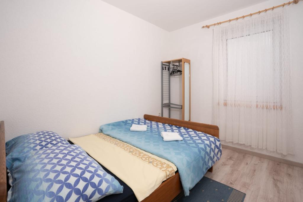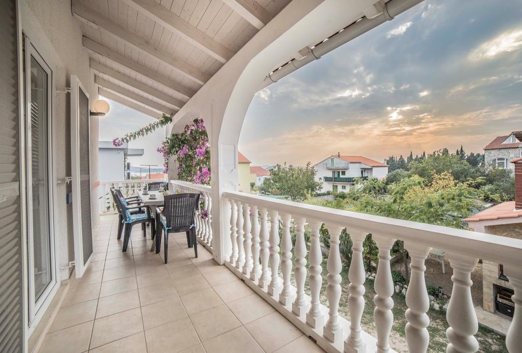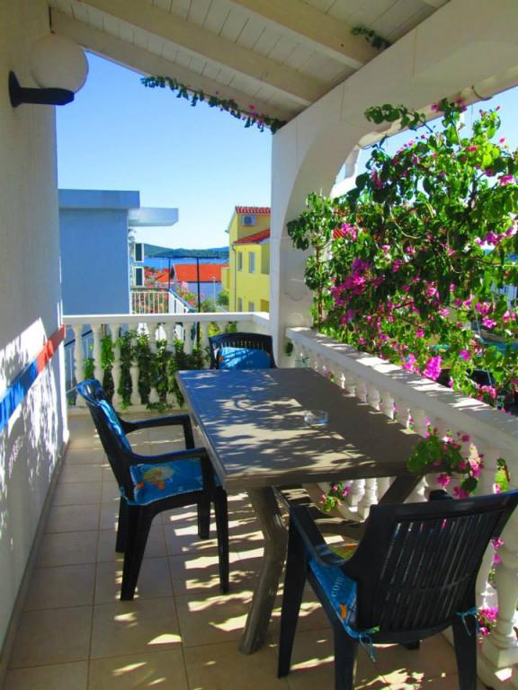 Popolnoma opremljeni trisobni apartmaji, velikosti 90 m², s pogledom na morje, so primerni za 4–6 oseb. Gostom je na voljo veliko pokrito parkirišče za do 4 avtomobile, žar in ražanj na dvoriščni terasi. Apartmaji se nahajajo 500 m od centra mesta, plaža pa je oddaljena 5–10 minut hoje (približno 400 m). Cena apartmajev vključuje Wi-Fi internet, klimatsko napravo, pokrito parkirišče, uporabo žara in turistično takso. Apartmaji so namenjeni predvsem družinam. Vse zainteresirane goste vljudno prosimo, da pred oddajo povpraševanja preverijo razdelka »Razpoložljivost« in »Cenik«. Telefonske rezervacije niso možne. Hvala za razumevanje.