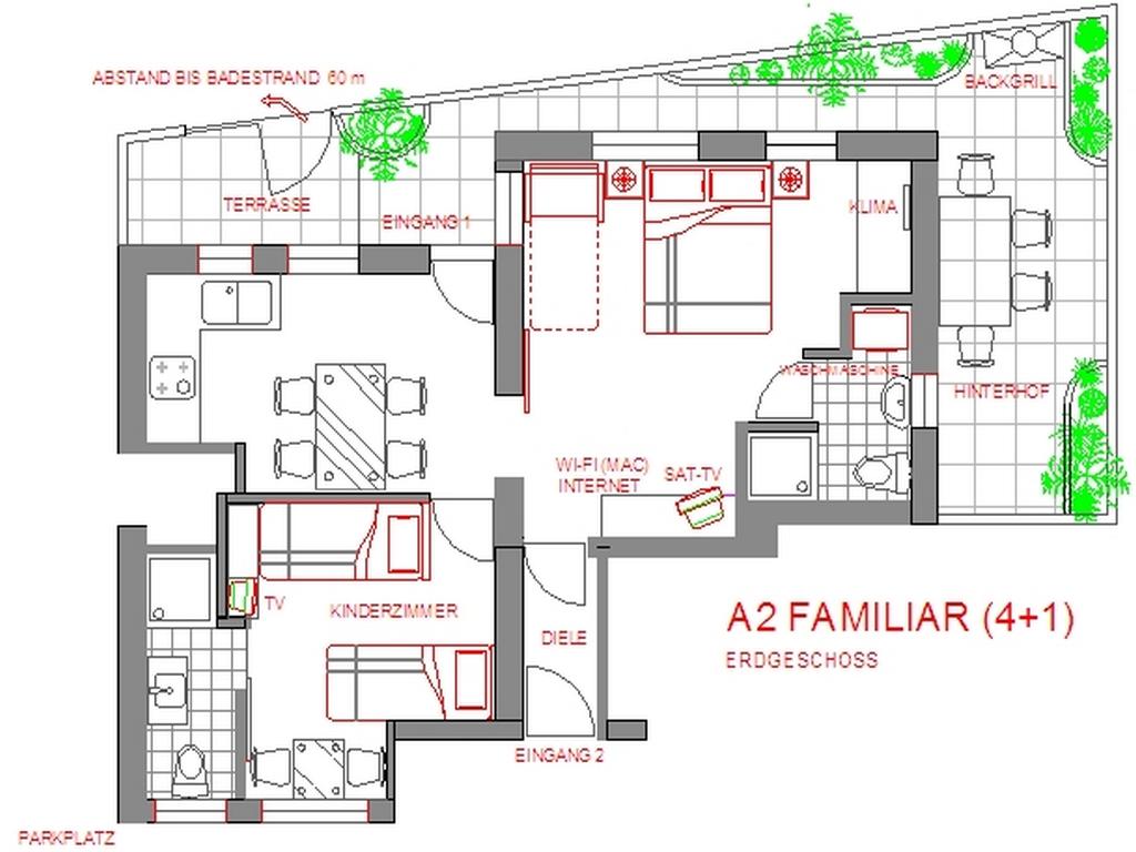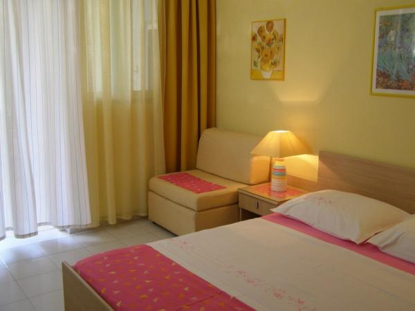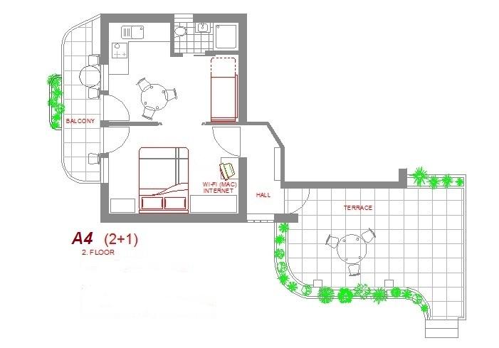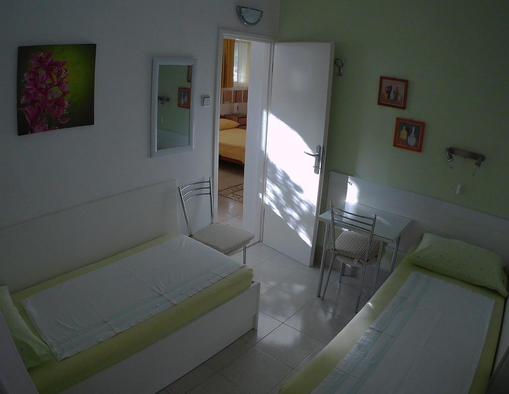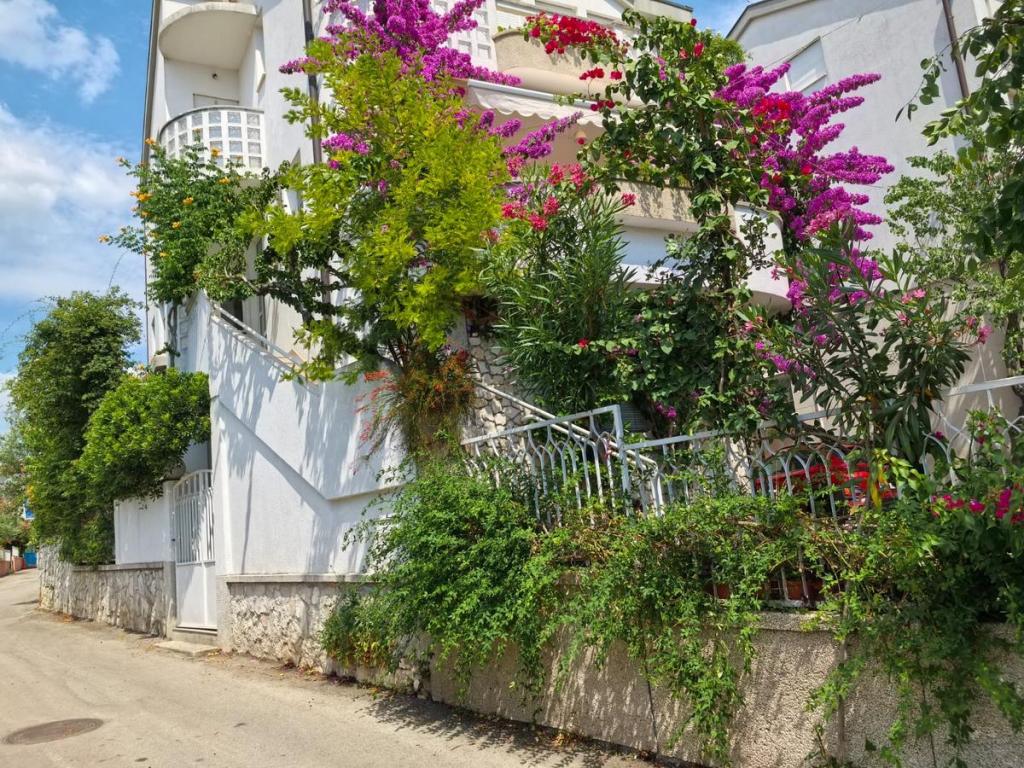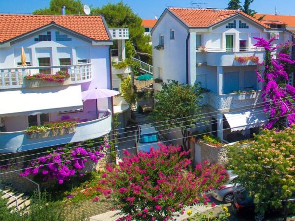 Le štirideset metrov od plaže, v prvi vrsti do morja, imate pravo mesto za počitek. Apartmaji v cvetju, s pogledom na morje, imajo ločene vhode, klimo, wi-fi, televizijo in varovano parkirišče na dvorišču. Apartma A2 v pritličju je prava izbira za družine s 4-5 osebami. Apartma ima 2 kopalnici z okni, 2 TV-ja, pomivalni stroj, pralni stroj in ločeno dvorišče za hišo za bivanje na prostem. Na dvorišču je žar, miza s stoli in senčnikom ter linija za sušenje perila. Apartma A3 v pritličju je dobra izbira za oddih za 2 do 3 osebe. Ima dostopno ložo v cvetju z mizo za bivanje na prostem s pogledom na morje. Apartma A4, v drugem nadstropju, za 2-3 osebe, ima veliko teraso in balkon s pogledom na morje in mesto. Terasa je pokrita in opremljena z vrtno garnituro. Apartma Par v 1. nadstropju je idealen za pare. Pokrita terasa ima stalen pretok zraka in lep razgled.
