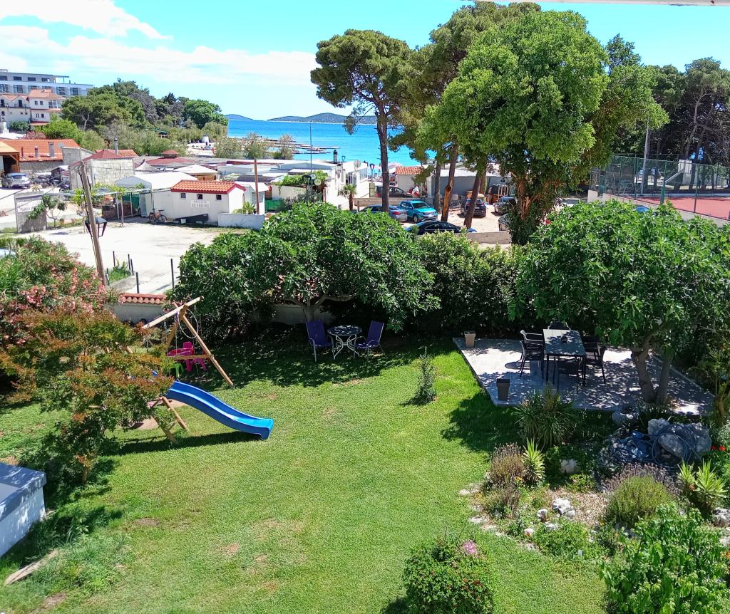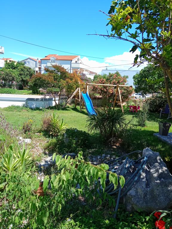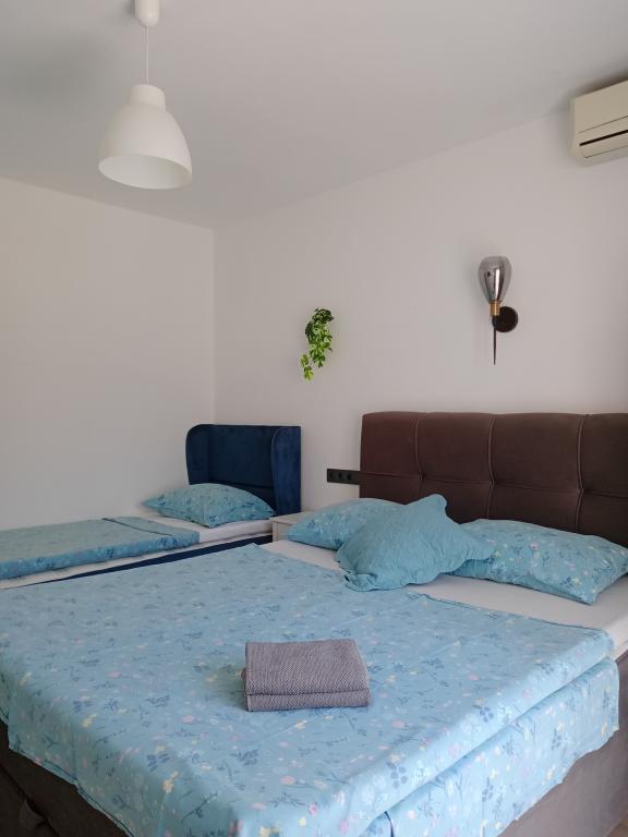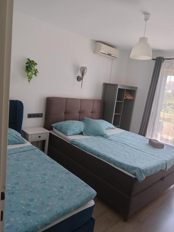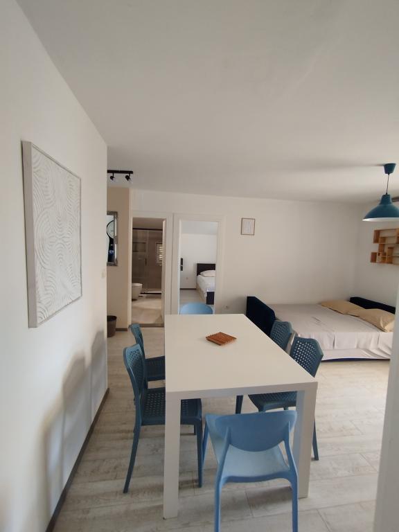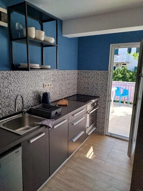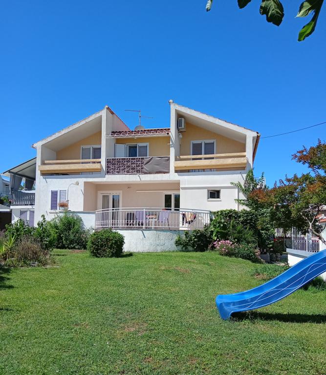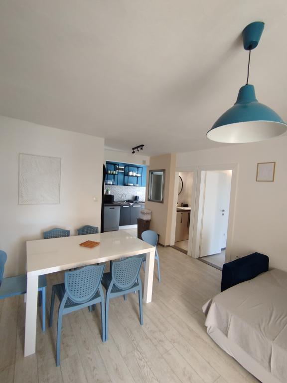 Apartmaji Blue Beach, ki se nahaja v mirnem delu mesta, na plaži, Riva. Center in drugih objektov je le 5 minut hoje. Vsi apartmaji imajo pogled na morje, borovim gozdom in lepim vrtom. Apartmaji so lepo opremljeni z vso potrebno opremo. Možnost uporabe, vrt, žar in otroško igrišče. parkirišče v dvorišču.