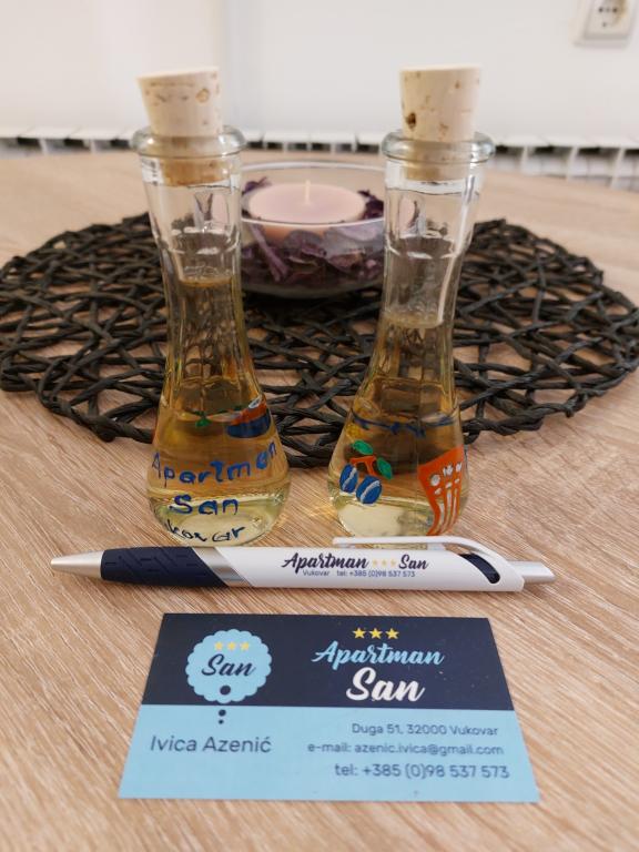 Če želite Vukovar obiskati z družino, poslovnimi partnerji ali prijatelji, smo vas pripravljeni gostiti. Apartma SAN je samostojna stanovanjska enota v pritličju družinske hiše z ločenim vhodom, kjer se nahaja tudi lastniško stanovanje. Apartma je od središča Vukovarja oddaljen 800 metrov, prva trgovina in pekarna pa le 150 metrov. Apartma je sestavljen iz hodnika, dveh ločenih spalnic, ene dvoposteljne z možnostjo povezave z veliko zakonsko posteljo in ene enoposteljne sobe, opremljene z vso posteljnino. Vsaka soba ima svoje omare, nočne omarice, namizne svetilke ter mizo in stol. Dnevna soba, v kateri je raztegljiv kavč, ki je primeren tudi za spanje do dveh oseb, TV (satelitska), radio, klimatska naprava in brezplačen Wi-Fi dostop do interneta. Gostom je na voljo tudi jedilnica, kuhinja opremljena z vsemi kuhinjskimi pripomočki in opremo (hladilnik, pečica, kuhalna plošča, mikrovalovna pečica, kuhalnik vode, napa).