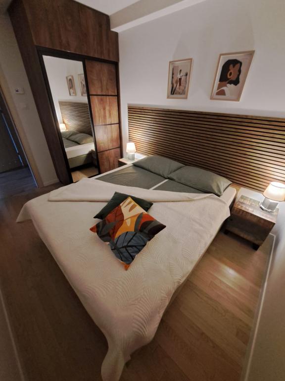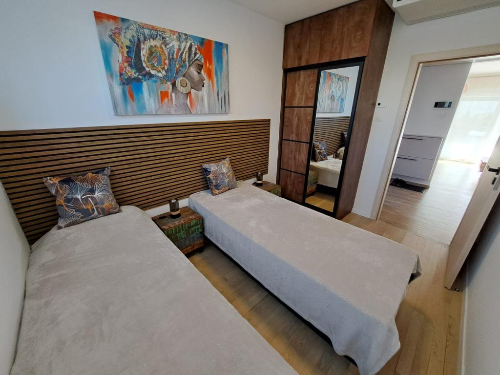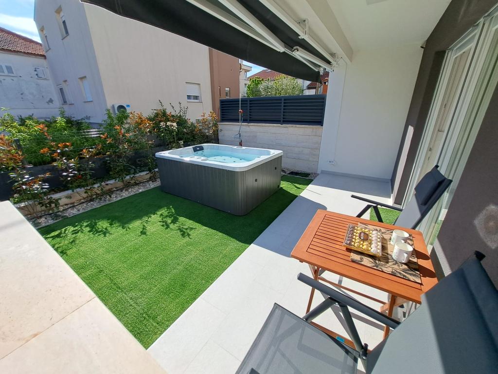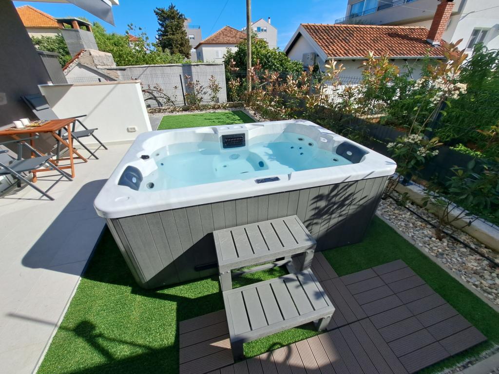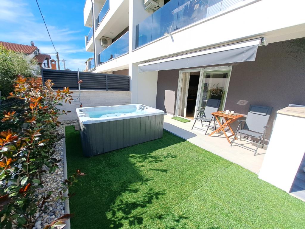 Apartma se nahaja v pritličju stavbe v mirnem naselju Stanovi v Zadru, ki ga ne obiščejo množice turistov. V neposredni bližini (peš dostop) se nahajajo trgovine, restavracije, kavarne in Športno rekreacijski center Višnjik - vse, kar potrebujete za bivanje, brez potrebe po uporabi avtomobila. Apartma ima ločen vhod iz lastnega vrta (cca. 55m2), kjer je gostom na voljo zasebni jacuzzi. Vrt je obdan z zelenjem. Apartma je sestavljen iz dnevne sobe s kuhinjo in jedilnico, 2 spalnici (vsaka ima eno zakonsko posteljo, ki se lahko loči v dve enojni postelji), kopalnico s tušem in pokrito ložo (cca. 7m2). Del vrta z masažno kadjo lahko zasenčite z avtomatskim senčilom. Pred stavbo imamo 2 zasebni parkirni mesti. (brez doplačila) Ponujamo tudi lastno polnilnico za električne avtomobile. (doplačilo)