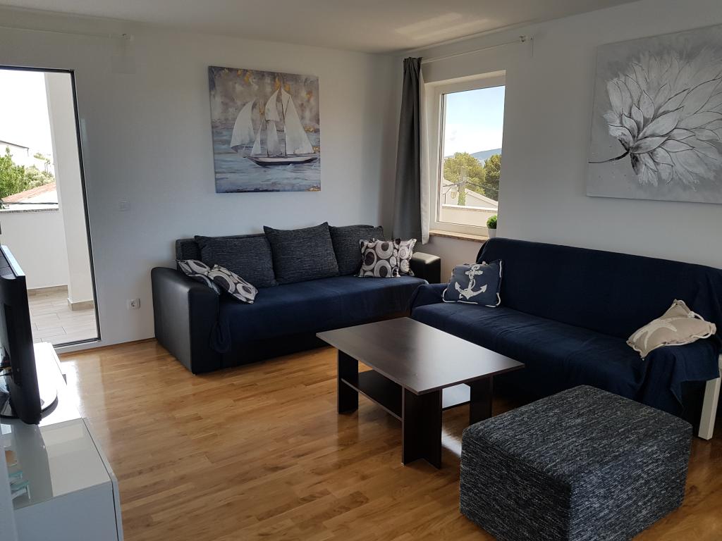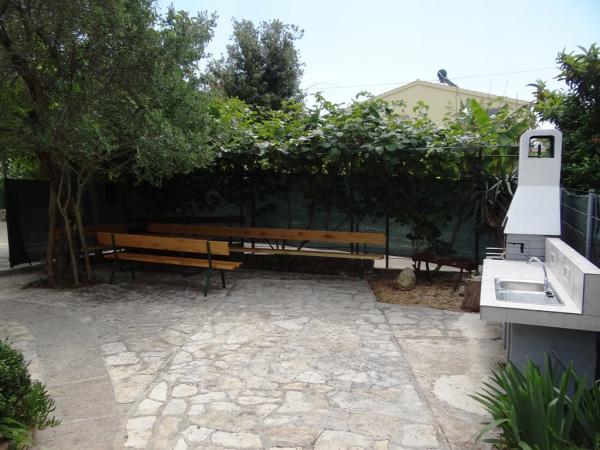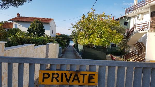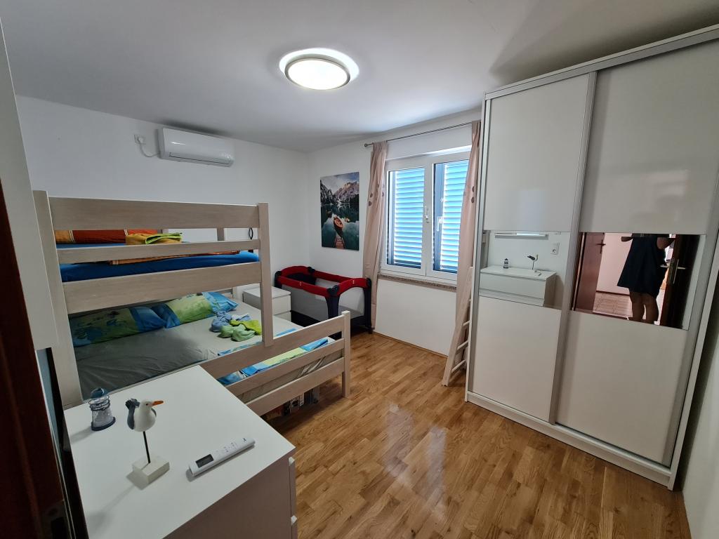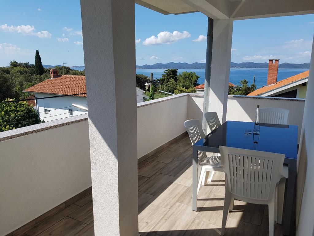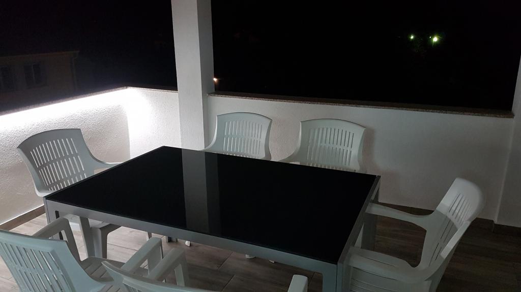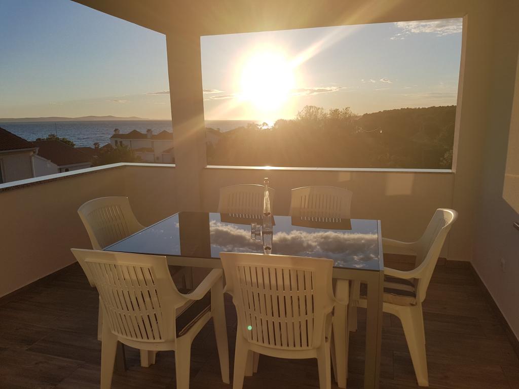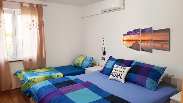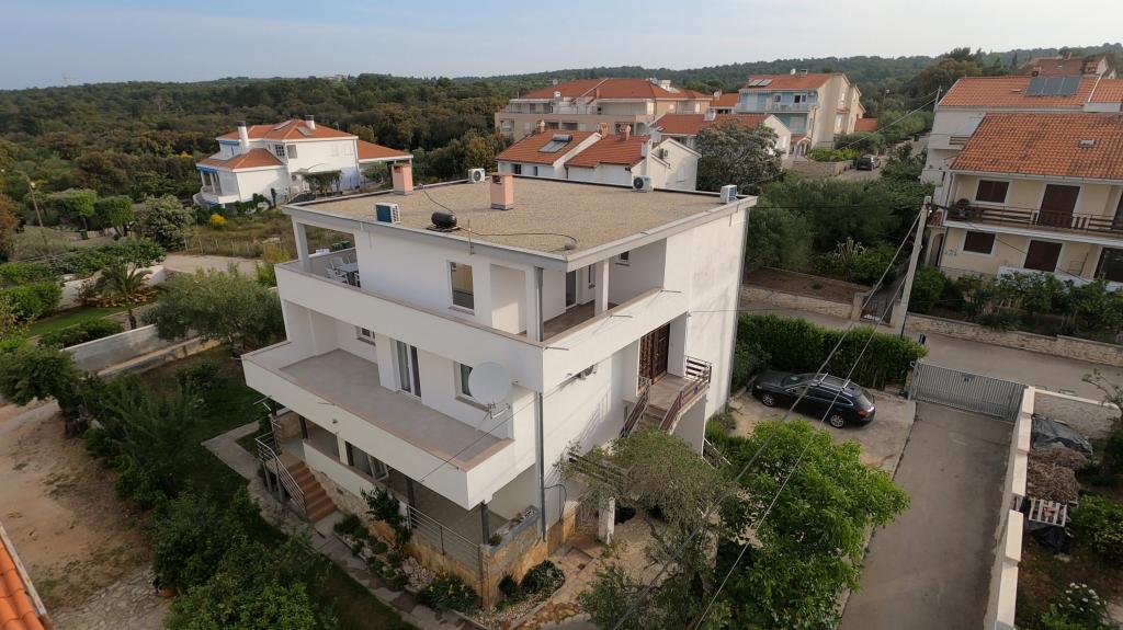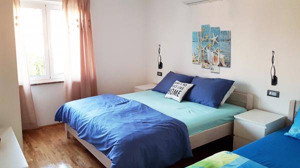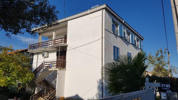 Apartma se nahaja na mirni lokaciji, 40m od plaže. Ima površino 140m2 s 3 spalnicami, 1,5 kopalnicami, kuhinjo, dnevno sobo in dvema terasama s pogledom na morje. Odlično je za velike družine ali 2 družini, ki nimajo nič proti skupnemu življenju in želijo malo prihraniti. Odlična je tudi za mlade pare, ki se želijo dobro zabavati. Je dovolj udoben za 10 oseb. Če jih mora priti več, je vse mogoče :) Stanovanje se nahaja v zgornjem nadstropju hiše na sliki, zato je razgled čudovit. Apartma je opremljen s: TV, satelitskim, DVD predvajalnikom, klimatsko napravo v vsaki sobi, pomivalnim strojem in pralnim strojem. Brezžični internet je v apartmaju brezplačen. Na vrtu sta žar in miza za namizni tenis. Parkirišče je na voljo na dvorišču. Ne živimo v hiši, zato boste večinoma sami. :)
