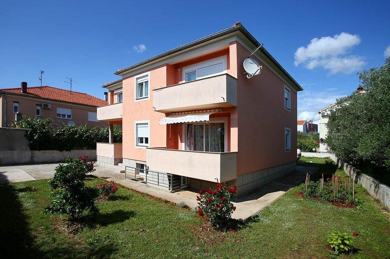 Hiša se nahaja v turističnem delu Zadra, Borik, kjer se nahajajo FALKENSTAINER skupine hotele, ki imajo peščeno plažo in vodni park in je na voljo s plačilom. Ulice so vse bistvene objekti iz veleblagovnice, restavracije in zabaviščni park za otroke. Hiša in vrt ima veliko prostora za otroško igro, žar je v delovanje z veliko leseno mizo in klopi za počitek s specialitetami z žara pozno v noč. Apartma je velik in udoben smo blizu plaže (3) 200 m. Apartma je sestavljen iz treh spalnica z dvema ležiščema, velika dnevna soba s kuhinjo, kopalnica, majhen WC in veliko teraso za jutranjo kavo, in smo DIJECIJE ležišče za pare z majhnimi otroki Mi lahko sprejme 6-8 oseb
