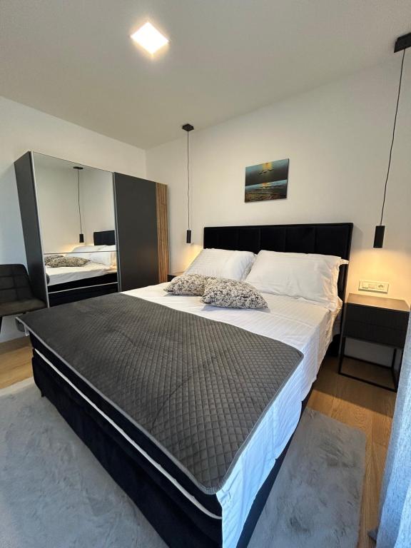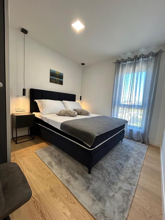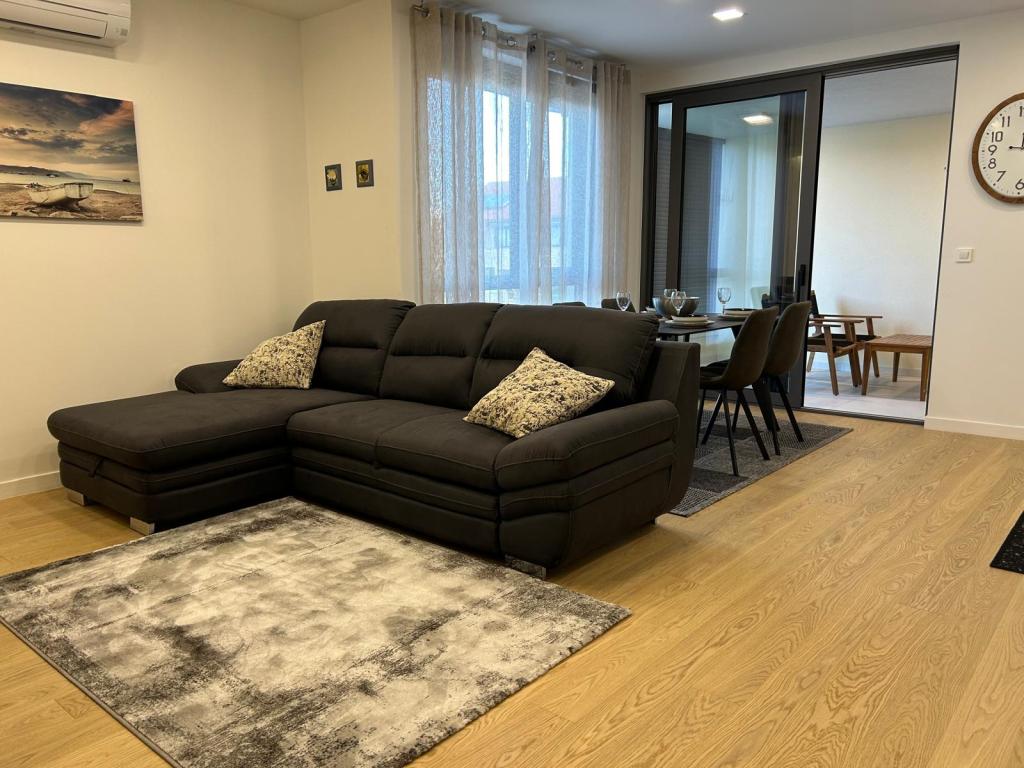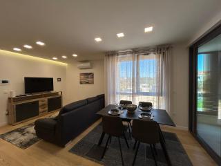Novo!!! Apartma je sestavljen iz: dveh spalnic z velikimi posteljami, prostorne dnevne sobe z jedilnico in kuhinjo, kopalnice in dostopa do lože... Moderno opremljen apartma v mirnem delu mesta, zavarovano parkirno mesto, blizu plaže, trgovin, restavracij, promenade, teniških igrišč, kavarne, otroškega igrišča, blizu marine - možnost najema čolna,...