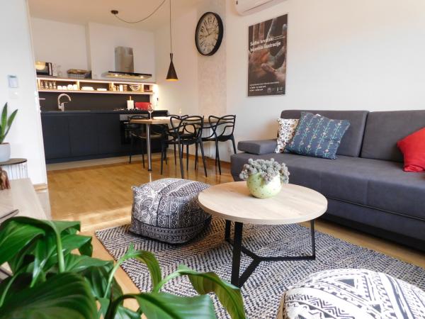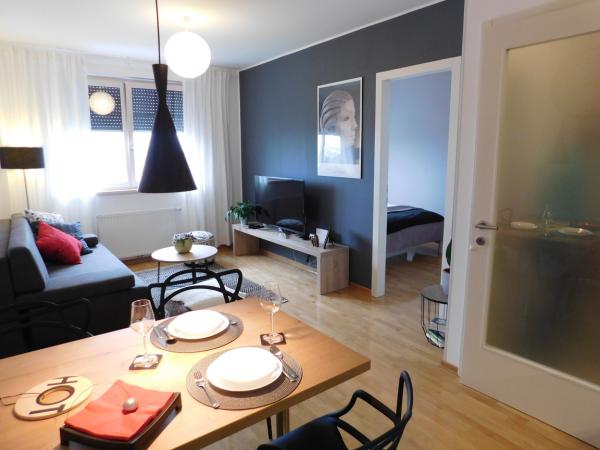 Nov, sodoben apartma se nahaja v 7. nadstropju nove, pravkar dokončane stavbe, 300 metrov od največje športne dvorane na Hrvaškem, Arene Zagreb. Apartma je popolnoma opremljen. Parkirno mesto je zavarovano na parkirišču ob stavbi (zavarovano z rampo). Stanovanje je opremljeno z digitalno ključavnico in omogoča popoln samostojni prihod in odhod z uporabo ene vstopne kode za stavbo (vneseno v interkom) in druge enkratne vstopne kode za stanovanje. Po tem vstopite v stanovanje s pametno kartico. Sestavljen je iz hodnika, dnevne sobe s kuhinjo, spalnice in kopalnice. Namenjen je za dve osebi, udobno in udobno pa lahko sprejme do tri osebe. V apartmaju vas bodo sprejeli kratki, preprosti napotki za pametne ključavnice in aparate (termostat, TV, LED osvetlitev v kuhinji, pomivalni stroj). Za vsa vprašanja je pomoč na voljo 24 ur.