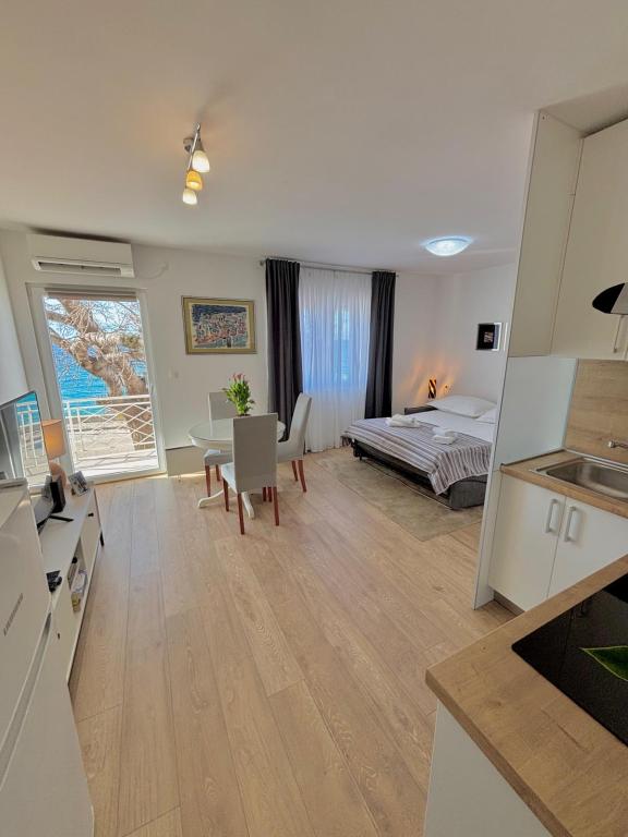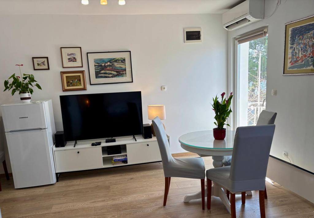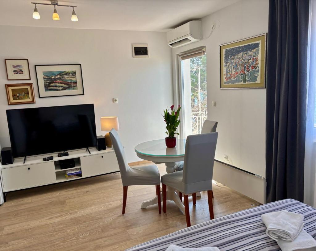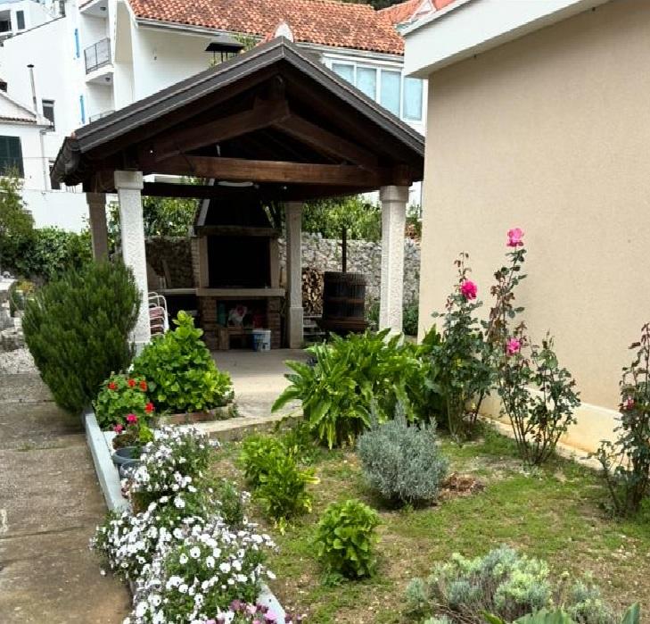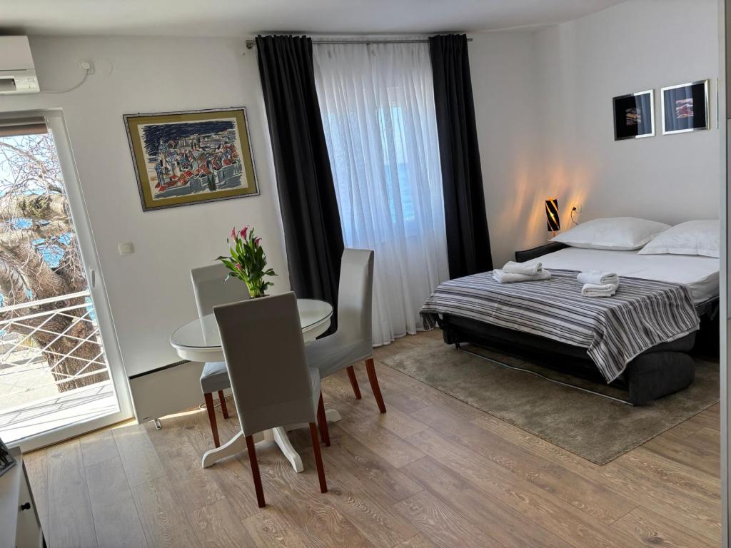 Studio apartma je popolnoma in moderno opremljen v prvem nadstropju družinske hiše, ki je oddaljena 30 m od morja in čudovite prodnate plaže s postopnim vhodom v morje. Pred hišo je parkirišče za avto, na dvorišču pa je paviljon z žarom in mizami za bivanje v senci. V bližini so trgovine, restavracije, slaščičarna, na vhodu v mesto pa je nakupovalni center Plodine.