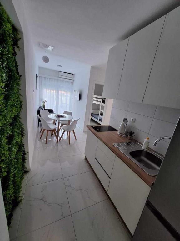 Ponujamo vam več moderno opremljenih apartmajev, idealnih za družine in skupine. Klimatska naprava, TV, brezplačen dostop do interneta Wi-Fi, oprema za peko na žaru in zasebno parkirišče. Oddaljenost od plaže je 200 metrov. Če bi vas zanimala naša ponudba ali načrtujete skupne počitnice z več družinami, nam prosim pošljite naslednje podatke: • število oseb/družinskih članov, • želeni datum bivanja, • posebne potrebe ali želje (če jih imate). Prihod v apartma je po 13.00, odhod pa ob 10.00. Na podlagi vaših podatkov bomo pripravili ustrezno in personalizirano ponudbo, idealno za vaše počitnice. Za več podrobnosti in rezervacije smo vam na voljo.