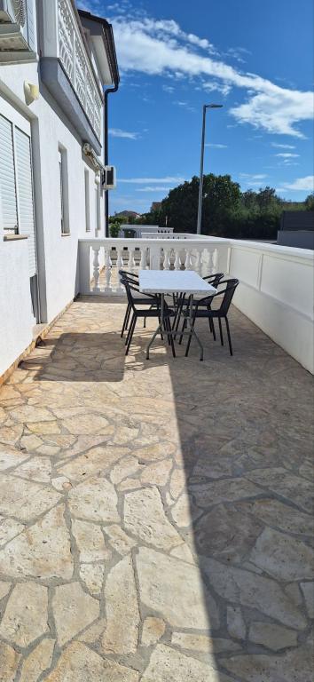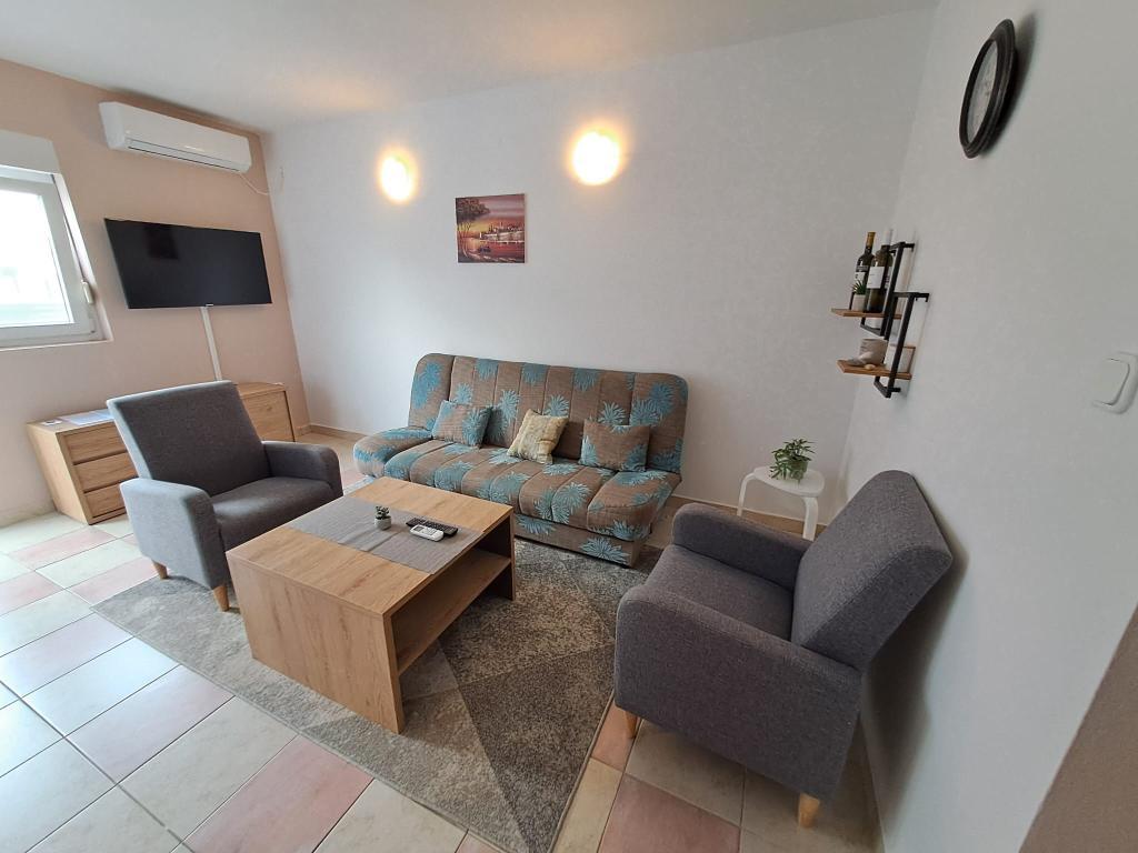Nahaja se v mirnem mestecu Zaton (Zadar). Oddaljenost od morja je približno 250 metrov, prav toliko do prve peščene plaže. Apartma ima površino 46 m2 in je popolnoma opremljen za prijeten družinski dopust. Sestavljen je iz dveh spalnic, dnevne sobe, kuhinje in kopalnice. Na voljo je ločena shramba. Stanovanje je v pritličju z dvema prostornima terasama in varovanim parkiriščem za dva avtomobila. Na voljo so Wi-fi internet, Max TV, klima in žar.