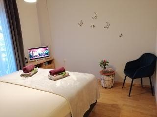 Čudovito mirno mesto, ravno pravšnje počitnice. Bili smo konec septembra, tako da je verjetno to razlog. Apartmaji se nahajajo na čudoviti lokaciji, obdani s pravim botaničnim dišečim vrtom. Morje je izjemno blizu, prav tako pomembni objekti kot so pekarna, restavracija, palačinkarnica in poligon. Stanovanje je okusno urejeno, prav tako celoten objekt. V živo je vse še lepše. Cene so kar ugodne. In kar je zelo pomembno, gostitelji so čudoviti ljudje, tako ustrežljivi in nevsiljivi. Gospa Renata je po vsem mnenju prava gospodinja. Apartmaje iz srca priporočam.