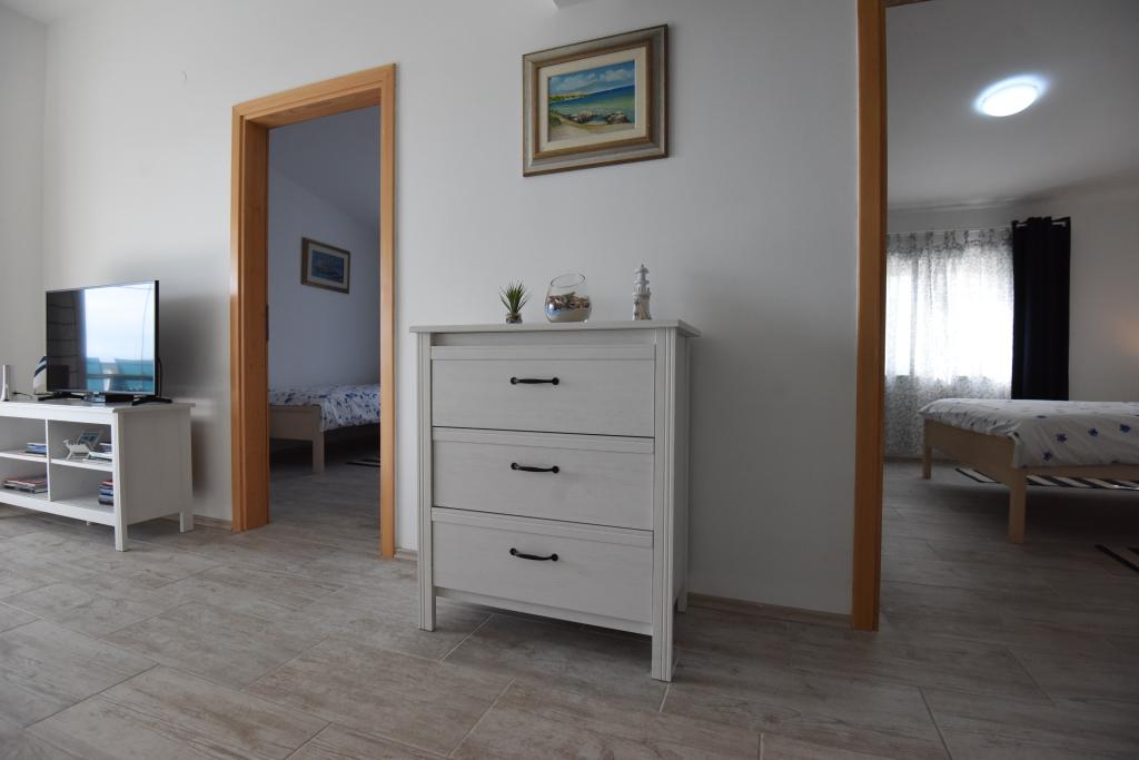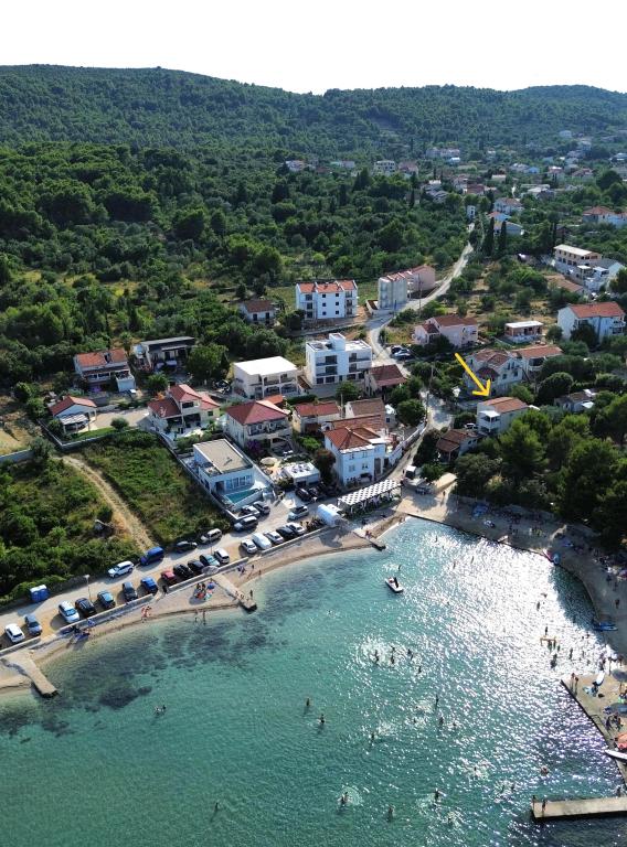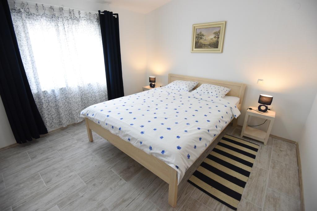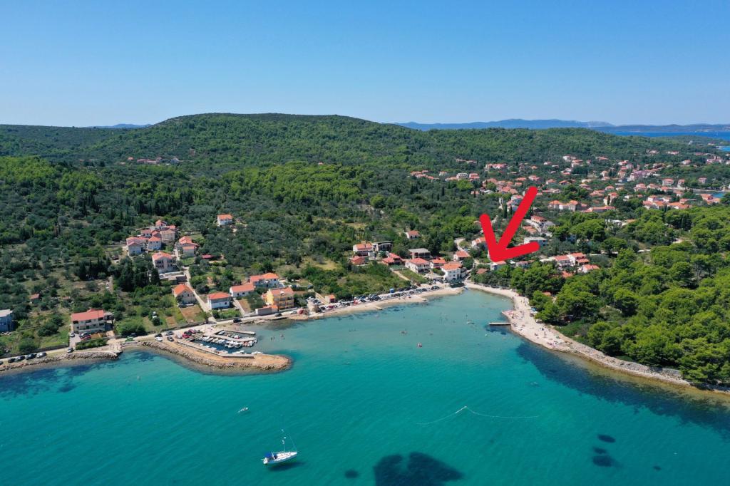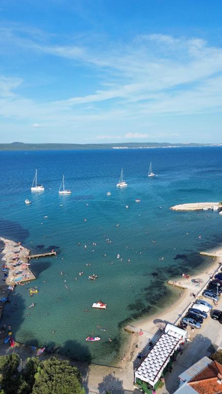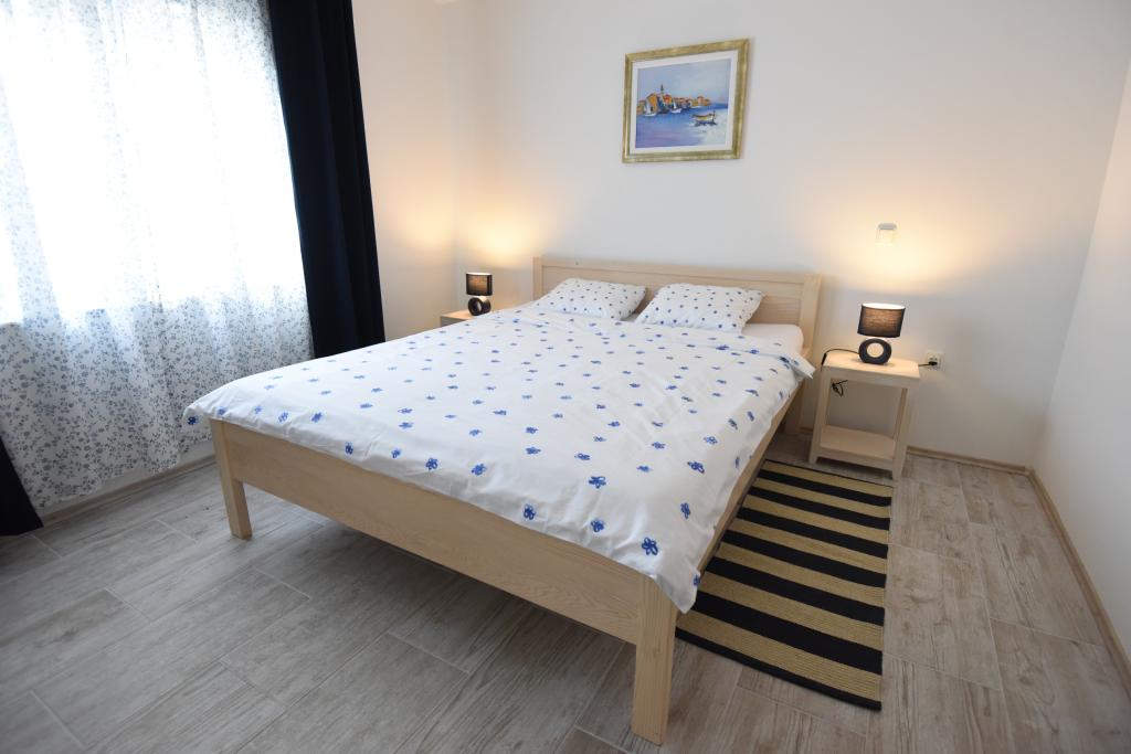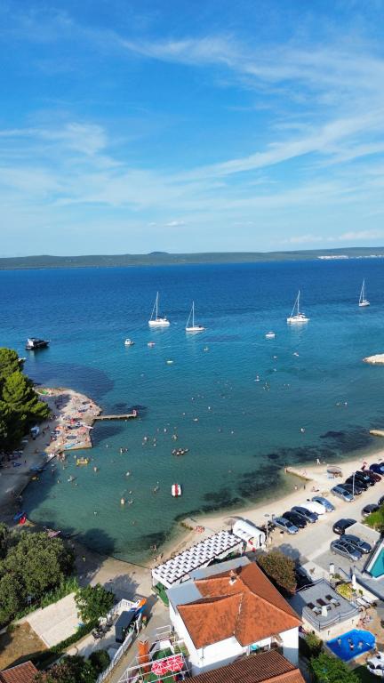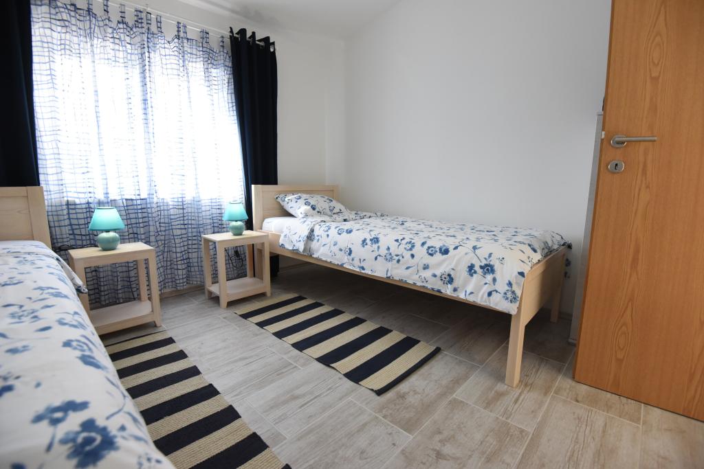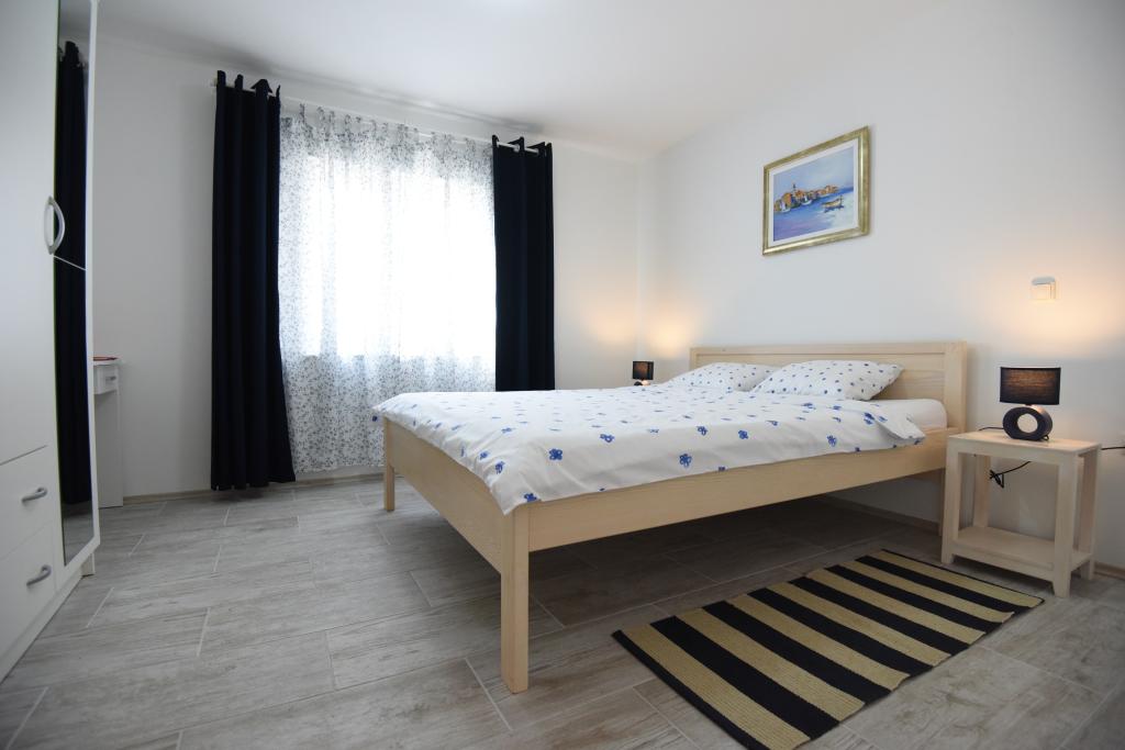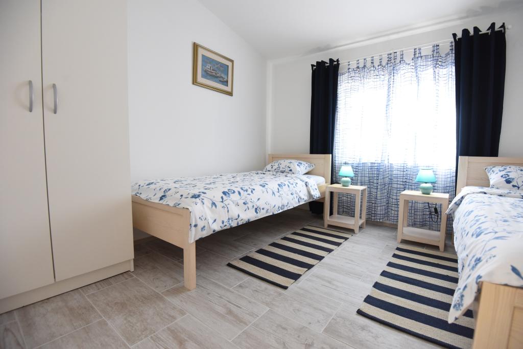 Prostorni, moderno opremljeni apartmaji s pogledom na morje, tik ob plaži Matlovac, so idealno bivanje za družine z otroki. Stavba z lastnim dovozom je sestavljena iz dveh enot, dveh apartmajev po 75 m2 (pritličje in prvo nadstropje) s pokritimi terasami. Apartmaji so opremljeni z vsemi udobji, potrebnimi za prijeten oddih, na voljo pa so tudi otroške posteljice in otroški stolčki. Parkiranje je zagotovljeno na dvorišču, prav tako pa je na voljo uporaba žara in zunanjega tuša. Plaža je tlakovana/prodnata, s peščenim dnom, zaščito pred soncem pa je enostavno najti v borovem gozdu. Ob plaži sta dva kavarna s hitro prehrano, z dodatnimi udobji: trampolinom za otroke in igriščem za odbojko na mivki.