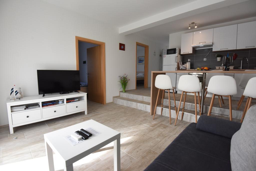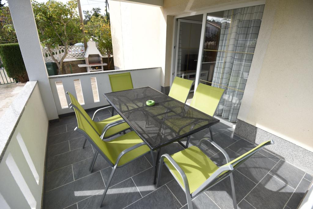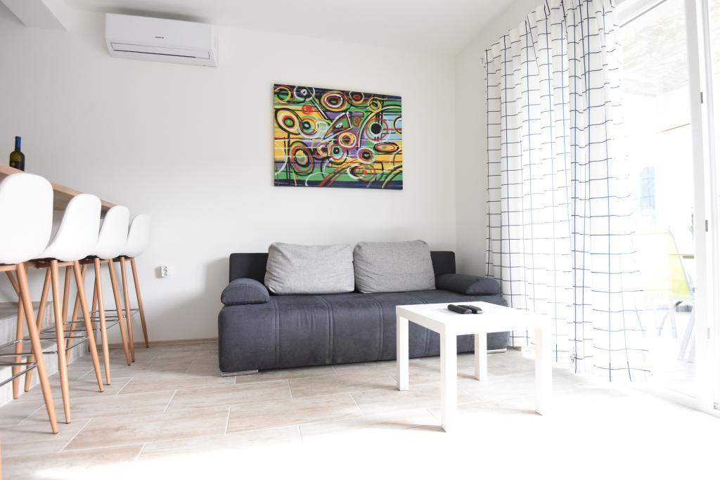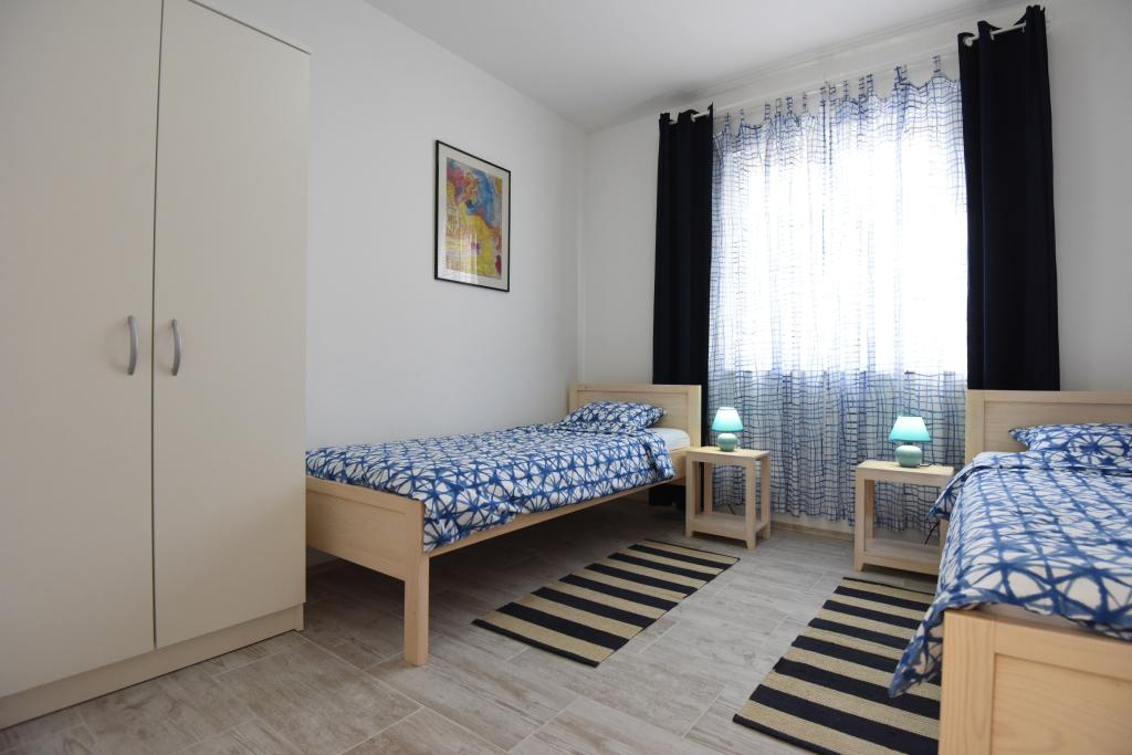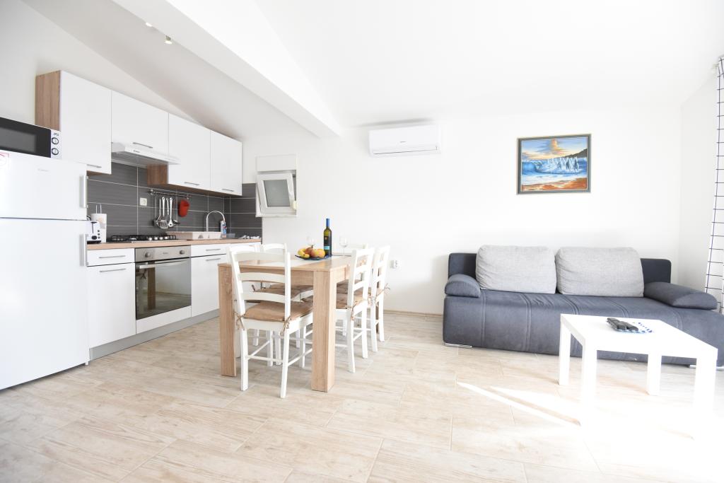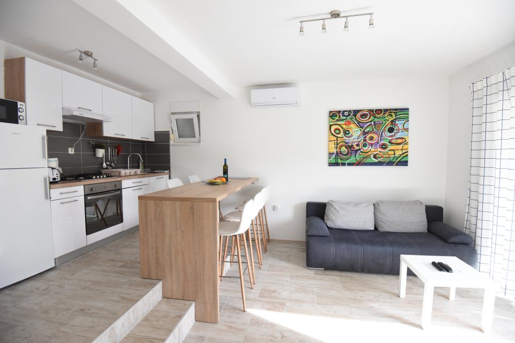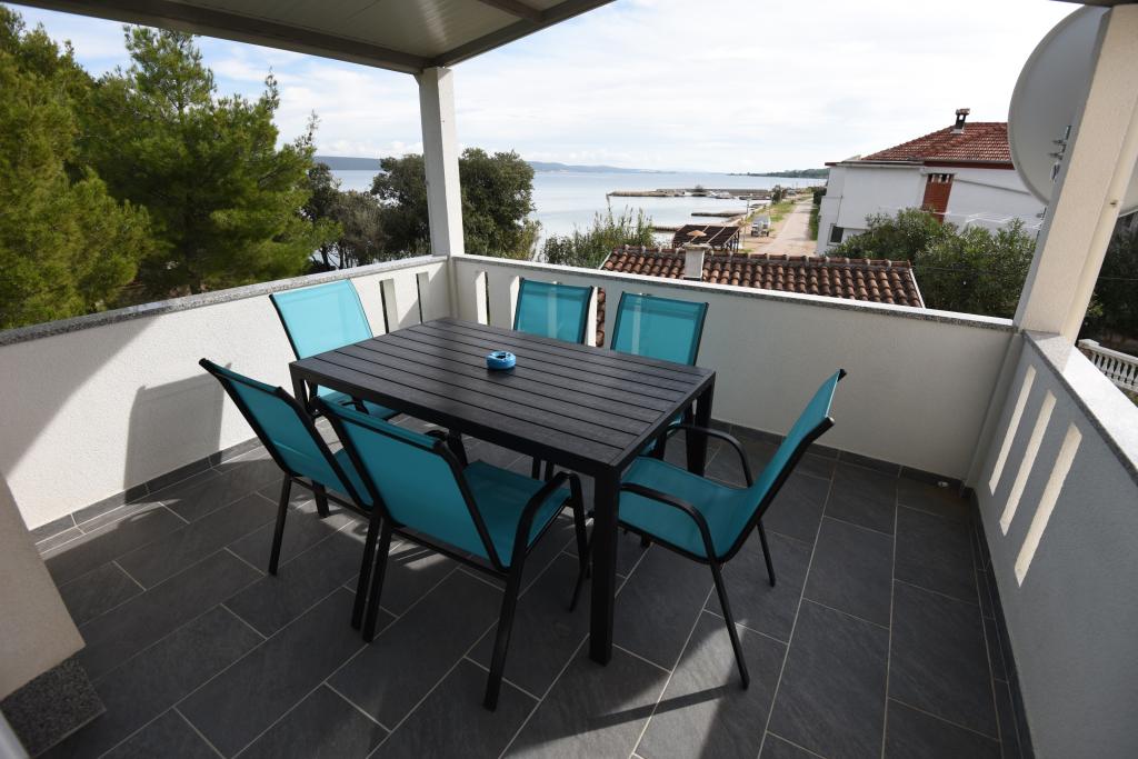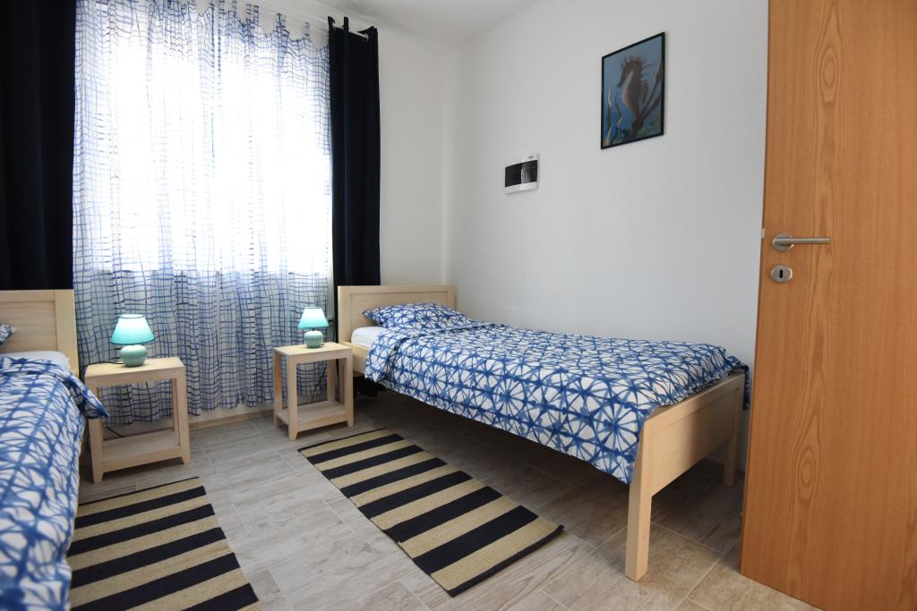 Prostorni, moderno opremljeni apartmaji s pogledom na morje, tik ob plaži Matlovac, so idealno bivanje za družine z otroki. Stavba z lastnim dovozom je sestavljena iz dveh enot, dveh apartmajev po 75 m2 (pritličje in prvo nadstropje) s pokritimi terasami. Apartmaji so opremljeni z vsemi udobji, potrebnimi za prijeten oddih, na voljo pa so tudi otroške posteljice in otroški stolčki. Parkiranje je zagotovljeno na dvorišču, prav tako pa je na voljo uporaba žara in zunanjega tuša. Plaža je tlakovana/prodnata, s peščenim dnom, zaščito pred soncem pa je enostavno najti v borovem gozdu. Ob plaži sta dva kavarna s hitro prehrano, z dodatnimi udobji: trampolinom za otroke in igriščem za odbojko na mivki.